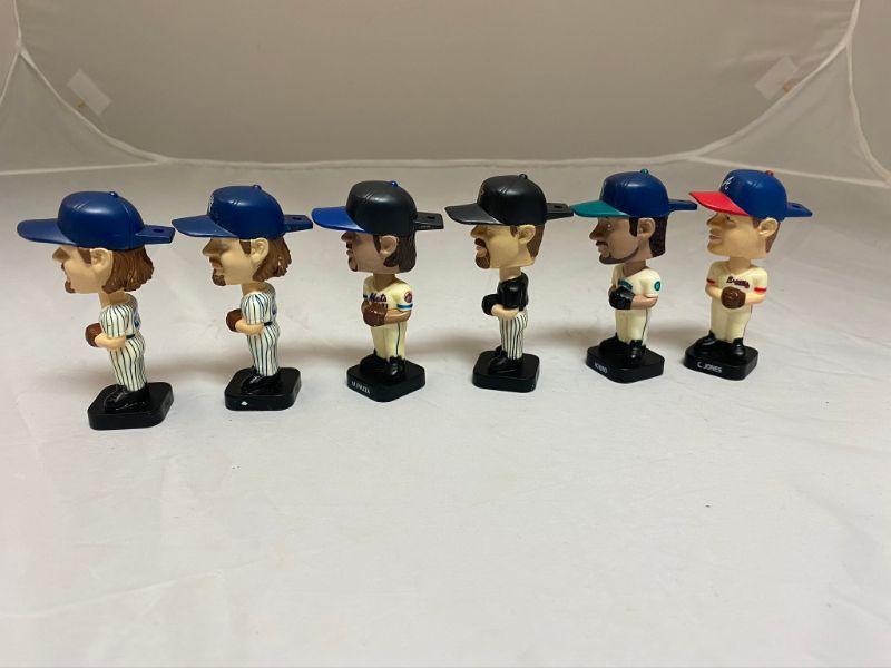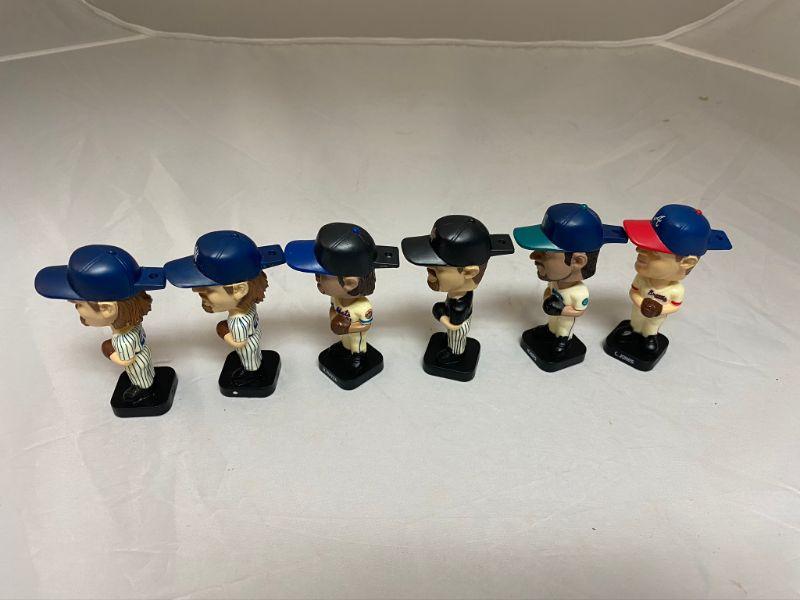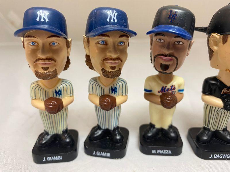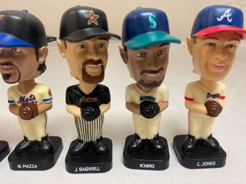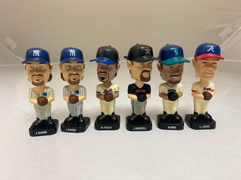 6 Baseball bobblehead figures from Fotoball. These were part of a Post Cereal Promo. 5 different players, one is a double. Players are J. Giambi (2), M. Piazza, J. Bagwell, Ichiro, and C. Jones. 3" tall. Made in China 2002.