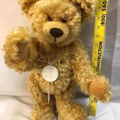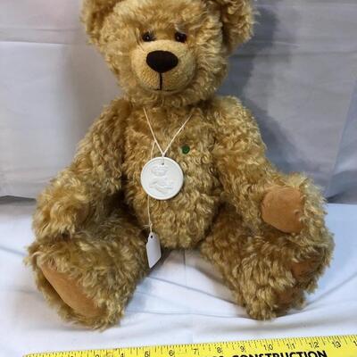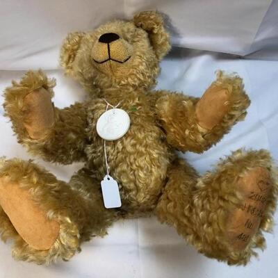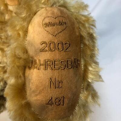 2002 Martin Germany limited edition teddy bear. Golden curly fur, jointed limbs. Foot is stitched with info, #481. Missing COA hang tag. 18" tall. Good condition.