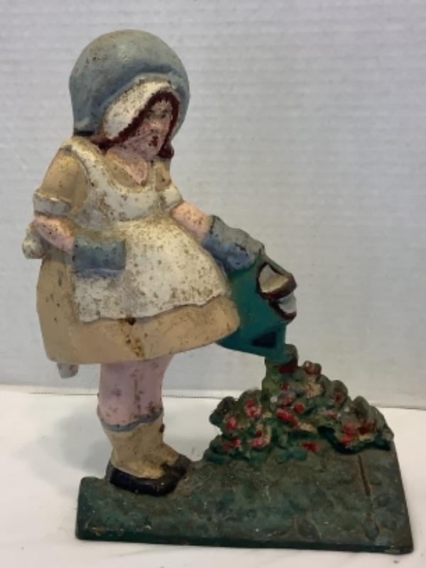 2004 Antique Cast Iron Doorstop of Girl Watering Flowers