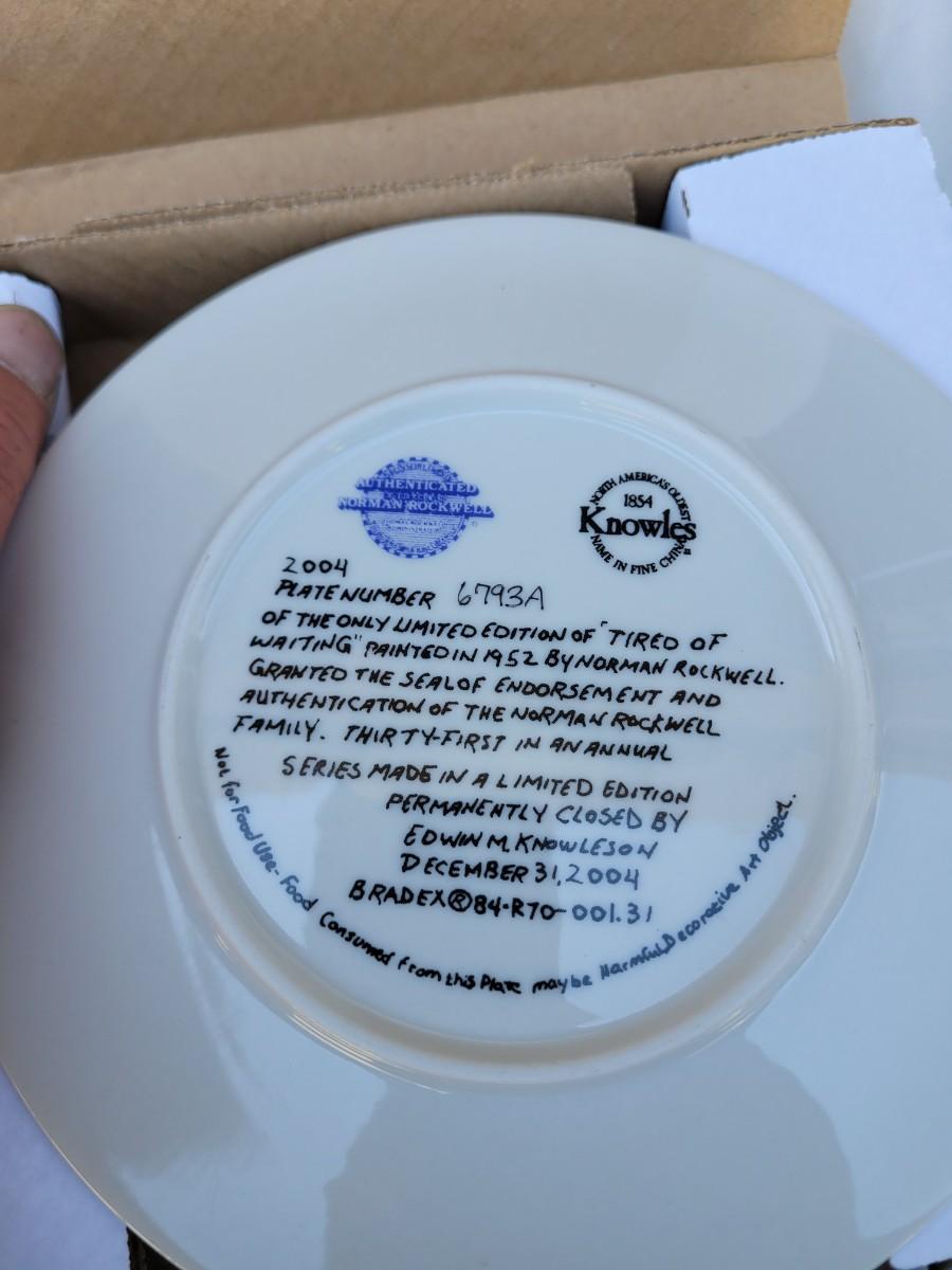 Artist & Manufacturer: It features a classic Norman Rockwell illustration and was produced by Knowles China, sold by The Bradford Exchange as part of their annual Christmas plate series.