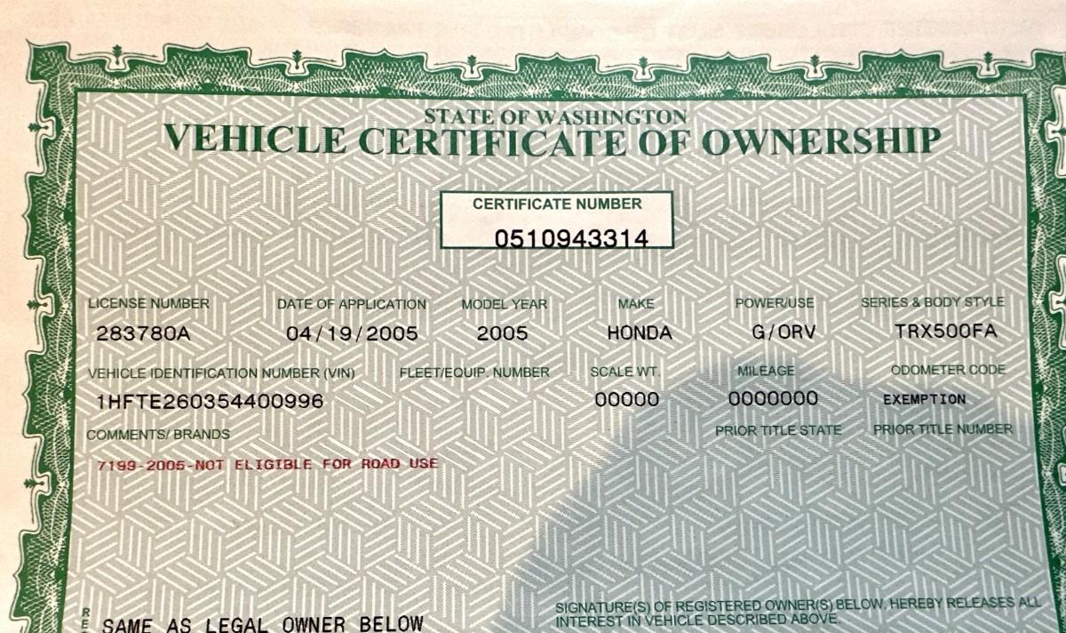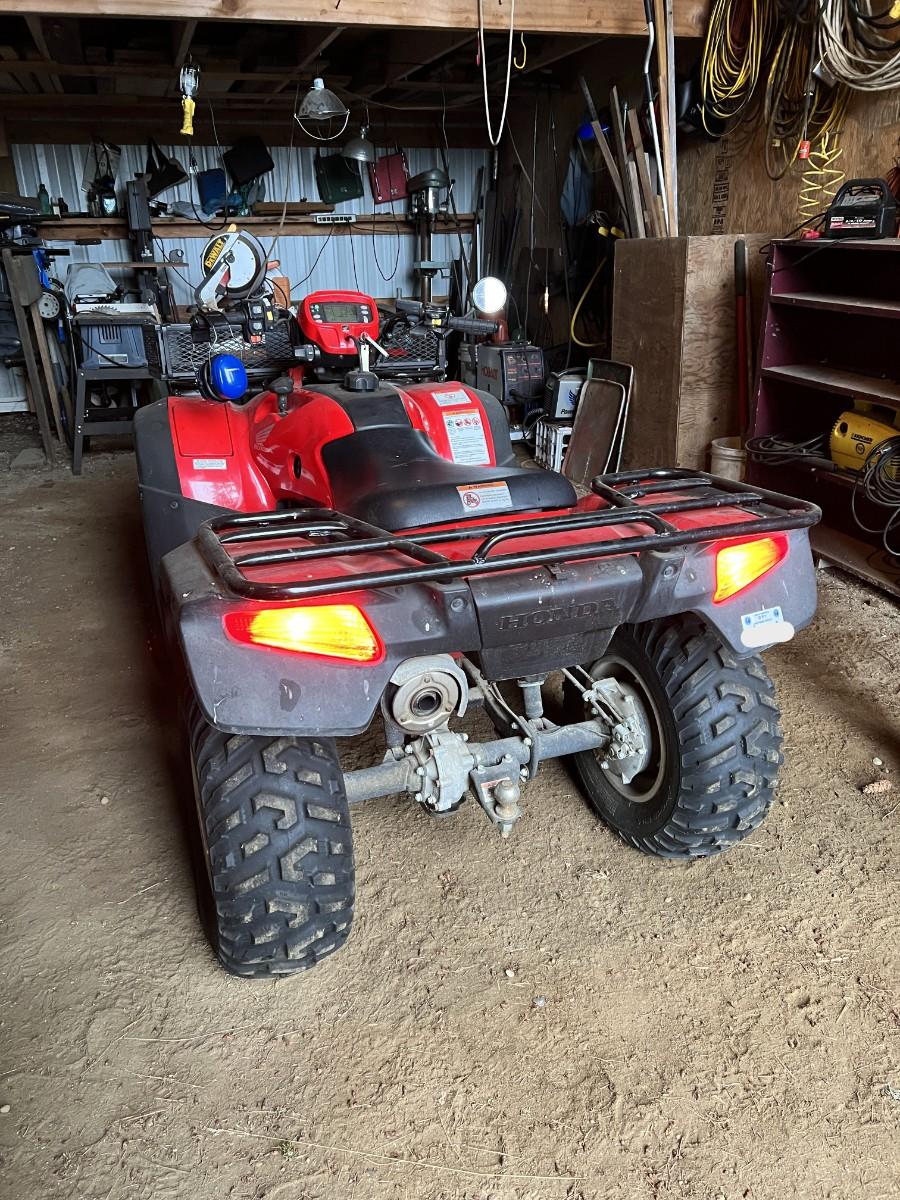 Great 2005 Honda TRX500FA All Terrain Vehicle Four Wheeler. From a Redmond estate, where it was stored in a covered out-building. Includes winch attachment (show in images). We have all the appropriate paperwork and documentation for this vehicle (image of Vehicle Certificate of Ownership is provided, and buyers are encouraged to search the vehicle history). Original manual was not found. Low hours! Started right up when we turned the key.