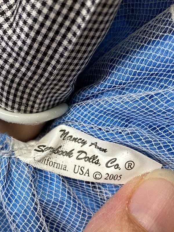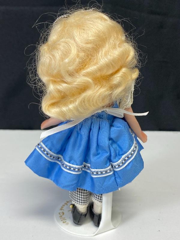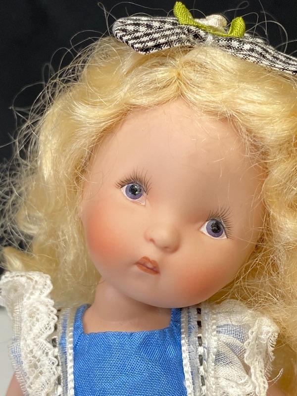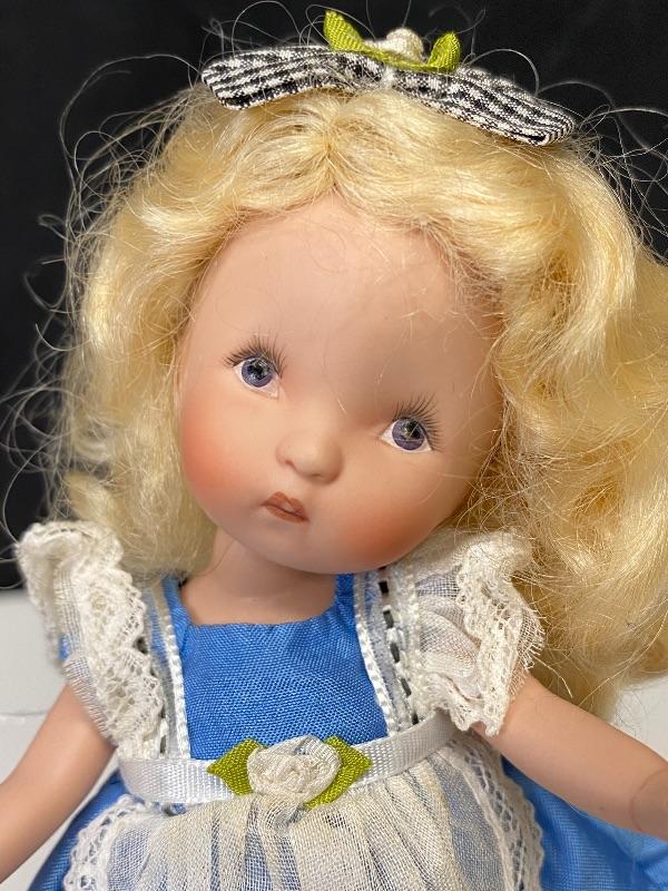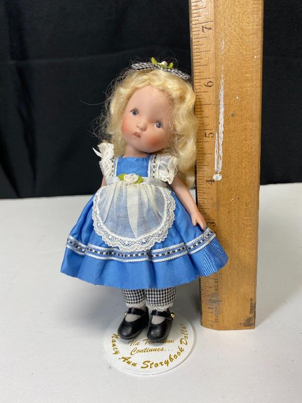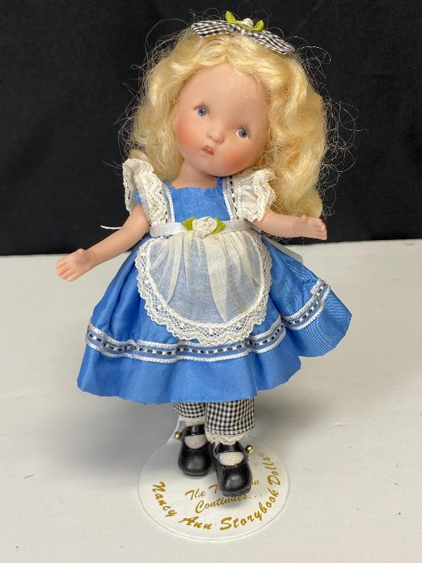 2005 Nancy Ann "Alice through the Looking Glass" Storybook Doll. Adorable blonde doll in a blue dress. Doll, dress, and stand are all marked. Neck is a little loose. Stands about 6". Do not have her COA.