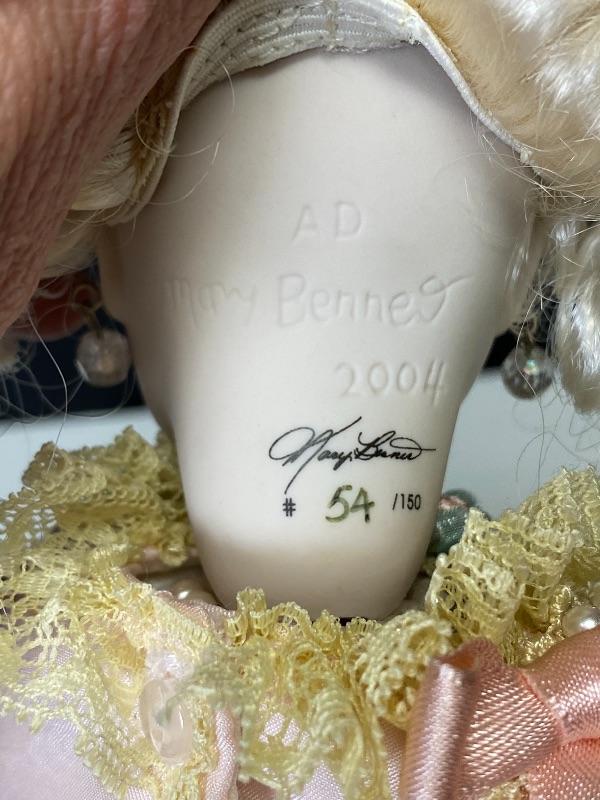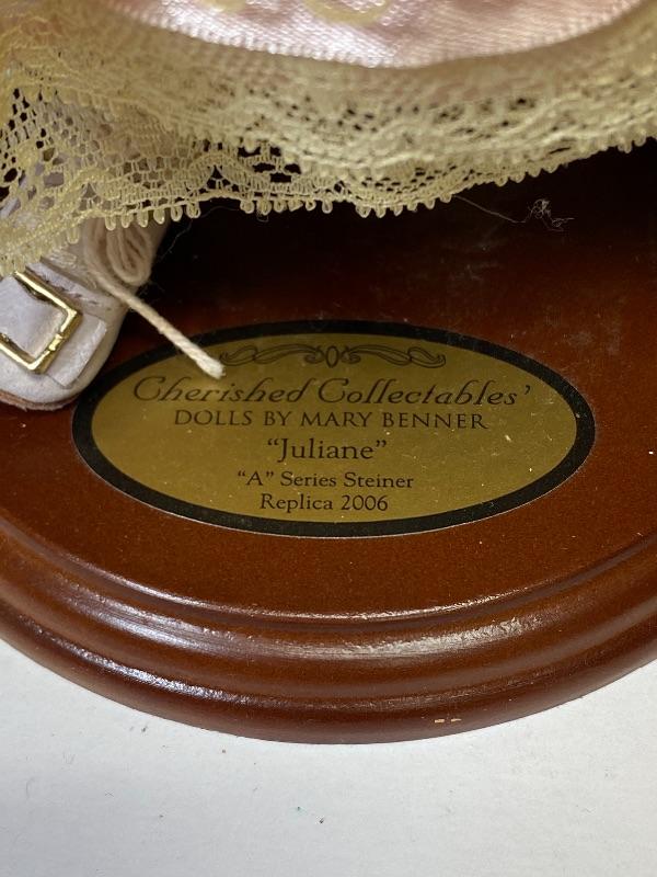"Juliane" by Mary Benner. Beautiful pale features with dark eyes. Pink Victorian style dress. Comes with a wood base stand. On the stand there is a label "Cherished Collectibles' Dolls by Mary Benner "Juliane" "A" Series Steiner Replica 2006" She is also signed and numbered. This doll is #54/150.