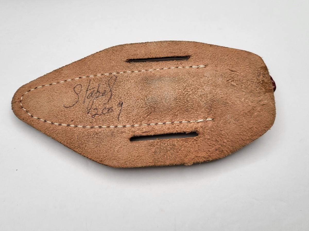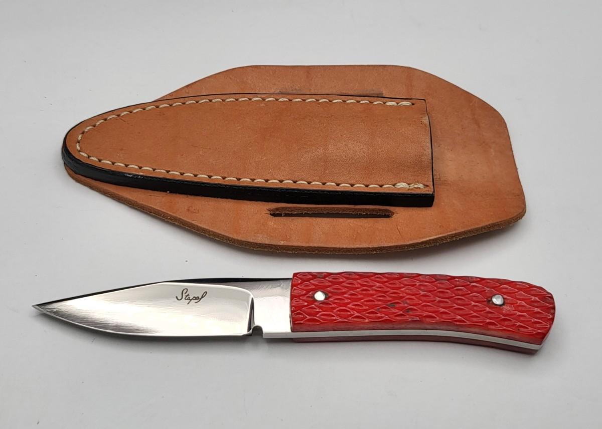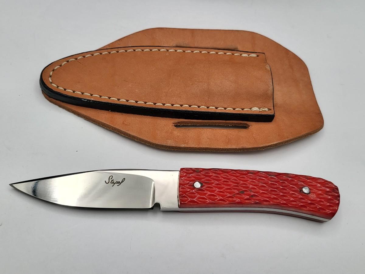 2009 Chuck Stapel, dyed red bone handle with 3.25" blade with custom tan leather sheath 7" long x 3.25" wide and hand signed on the back Stapel 2009.