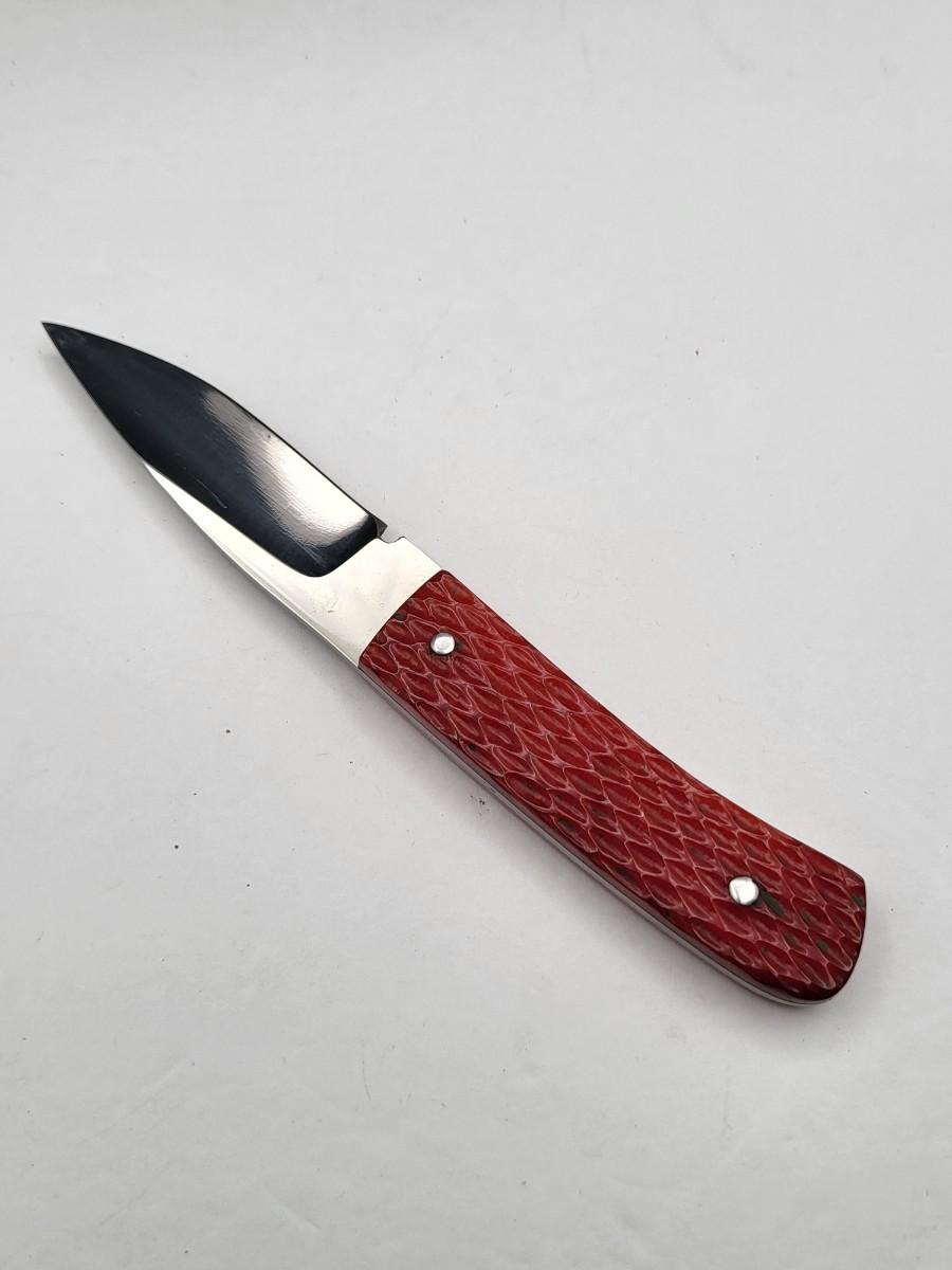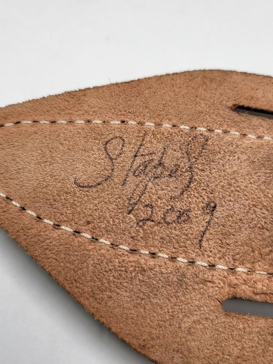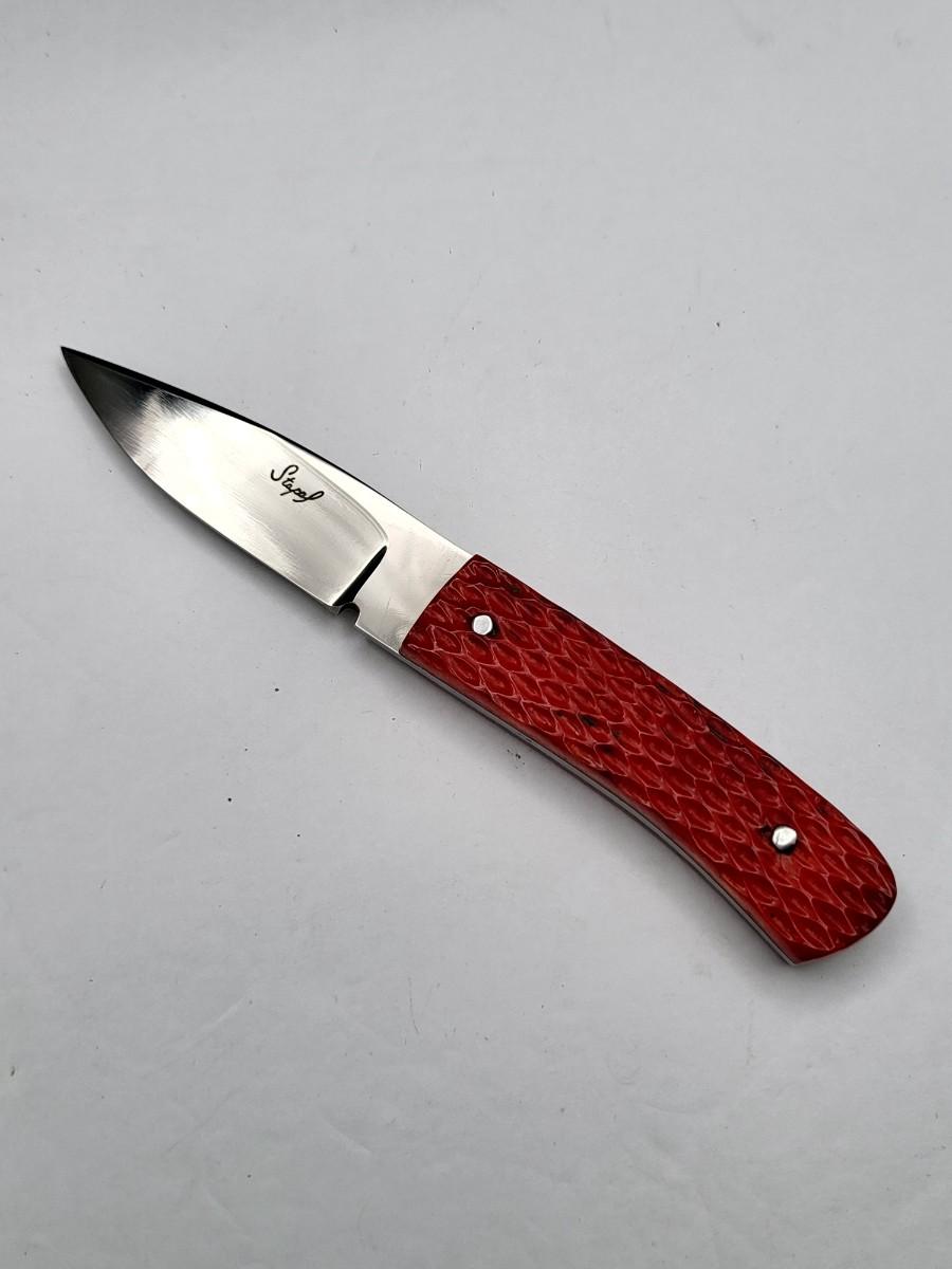 2009 Chuck Stapel, dyed red bone handle with 3.25" blade with custom tan leather sheath 7" long x 3.25" wide and hand signed on the back Stapel 2009.