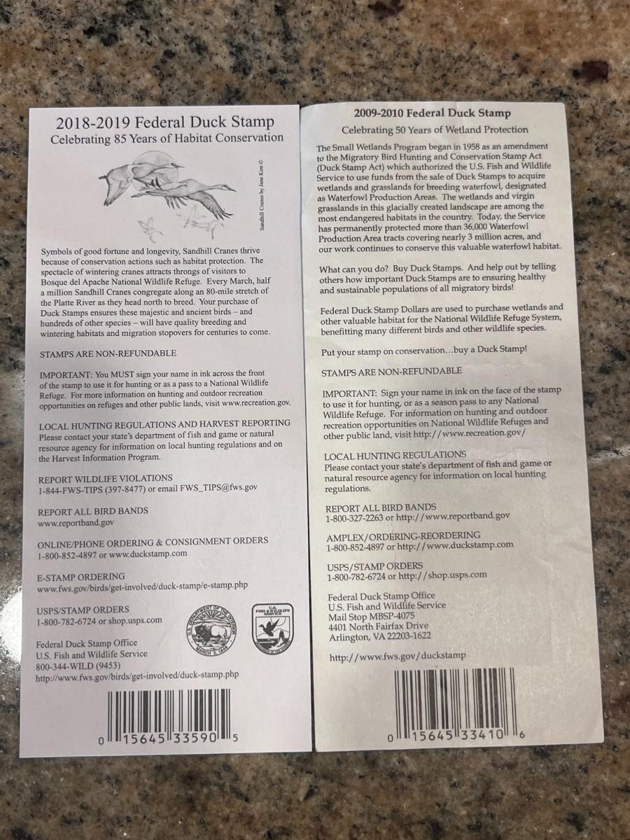 2009-2010 & 2018-2019 US FISH & WILDLIFE MIGRATORY BIRD HUNTING AND CONSERVATION STAMPS