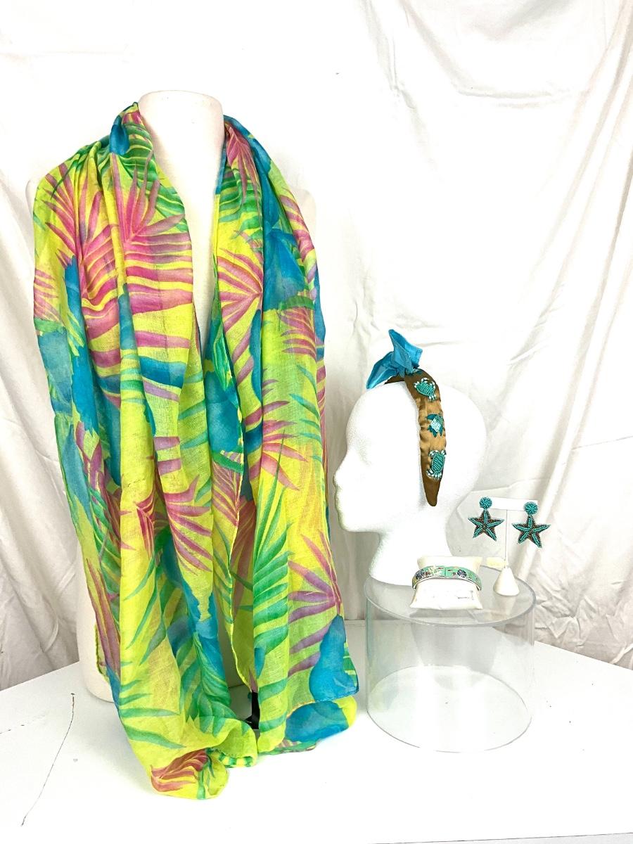 201 Pink, Aqua, Yellow Shawl/Wrap with Beaded Headband and Earrings
