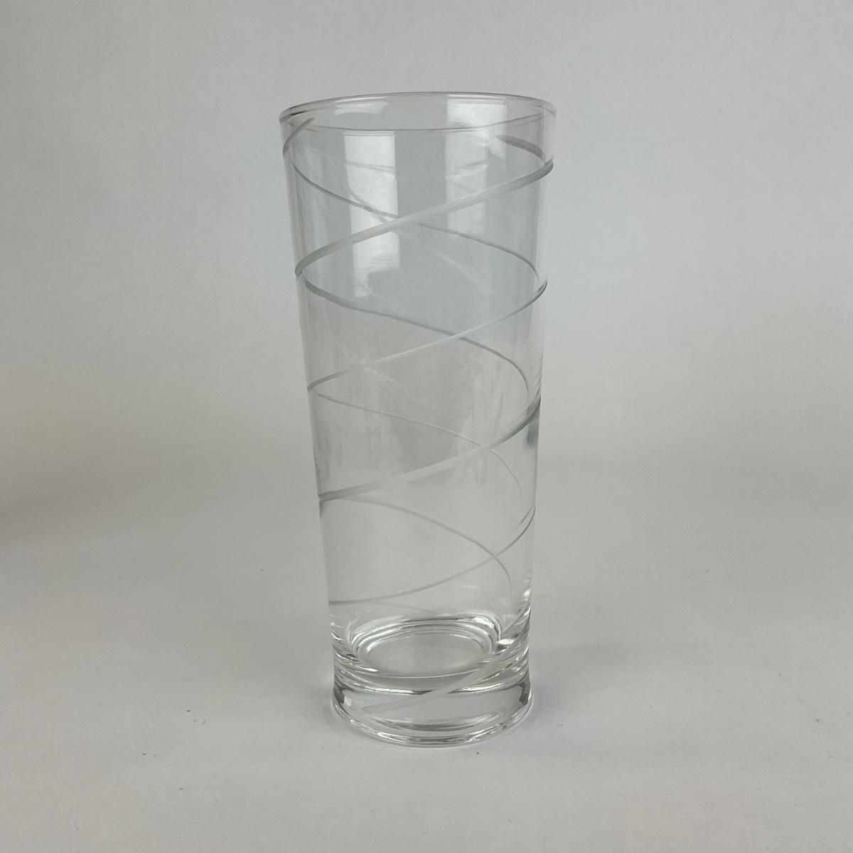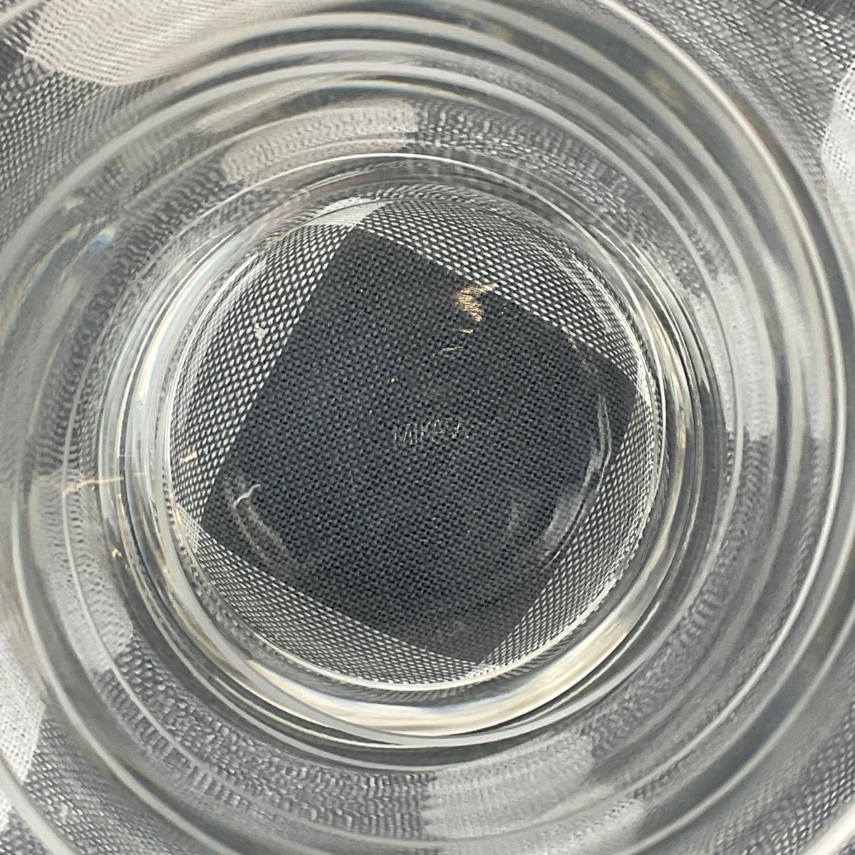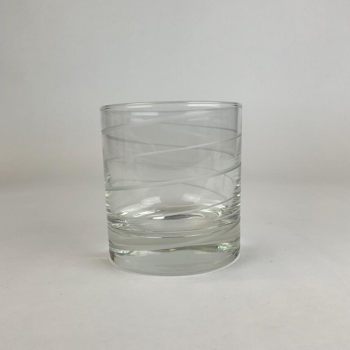 Glasses have a swirl line pattern, one glass is marked mikasa