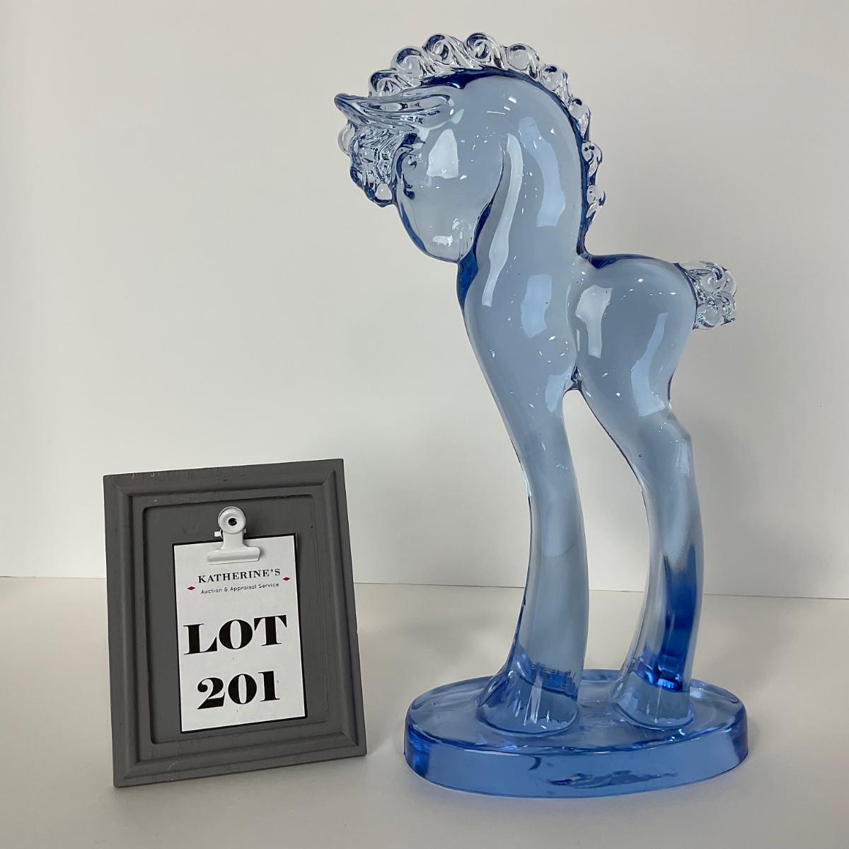 One Mosser ice blue Trojan horse figure. 6 inches wide by 11 1/2 inches tall. This piece does have some scuff and scrapes but is in otherwise good condition. Please see photos for details and condition. Any condition statement is given as a courtesy to a client, is an opinion, and should not be treated as a statement of fact. Reference to condition written, oral or within a condition report shall not be regarded as a full account of condition and may not include all defects, alterations, or restorations. Absence of a condition report does not imply a lot is flawless or lacking imperfections or damage. Katherine’s Auction & Appraisal Service shall have no responsibility for any error or omission. Returns shall not be accepted on the basis of condition. ::: Shipping is available on this lot. If you require shipping you must let us know at the close of the auction. We will coordinate with you after the item has been won. Shipping fees will include insurance up to or exceeding the value of all items being mailed. If you have any questions regarding this lot please contact the auctioneer either via this website, by direct email or by phone. PICK UP TIMES and other important information can be found in the TERMS and DESCRIPTION of the auction. Please take a look for pertinent information. Thanks!