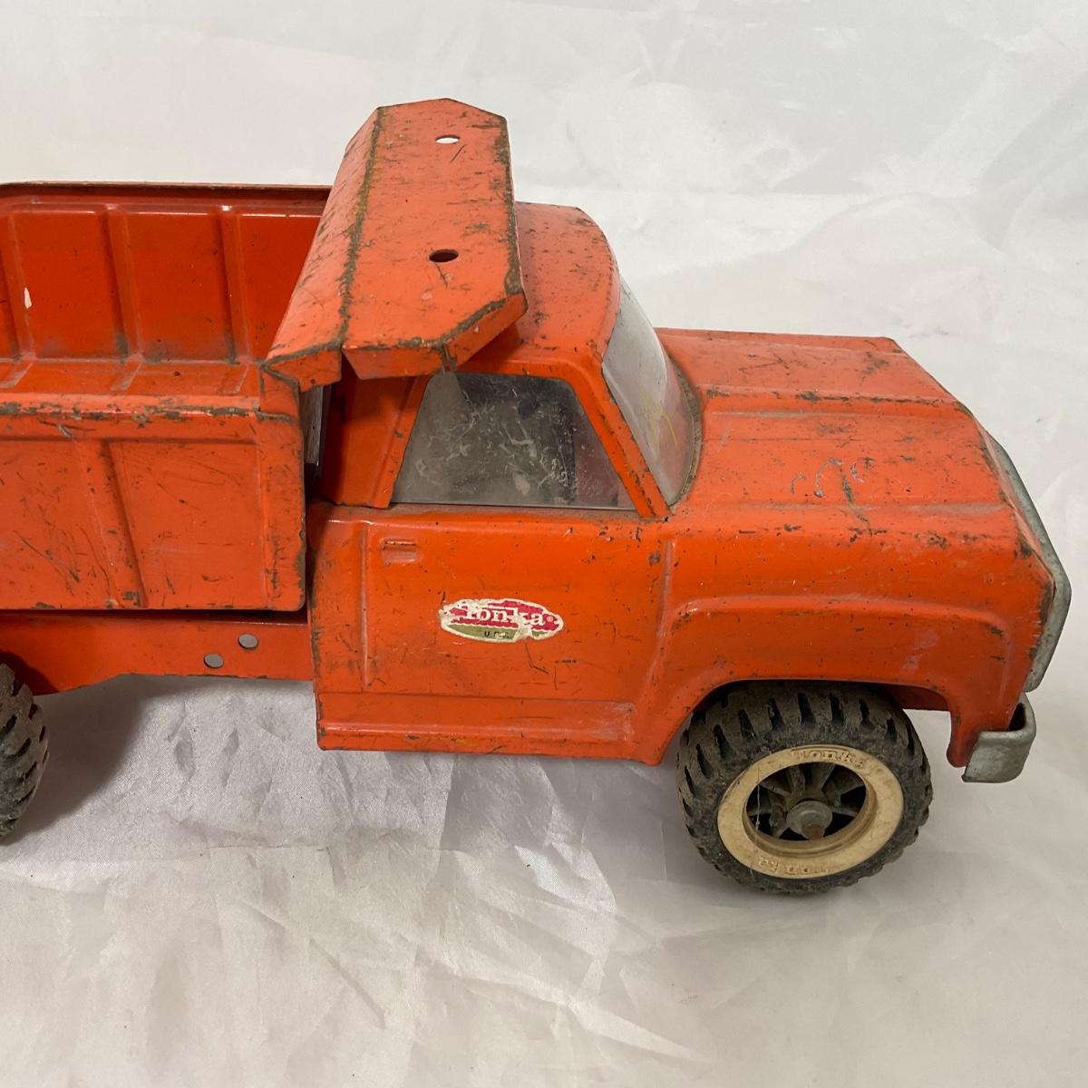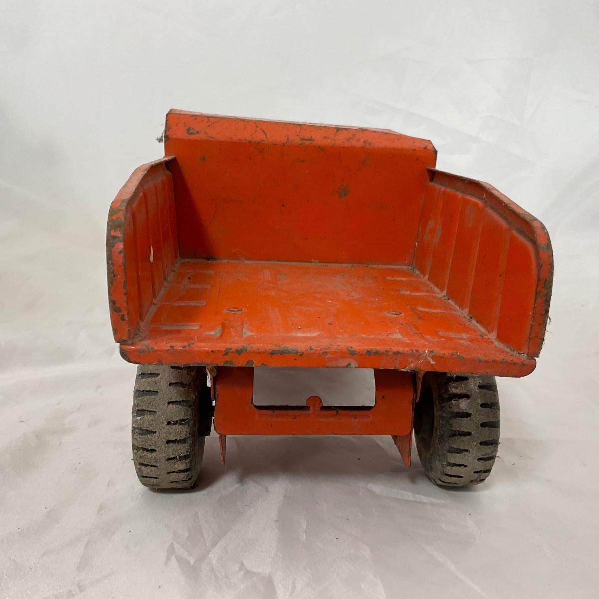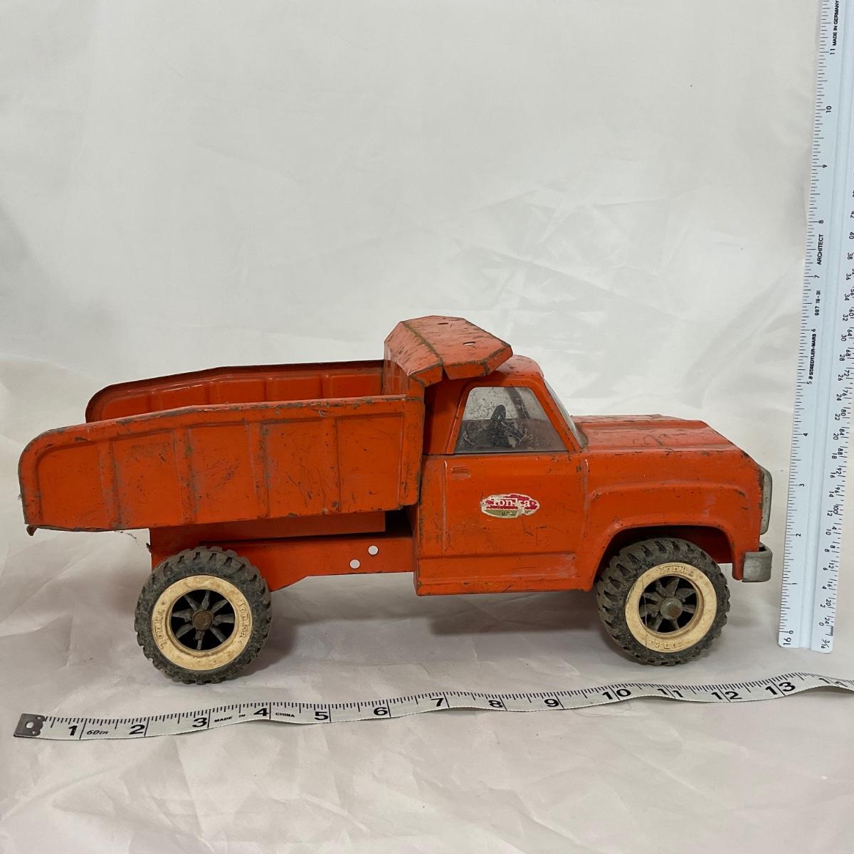 One vintage 1960’s orange Tonka dump truck in well loved condition. Please see photos for details and condition. ::: Shipping is available on this lot. If you require shipping you must let us know at the close of the auction. We will coordinate with you after the item has been won. Shipping fees will include insurance up to or exceeding the value of all items being mailed. If you have any questions regarding this lot please contact the auctioneer either via this website, by direct email or by phone. PICK UP TIMES and other important information can be found in the TERMS and DESCRIPTION of the auction. Please take a look for pertinent information. Thanks!