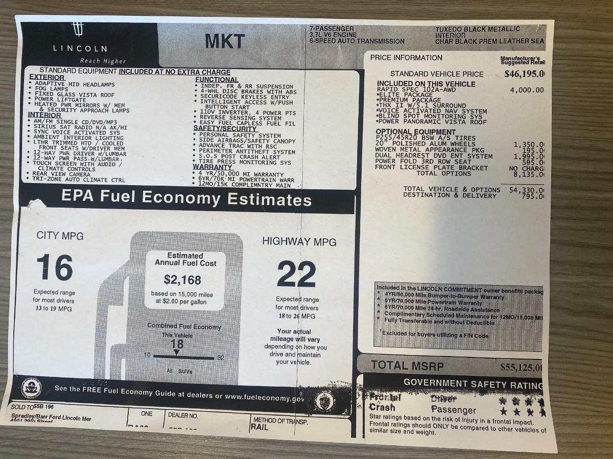 This Lincoln MKT is a rare find! The only reason this auto is for sale is because the owners are downsizing and planning to travel frequently in their motorhome. It has approximately 116,000 miles. The owners purchased it off the showroom floor and have been the only owners. Garaged except when on the road, recommended service by the book and pampered. The original sticker is attached for your review. Do not miss the opportunity to buy this rare jewel.