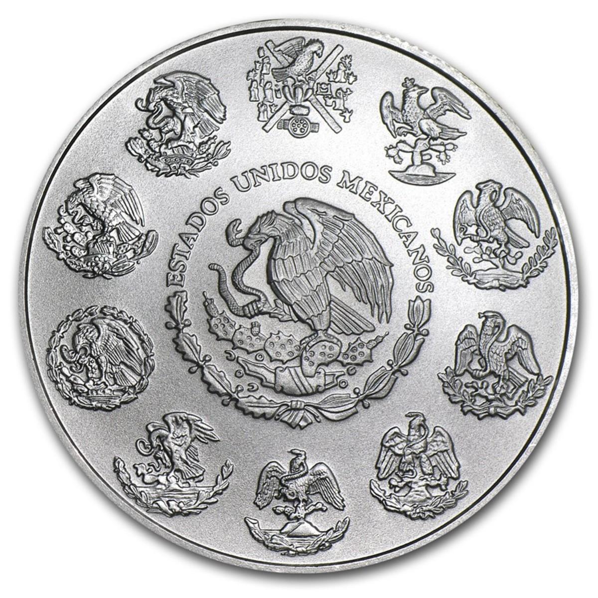 Obverse: Mexican national seal with an eagle sitting atop a cactus surrounded by symbols representing Mexico’s 10 provinces.