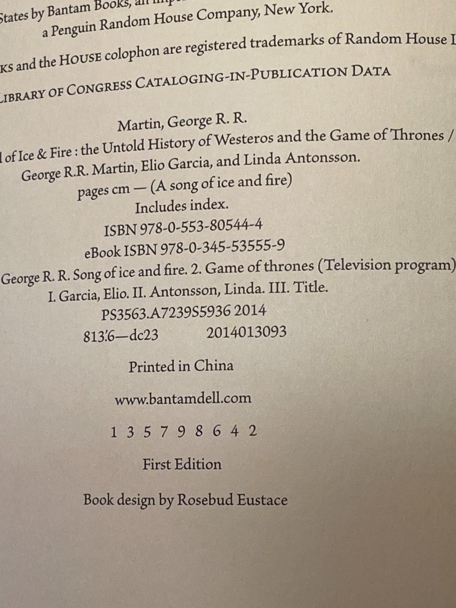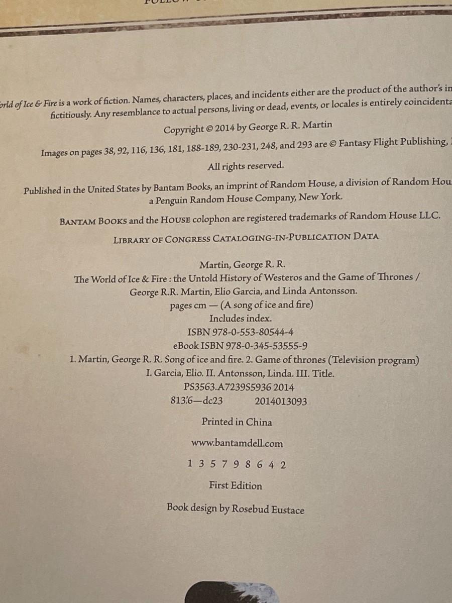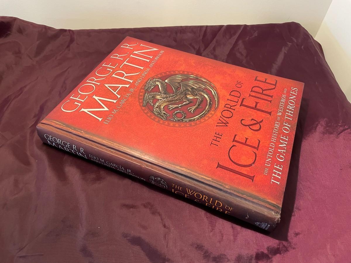 The actual title of this book is The World of Ice and Fire the Untold History of Westeros and The Game of Thrones. It is marked as a first edition and has a padded cover. It is about 12 inches by 9 inches by 1.25 inches (it is large) and in excellent condition.