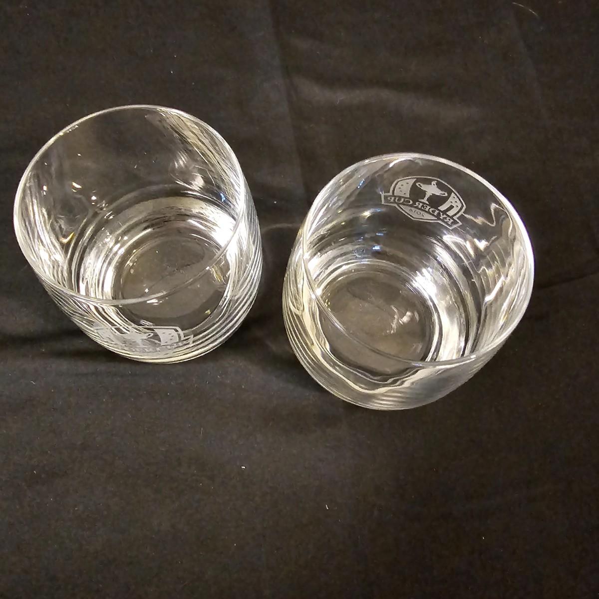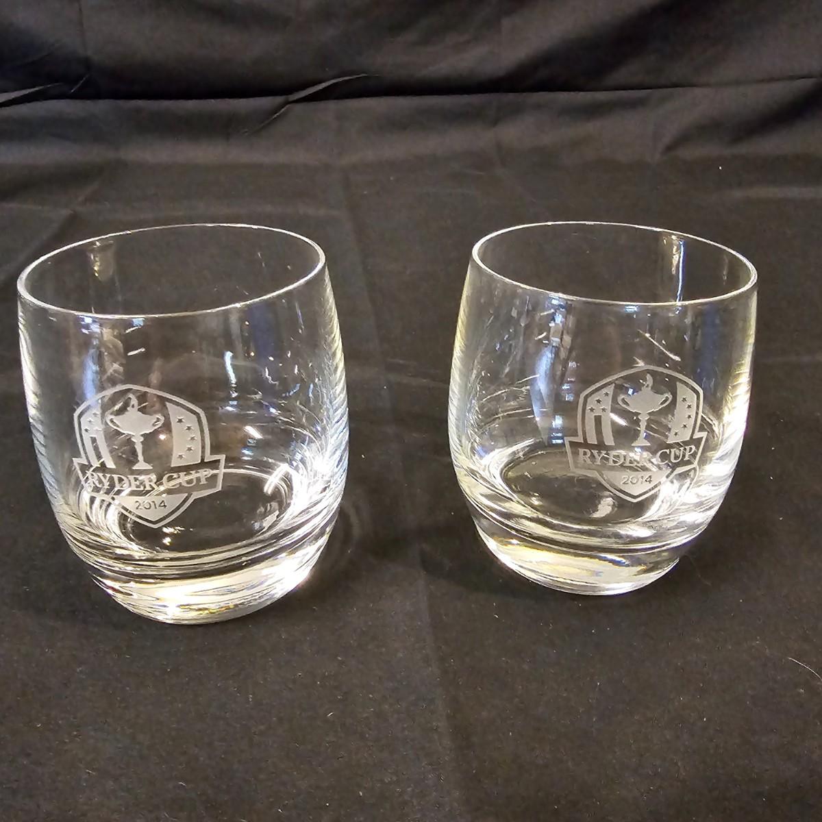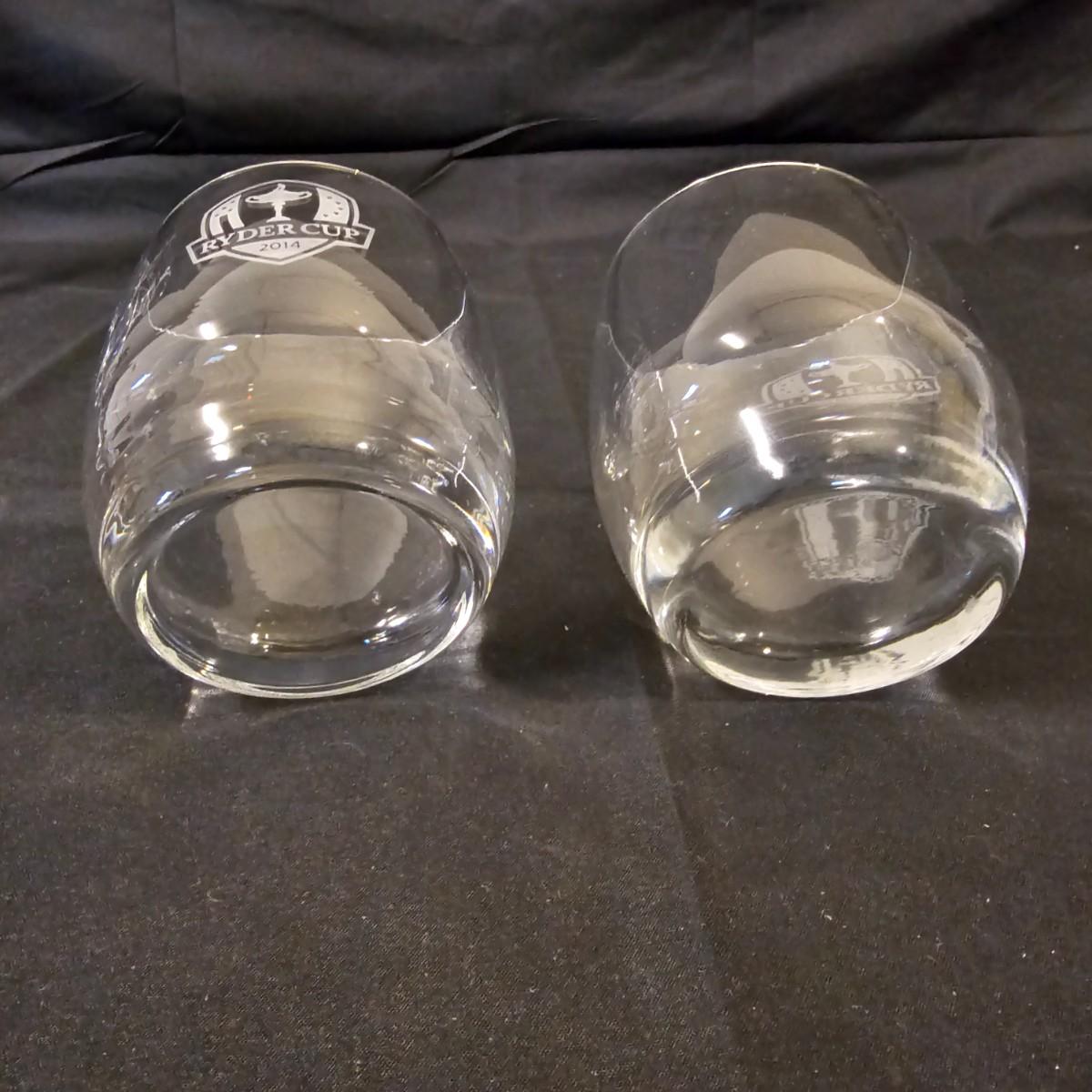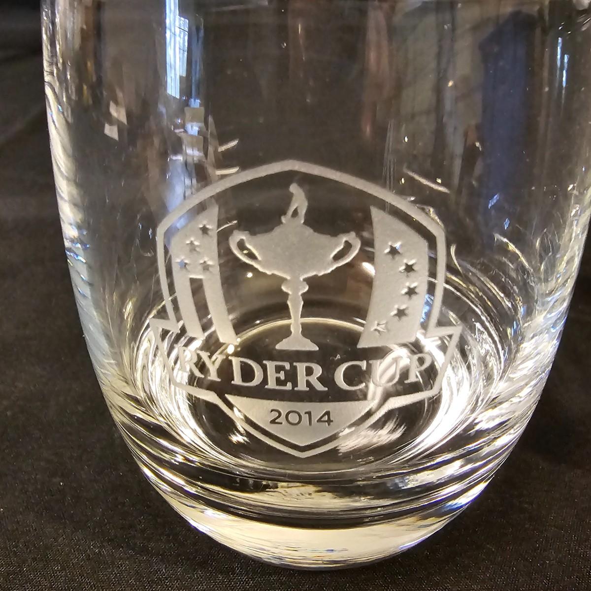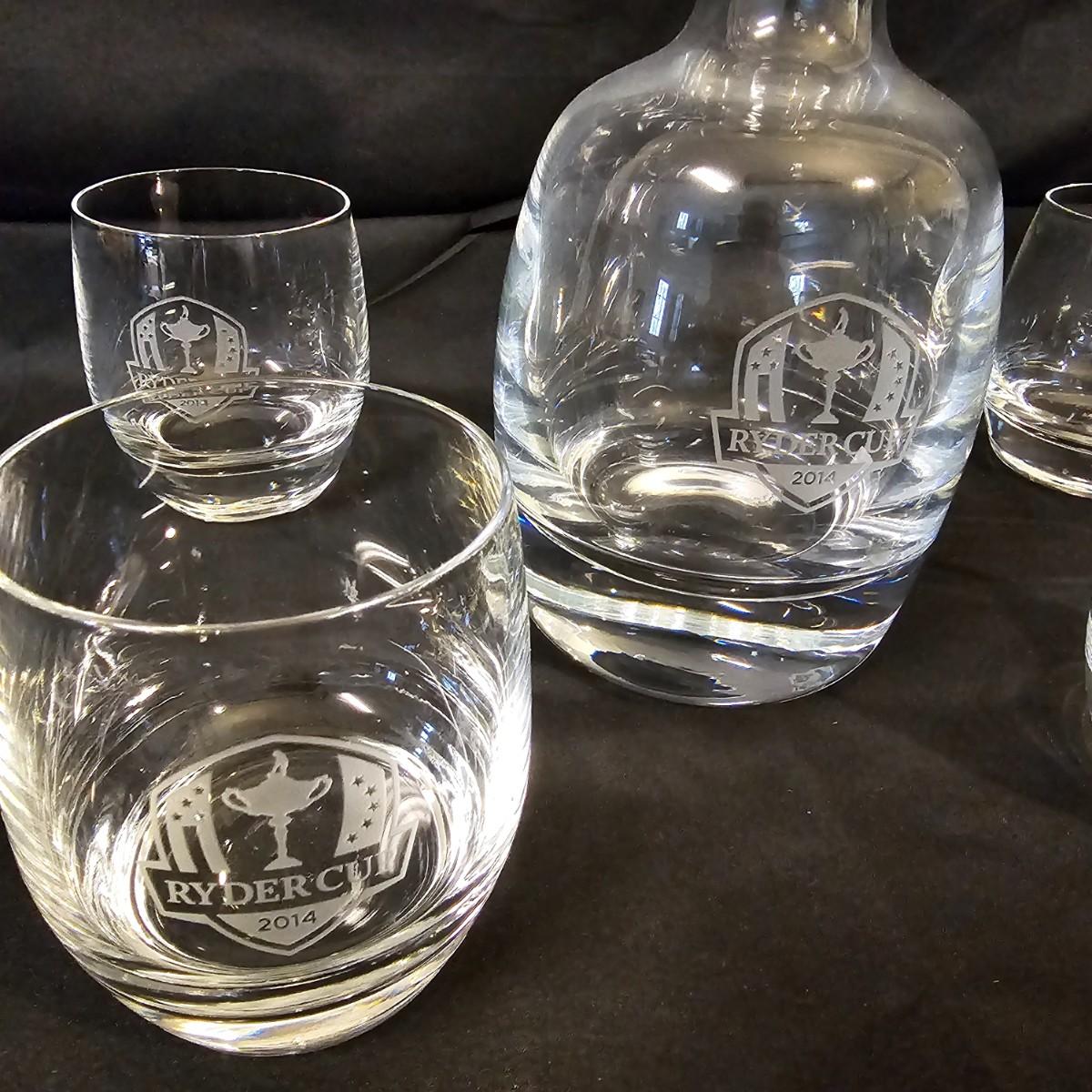 Clear glass set of four glasses and a decanter commemorating the 2014 Ryder Cup golf tournament. Label states decanter is from Sterling Cut Glass. Each piece is etched with the year and a symbolic logo. Decanter measures 4.5"D x 10.5"H, glasses are 3"D x 4"H. See photos for details. Shipping available.