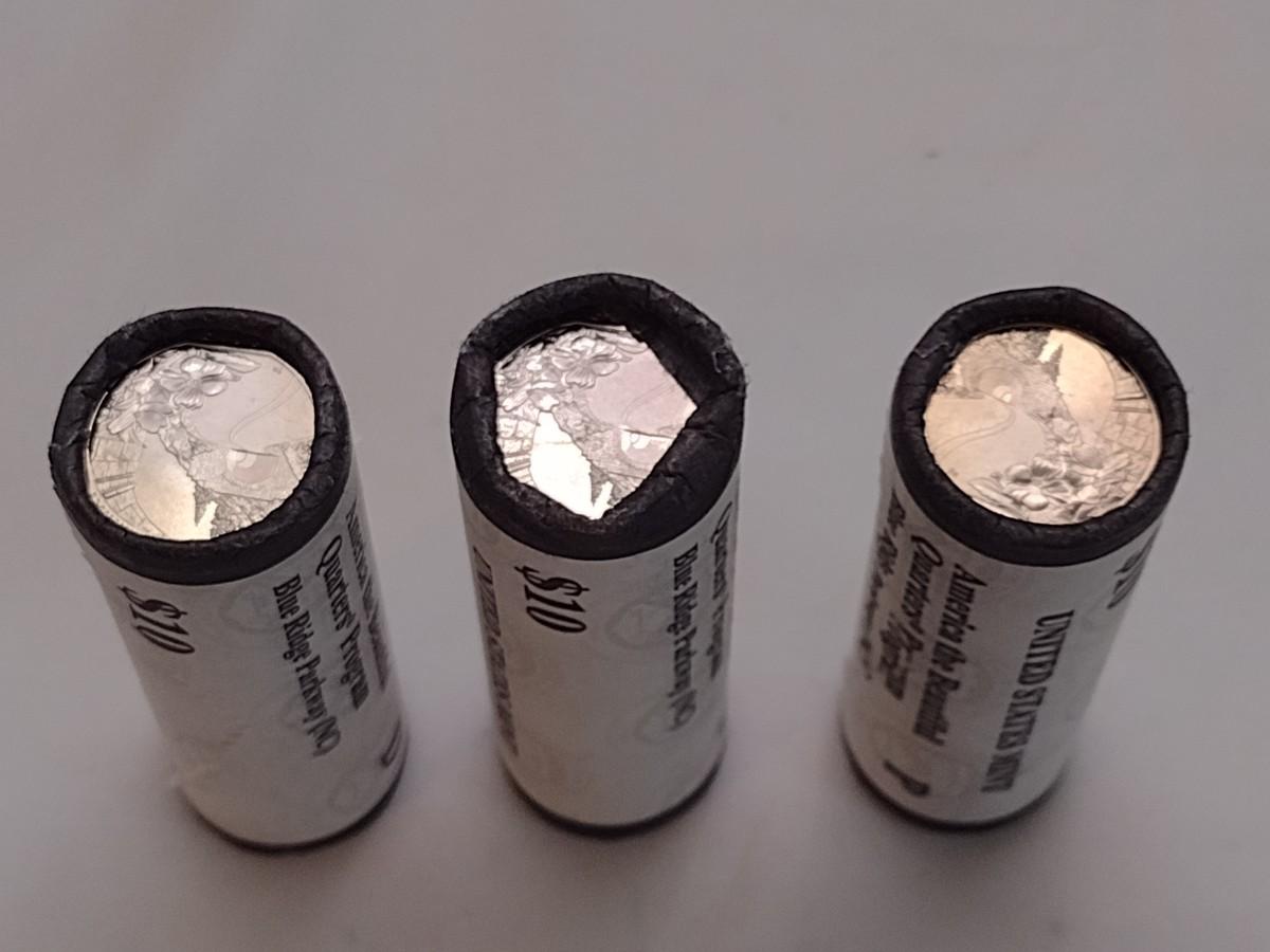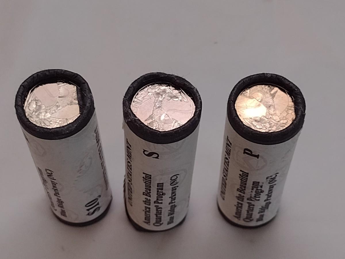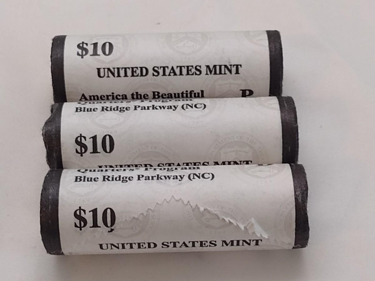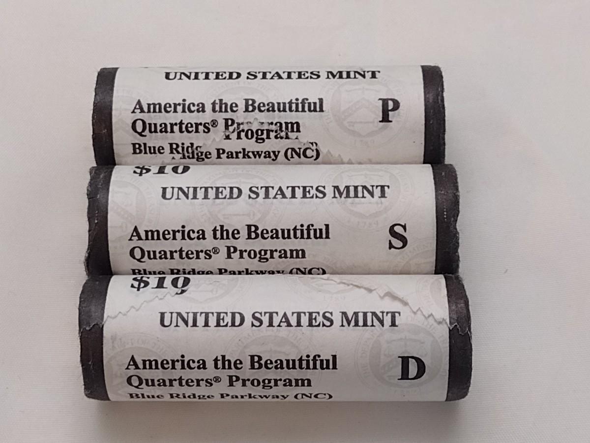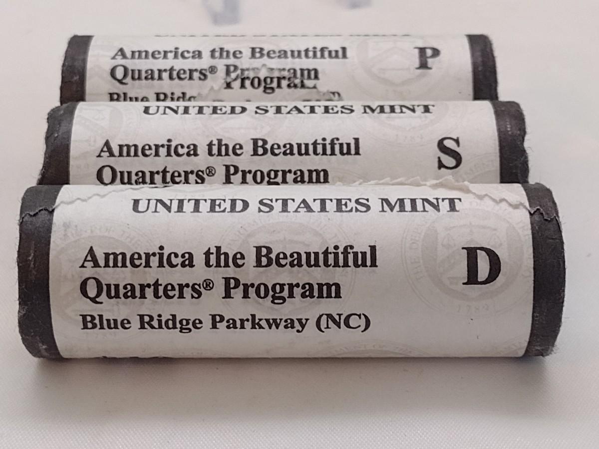 2015 P, S, D U.S. Mint Uncirculated America the Beautiful Blue Ridge Parkway, NC Three $10 Rolls of Quarters (#114)