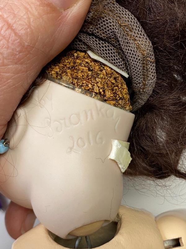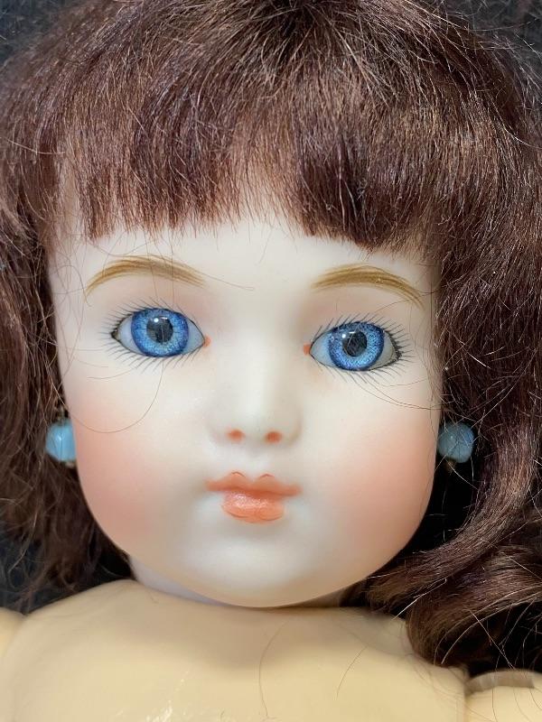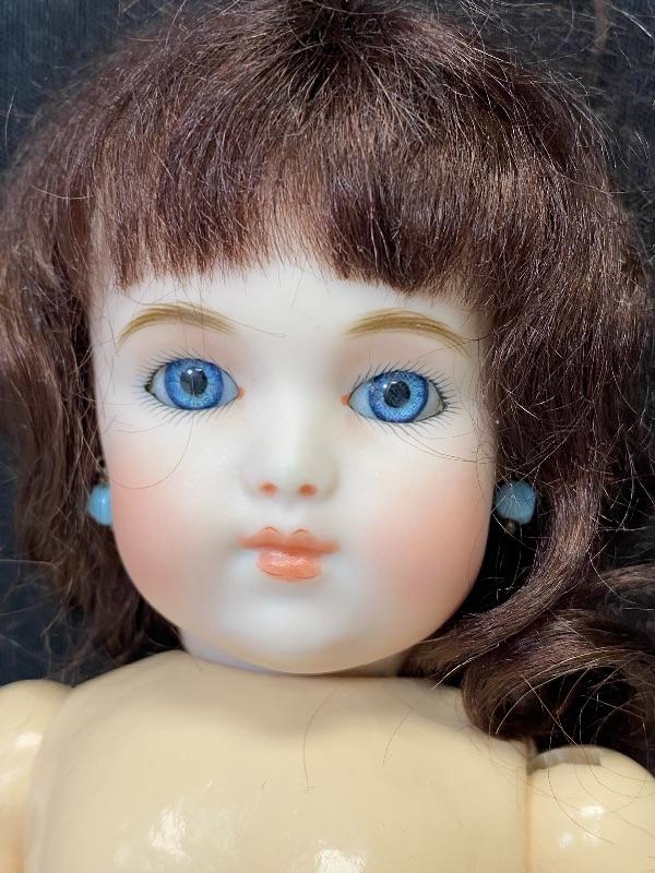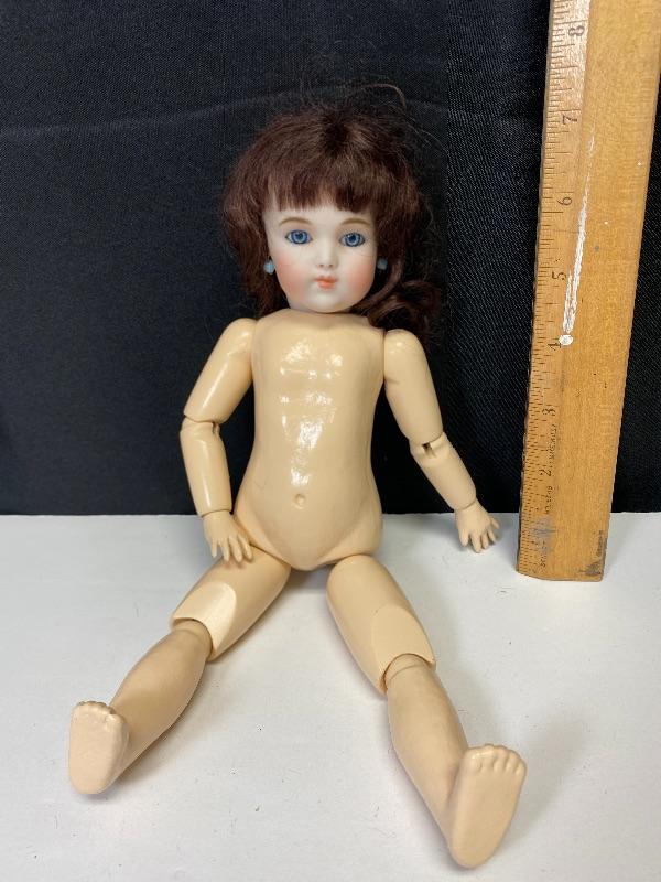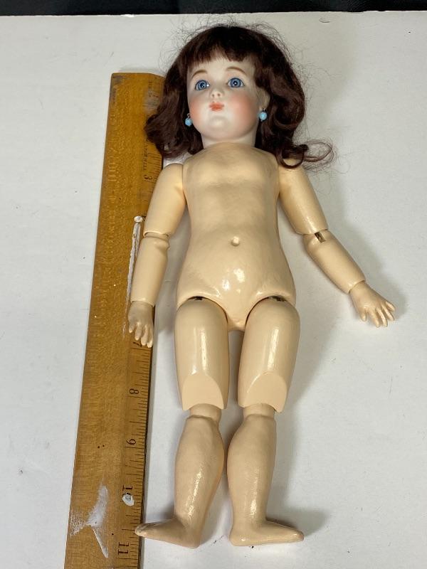 2016 Branka Schlari bisque & composite 10" doll. Undressed. Brown mohair wig. She is signed under the wig. No other marks other then artist and date. Face is beautiful, blue glass eyes, delicate features. Blue earrings. Stands about 10".