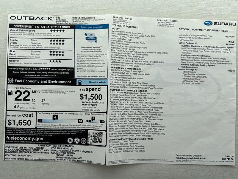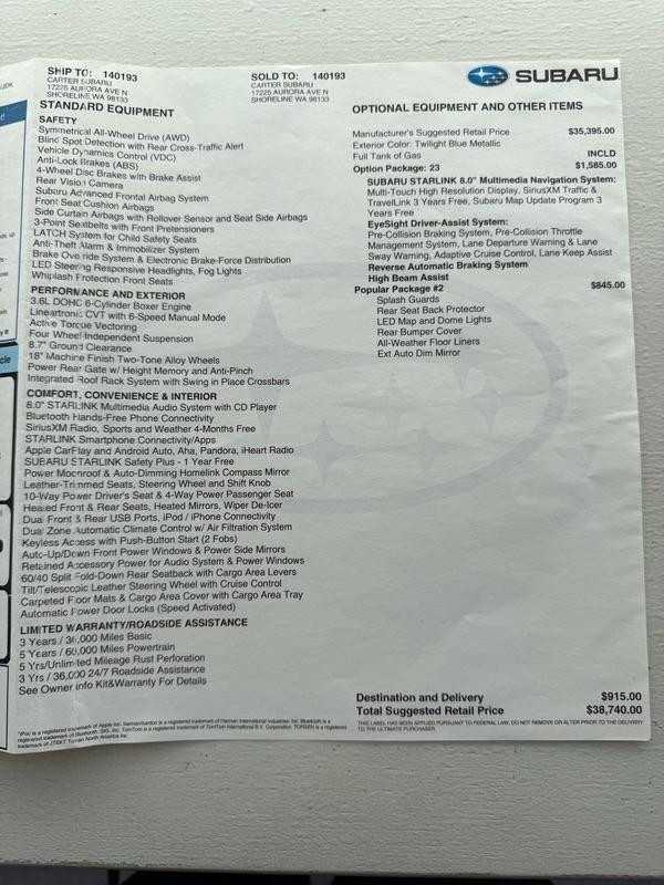 Very nice original owner Subaru Outback - Original Window Sticker (see images) that outlines all the features & equipment. Usually stored in the garage. Exterior color: Twilight Blue Metallic. Model code: 3.6R Limited/JDK - 6 cylinder engine.