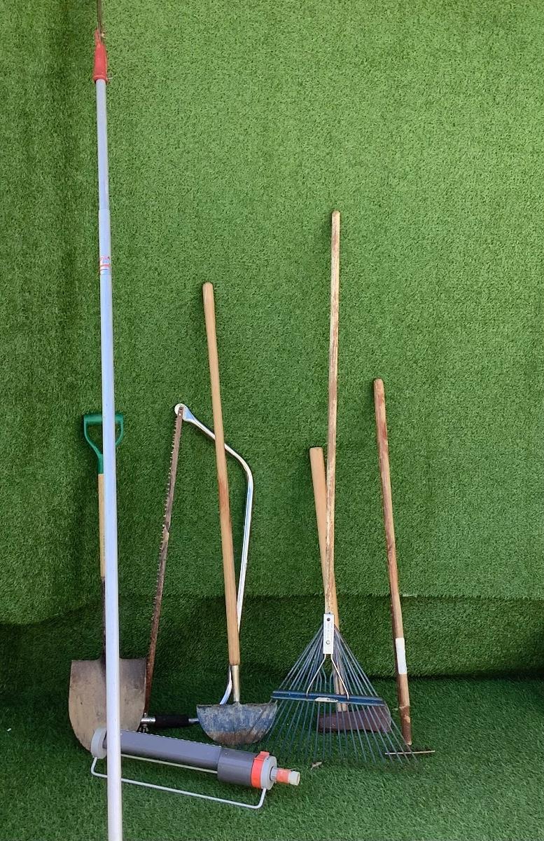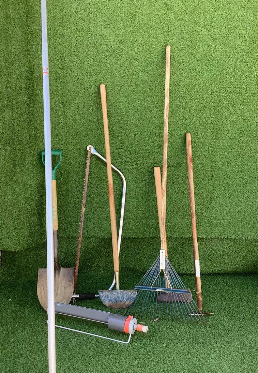 Lot A - eight used garden tools including rake, tree saw, Gardena sprinkler, edger, shovels. Used condition as shown.