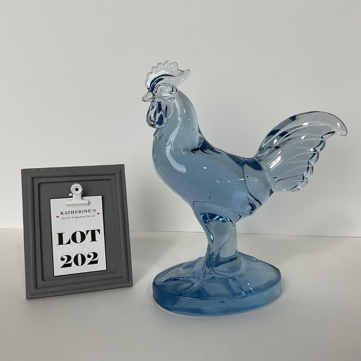 One Paden City ice blue barnyard rooster figure This piece has no damage, and appears to be in great shape with no visable chips, cracks, or broken pieces. 7 1/2 inches wide by 9 inches tall. Please see photos for details and condition. Any condition statement is given as a courtesy to a client, is an opinion, and should not be treated as a statement of fact. Reference to condition written, oral or within a condition report shall not be regarded as a full account of condition and may not include all defects, alterations, or restorations. Absence of a condition report does not imply a lot is flawless or lacking imperfections or damage. Katherine’s Auction & Appraisal Service shall have no responsibility for any error or omission. Returns shall not be accepted on the basis of condition. ::: Shipping is available on this lot. If you require shipping you must let us know at the close of the auction. We will coordinate with you after the item has been won. Shipping fees will include insurance up to or exceeding the value of all items being mailed. If you have any questions regarding this lot please contact the auctioneer either via this website, by direct email or by phone. PICK UP TIMES and other important information can be found in the TERMS and DESCRIPTION of the auction. Please take a look for pertinent information. Thanks!