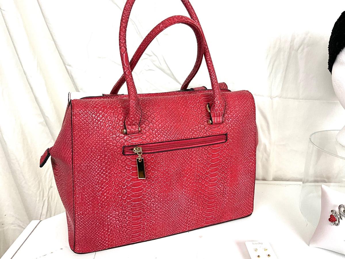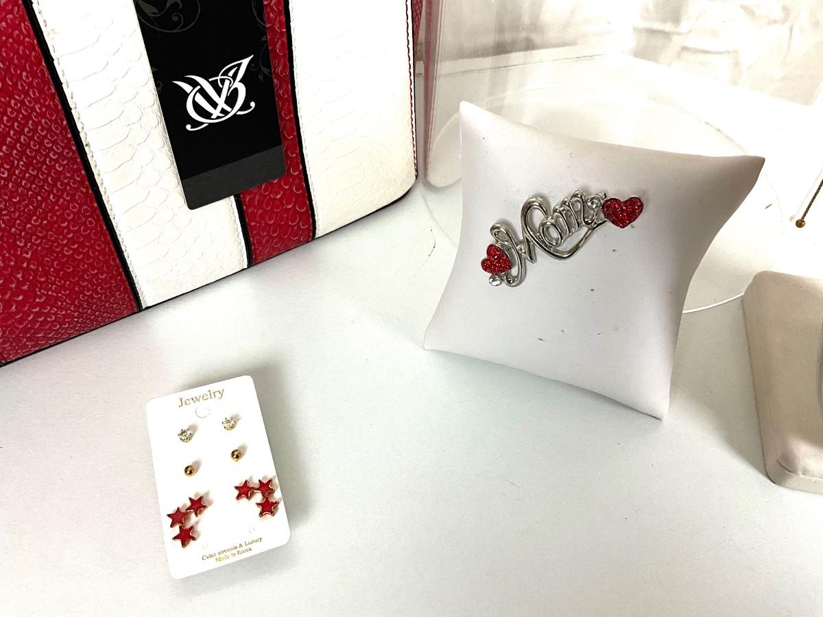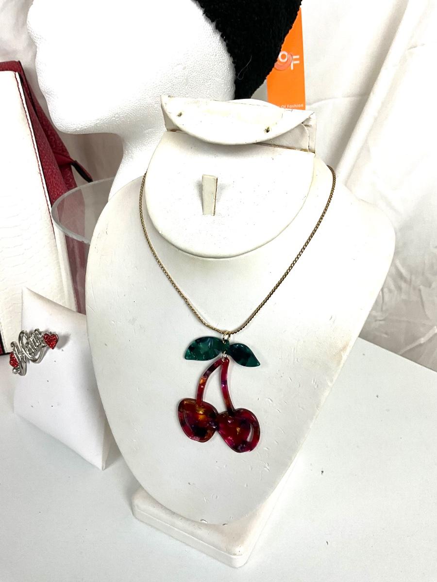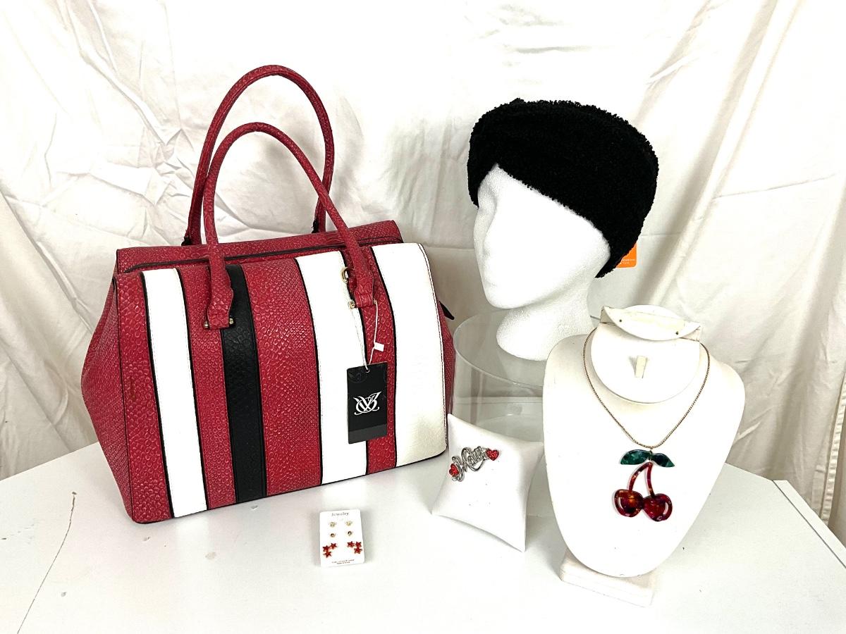202 Red,White,Black Handbag with Black Head Wrap, Cherry Necklace, Love Brooch
