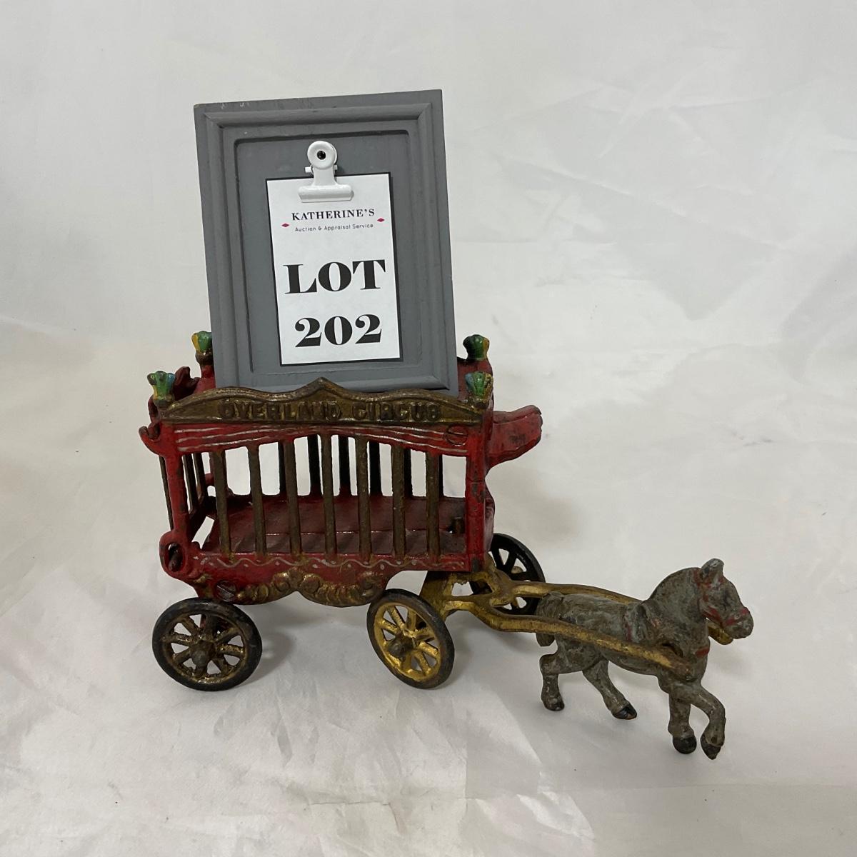 One vintage 1920’s cast iron overland circus wagon. Please see photos for details and condition. ::: Shipping is available on this lot. If you require shipping you must let us know at the close of the auction. We will coordinate with you after the item has been won. Shipping fees will include insurance up to or exceeding the value of all items being mailed. If you have any questions regarding this lot please contact the auctioneer either via this website, by direct email or by phone. PICK UP TIMES and other important information can be found in the TERMS and DESCRIPTION of the auction. Please take a look for pertinent information. Thanks!