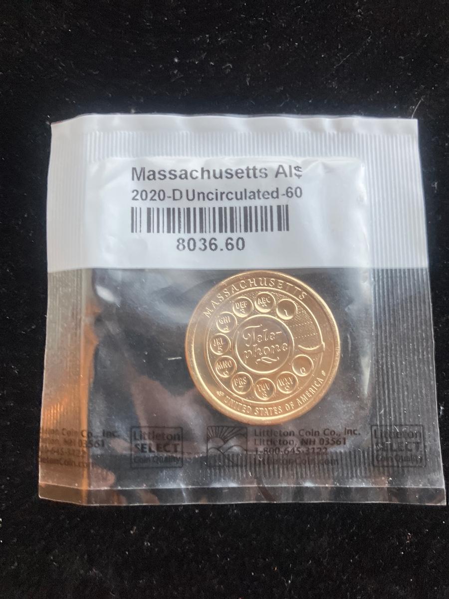This is a 2020-D Massachusetts (Alexander Graham Bell/Telephone) American Innovation dollar in original uncirculated condition, still sealed in its original Littleton Coin Company packaging (stock #8036.60).