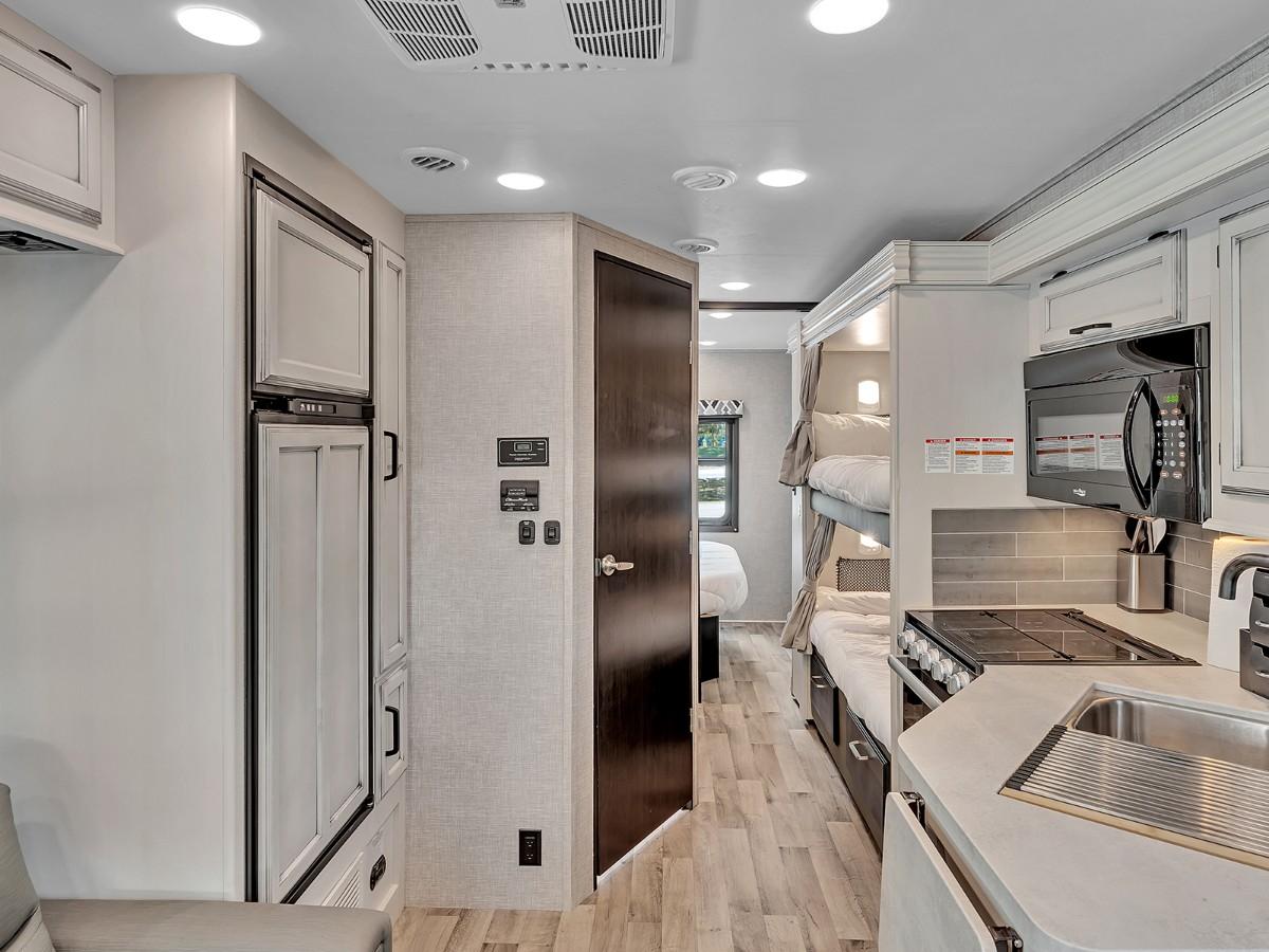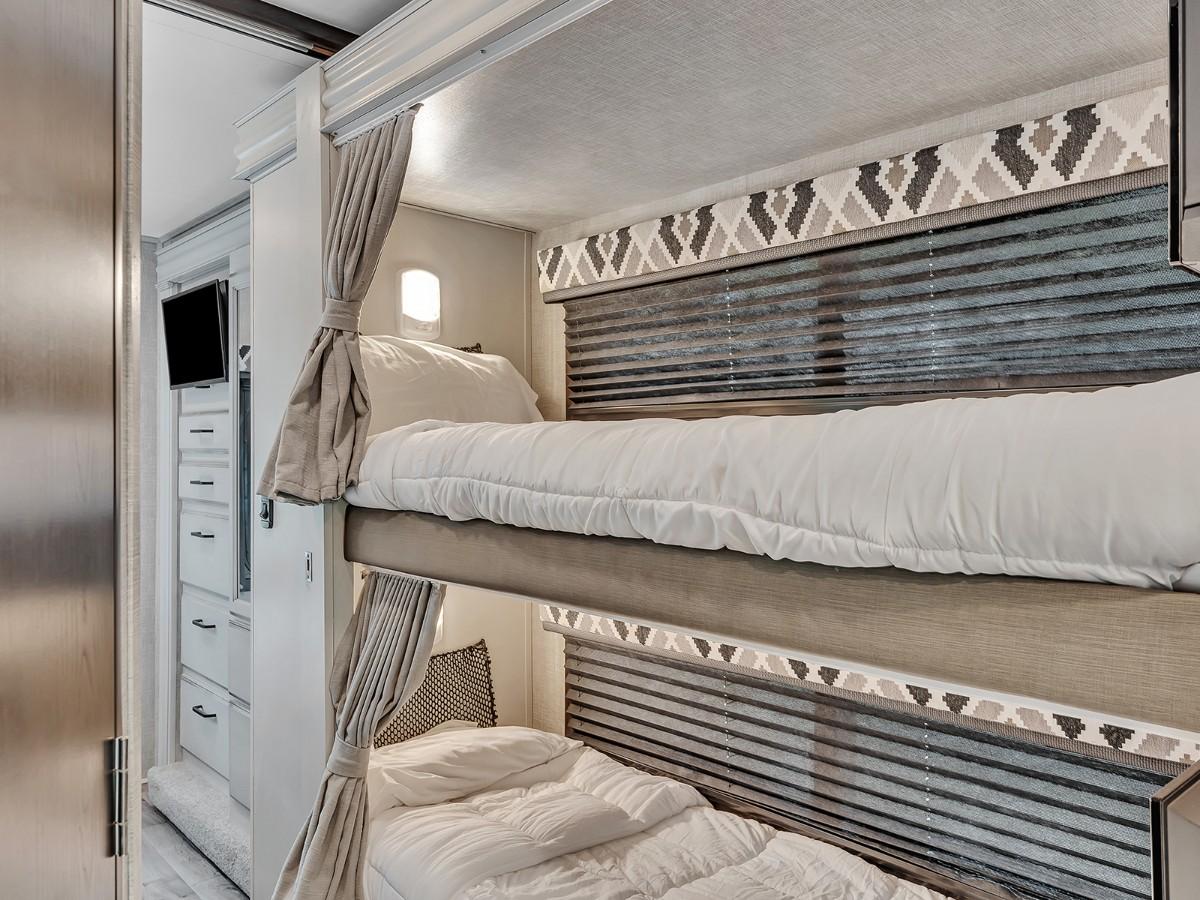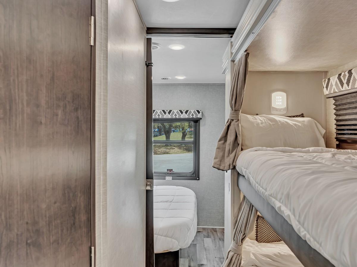 Sleeps Options: Queen Bed, Bunkhouse, Dinette, Overhead bunk