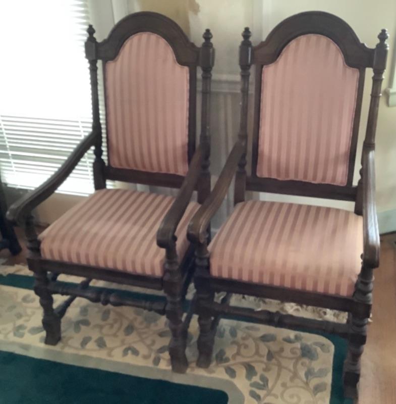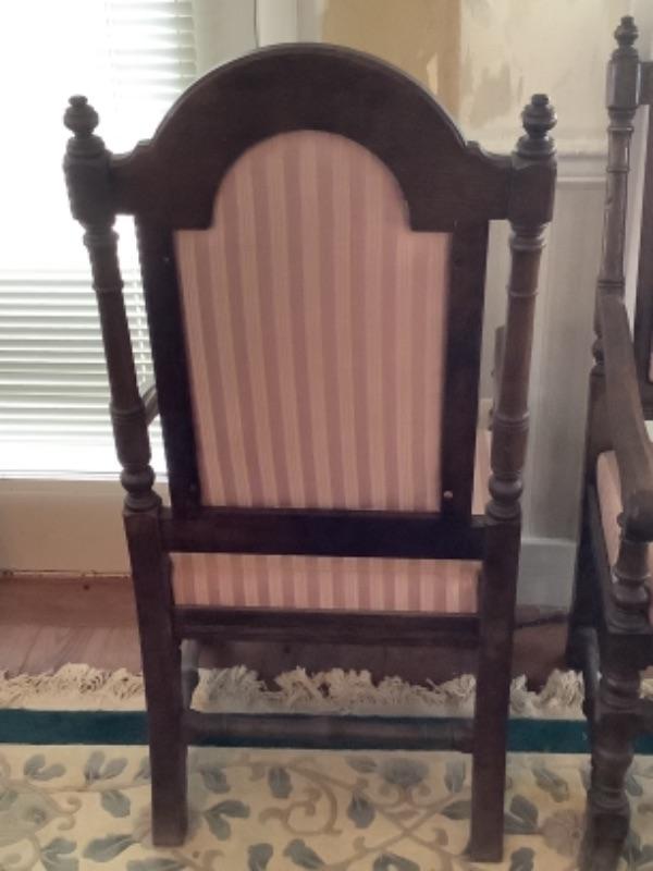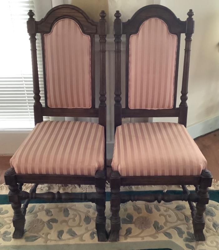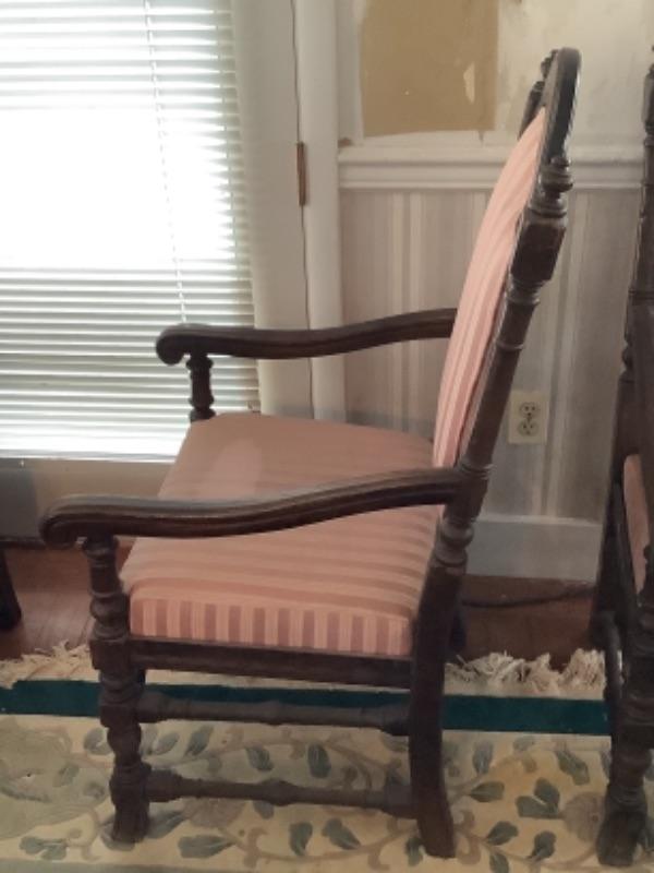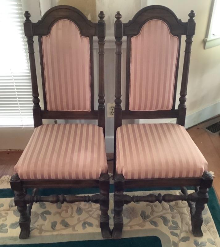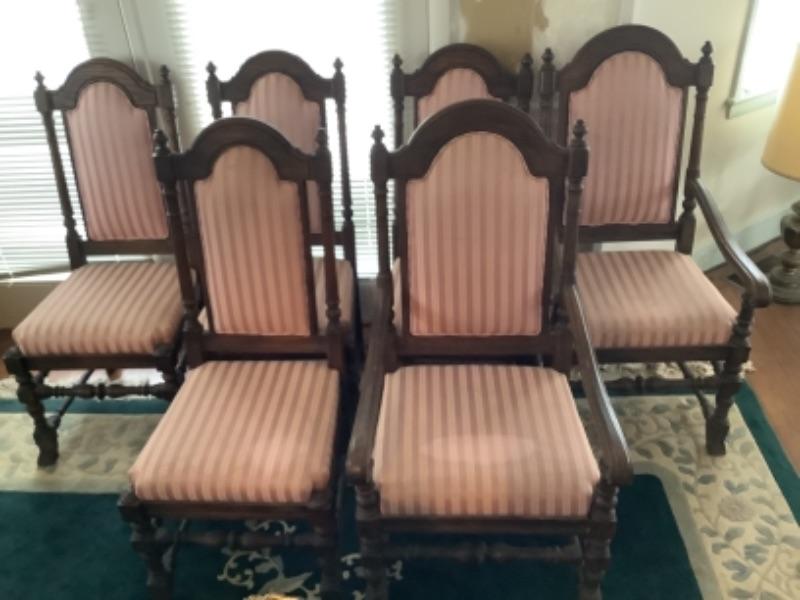 Six upholstered Ethan Allen dining room chairs some mild spots on a couple of the seats that may come out with a cleaning. Chairs measure 43-1/2” high 19-1/2” wide 22-1/2” deep and have a 18” seat height