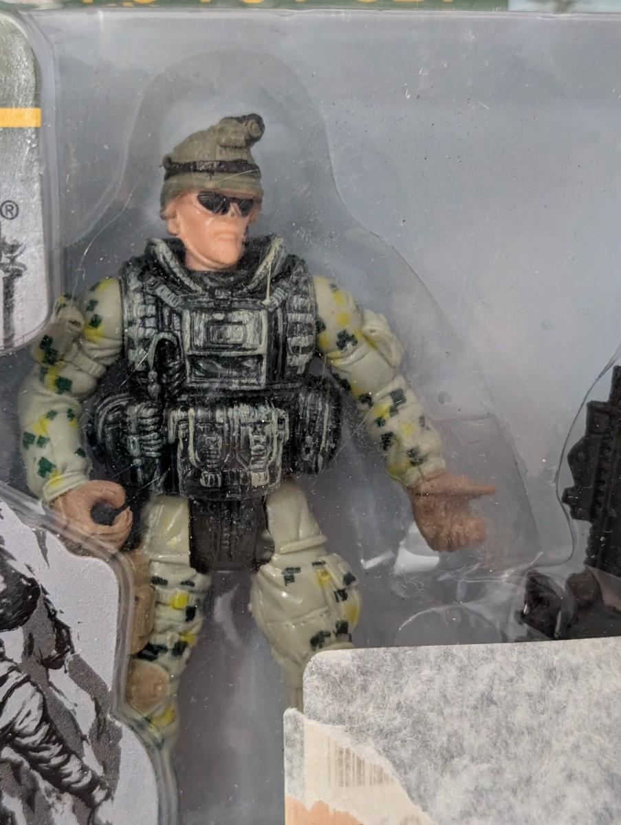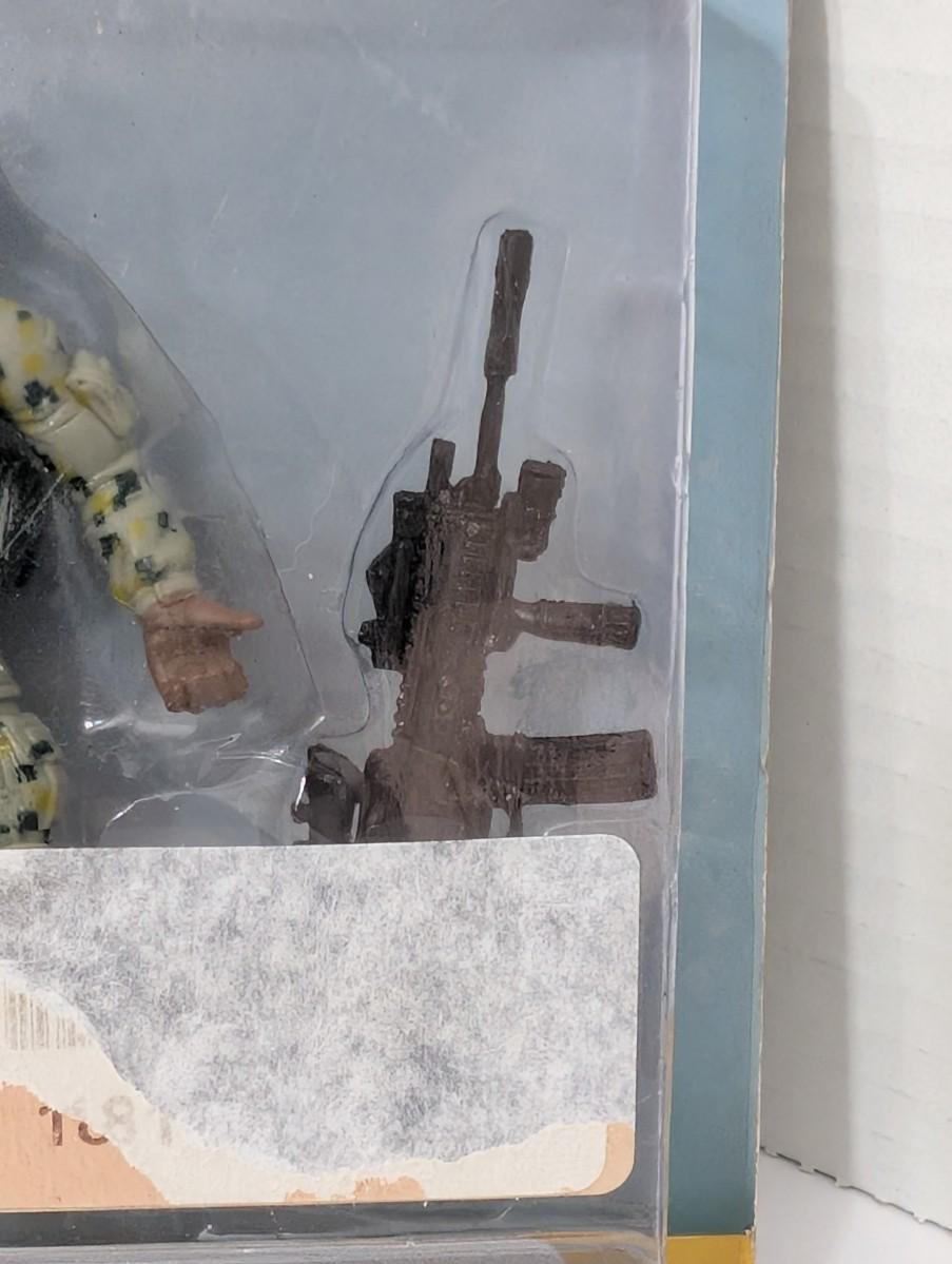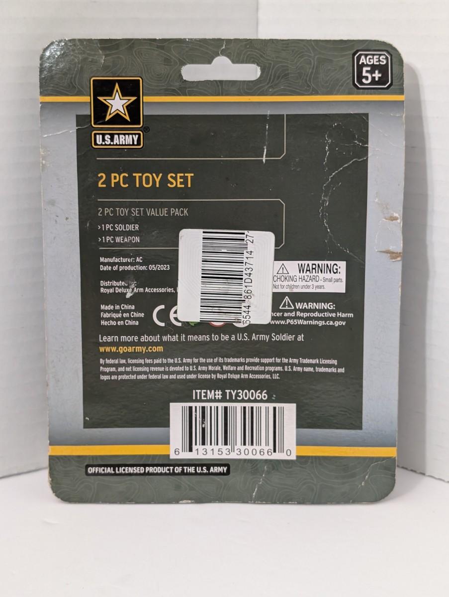 Officially licensed 2023 U.S. Army 2 piece toy set featuring one soldier action figure and one weapon accessory. Produced by Royal Deluxe Arm Accessories, this set showcases realistic modern military detail and durable packaging. Factory sealed, with some wear to the card and sticker residue on the front. Great collectible or display piece for military toy enthusiasts.