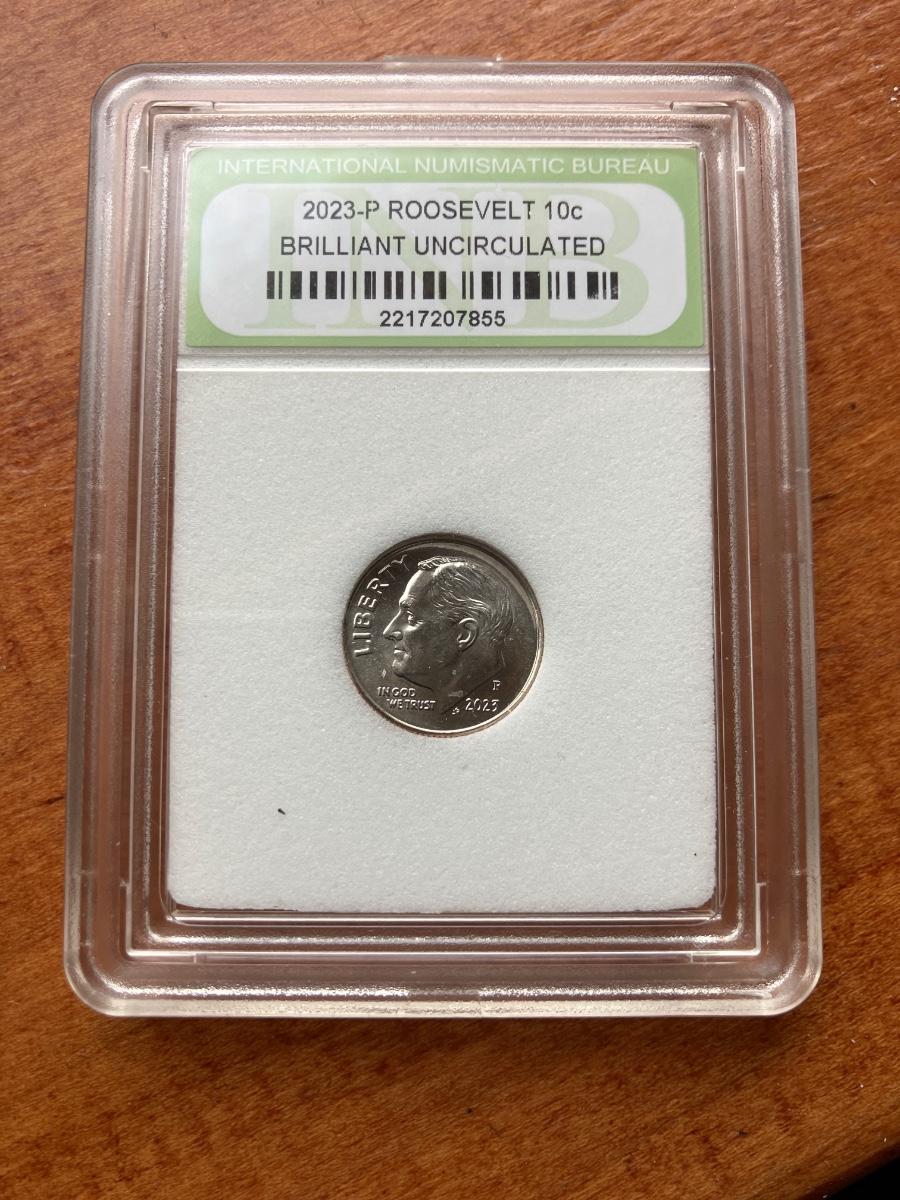 Up for auction is a 2023-P Roosevelt Dime graded and slabbed by the International Numismatic Bureau (INB) as Brilliant Uncirculated.