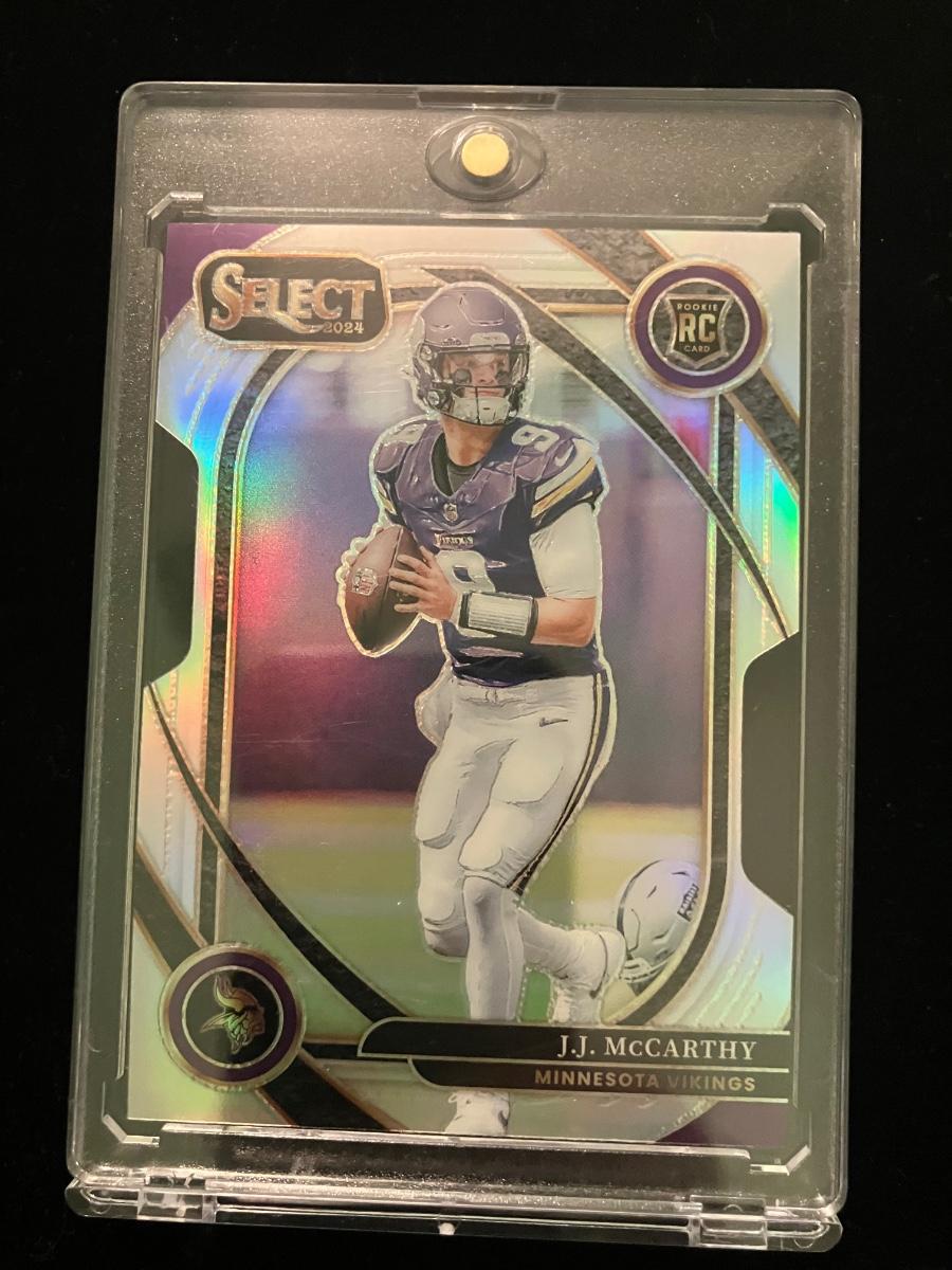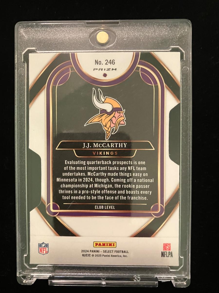 2024 Panini Select Club Level Prizm #246 J.J. McCarthy rookie card! Freshly pulled and stored in a protective case (raw/ungraded, but looks near-mint or better with crisp corners, great centering, and vibrant colors). Features the Minnesota Vikings QB prospect coming off his Michigan national title — touted as having all the tools to be a franchise face. Card shows the classic Prizm shine with gold/purple/green design elements. Perfect for Vikings fans or McCarthy collectors! No major flaws visible — please review all photos closely.