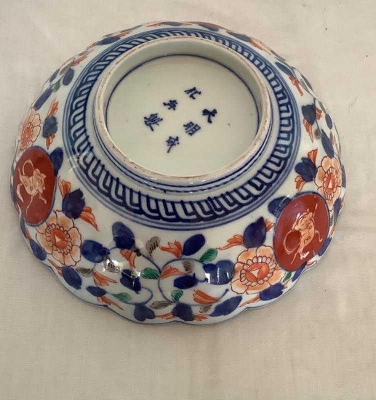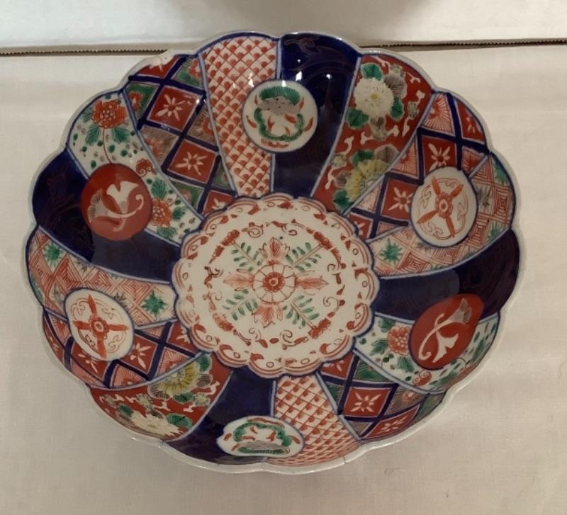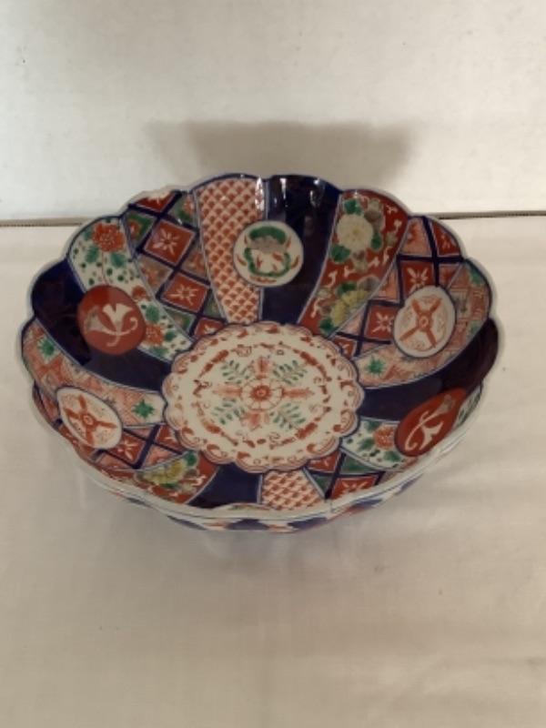 Imari bowl measures 8-3/4” round and has a small chip (see photos)