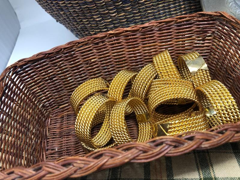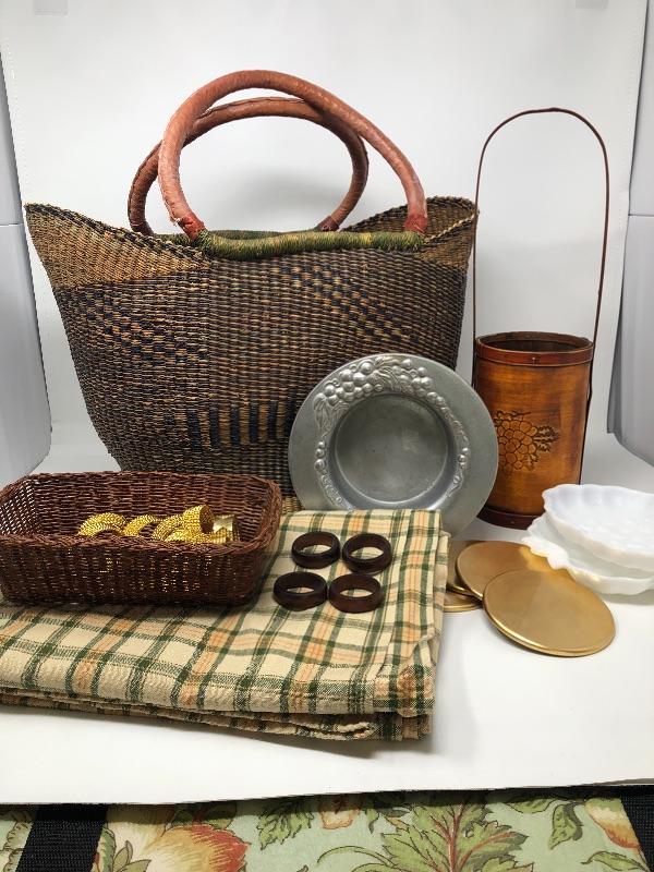 Hand Crafted Basket and More. Oblong Tablecloth large dining table with leaf. Napkin rings and other serving items.