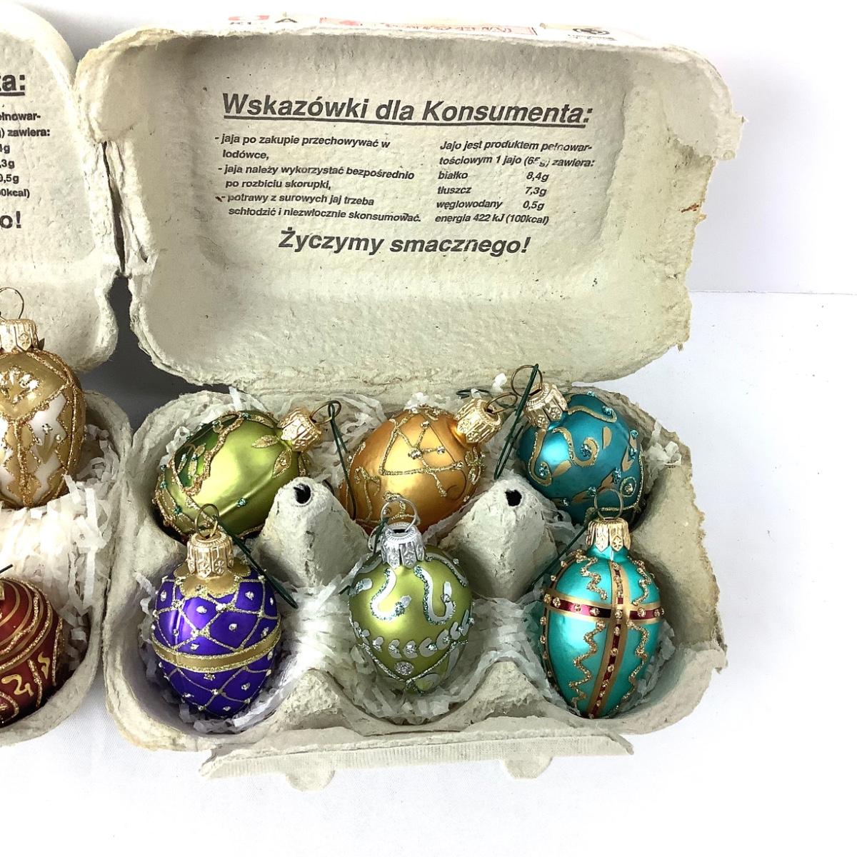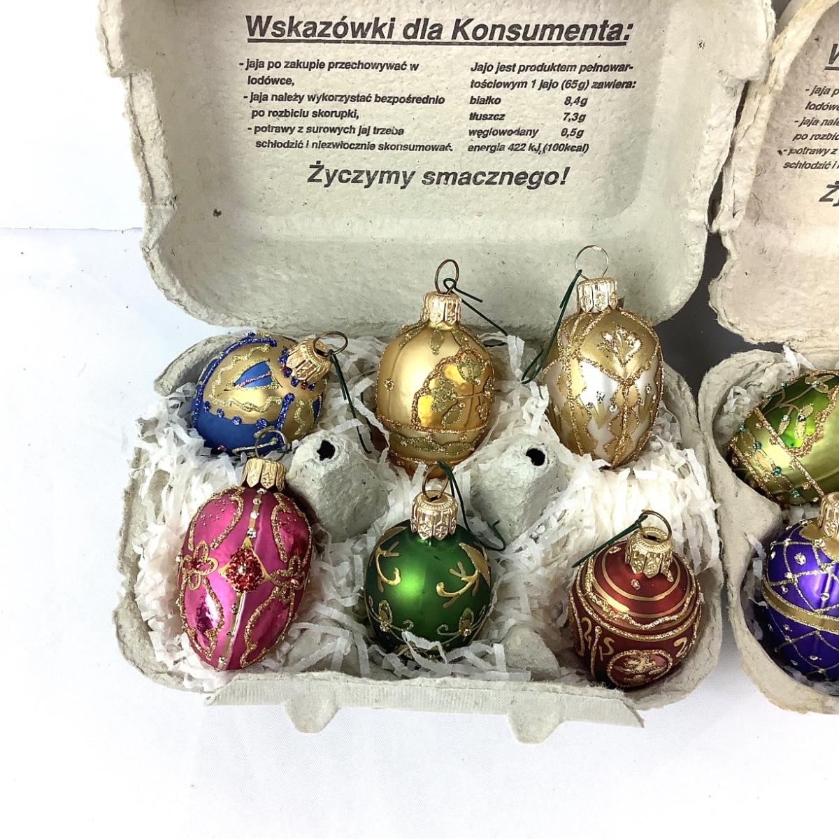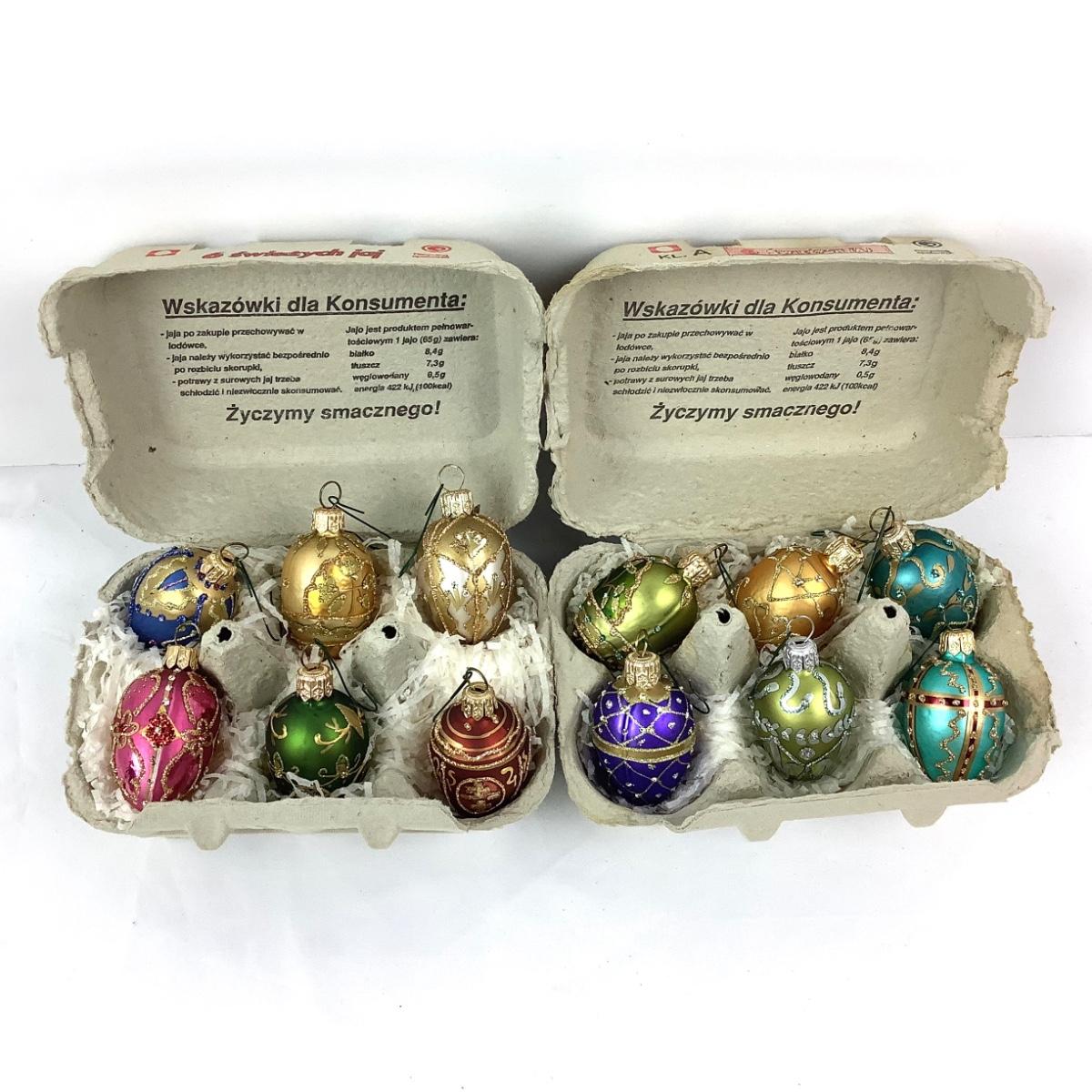 There are 2 packs of 6 ornaments, bright colors, glitter, they measure 2" x 1". Made in Poland and distributed by SMith & Hawken.