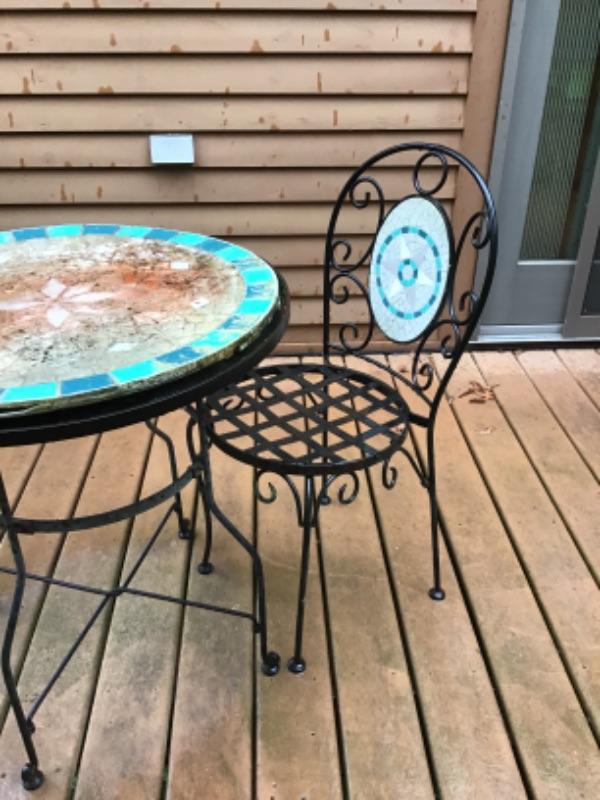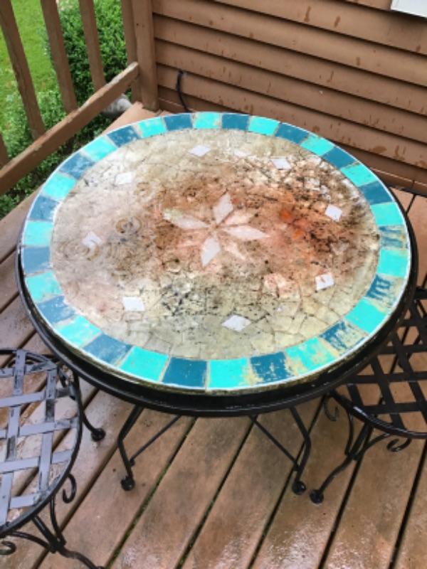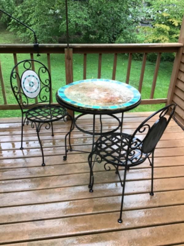 Bistro style table with two chairs table top is warped the table measures 27.5” round by 29.5” tall the chairs measure 34.5” tall by 17” round seat and 15” floor to seat