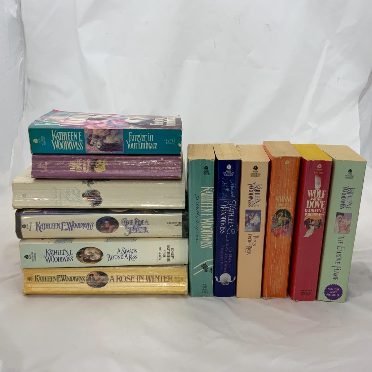 From the Estate of Peter and Alice Radovanovich: Twelve Books by Kathleen E Woodwiss. Books included are: A Rose in Winter, A Season Beyond A Kiss, Come Love A Stranger, Ashes in the Wind, The Flame and the Flower, Forever in your Embrace, Shanna, The Wolf and the Dove, The Elusive Flame, So Worthy My Love, Married at Midnight, and Petals on the River. Please see photos for details and condition. ::: Shipping is available on this lot. If you require shipping you must let us know at the close of the auction. We will coordinate with you after the item has been won. Shipping fees will include insurance up to or exceeding the value of all items being mailed. If you have any questions regarding this lot please contact the auctioneer either via this website, by direct email or by phone. PICK UP TIMES and other important information can be found in the TERMS and DESCRIPTION of the auction. Please take a look for pertinent information. Thanks!