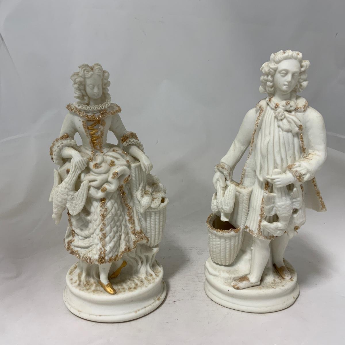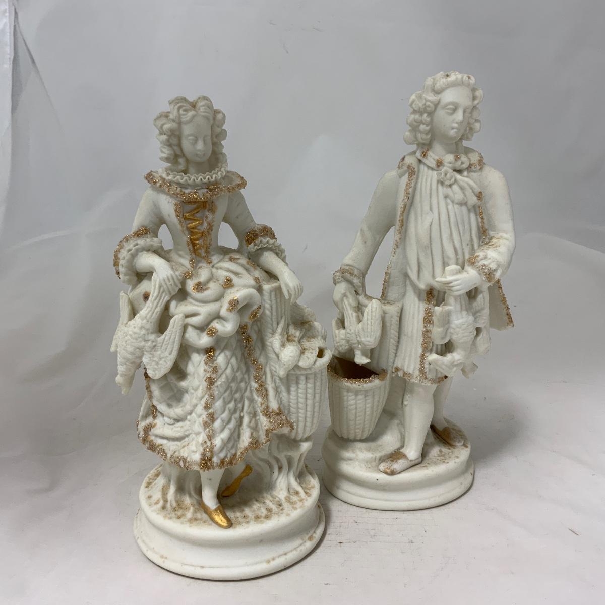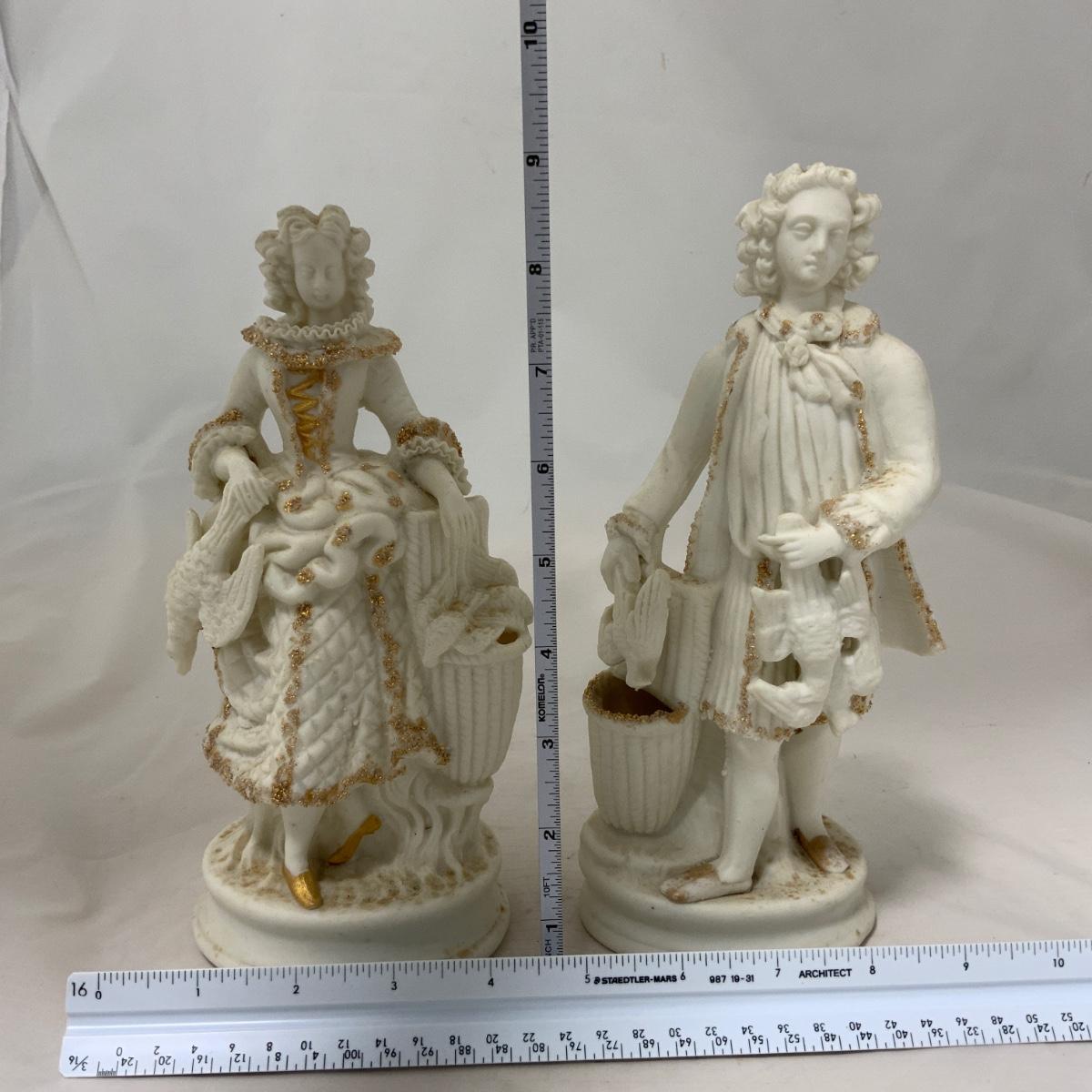 Beautiful pair of Parisian Figures with Gold Detailing, circa 1850. They both look very proud of their pheasants. I cannot tell wether or not his has lost a bit of a wing or not. It looks shorter, but seems to match the other side as well. Use your best judgement. Please see photos for details and condition. ::: Shipping is NOT available on this lot. If you have any questions regarding this lot please contact the auctioneer either via this website, by direct email or by phone. PICK UP TIMES and other important information can be found in the TERMS and DESCRIPTION of the auction. Please take a look for pertinent information. Thanks!