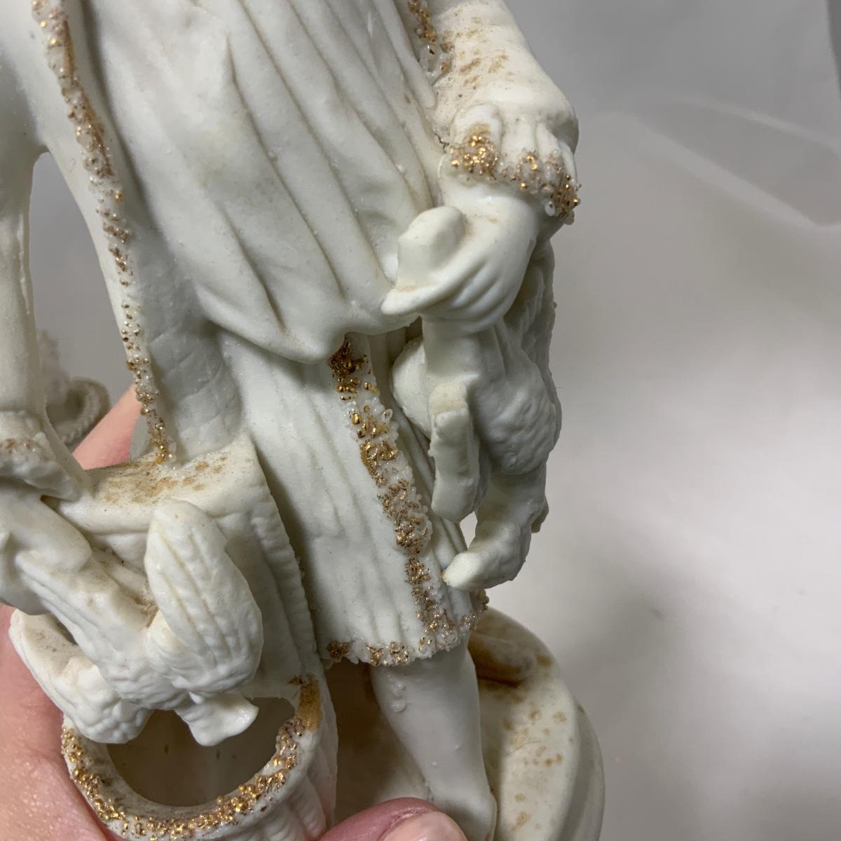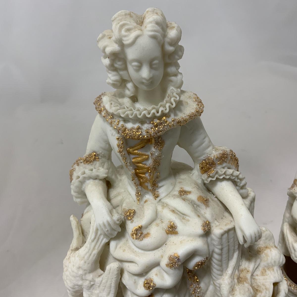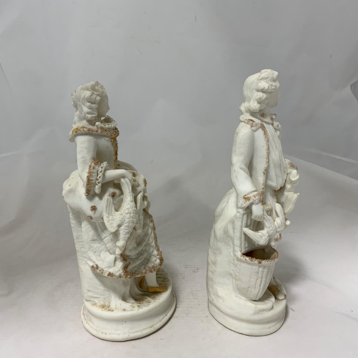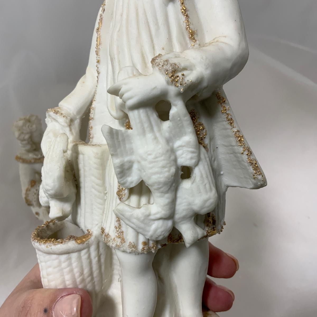 Beautiful pair of Parisian Figures with Gold Detailing, circa 1850. They both look very proud of their pheasants. I cannot tell wether or not his has lost a bit of a wing or not. It looks shorter, but seems to match the other side as well. Use your best judgement. Please see photos for details and condition. ::: Shipping is NOT available on this lot. If you have any questions regarding this lot please contact the auctioneer either via this website, by direct email or by phone. PICK UP TIMES and other important information can be found in the TERMS and DESCRIPTION of the auction. Please take a look for pertinent information. Thanks!