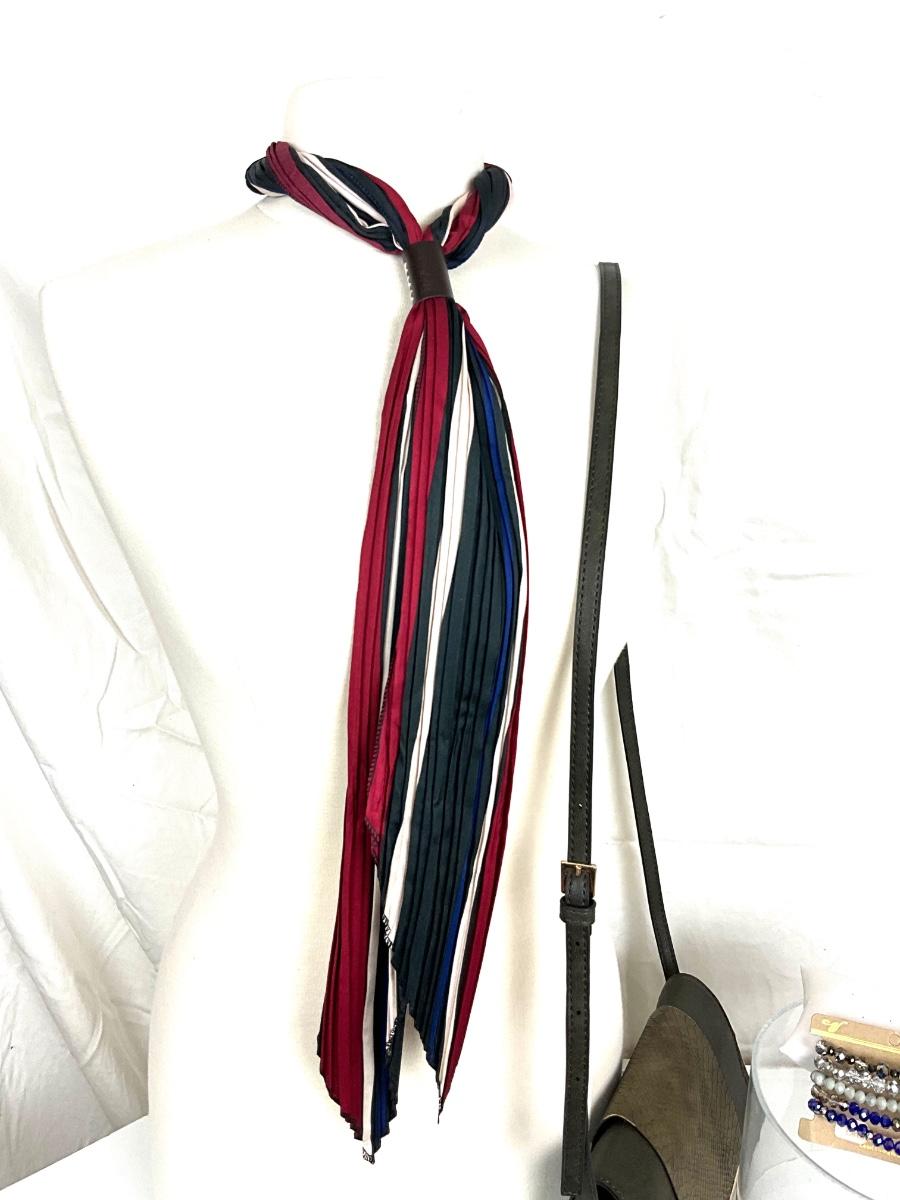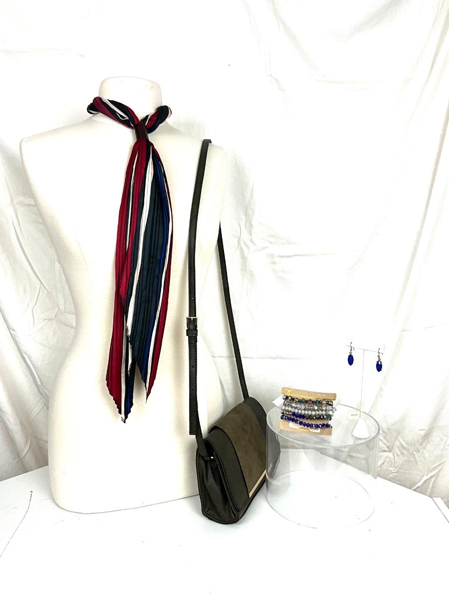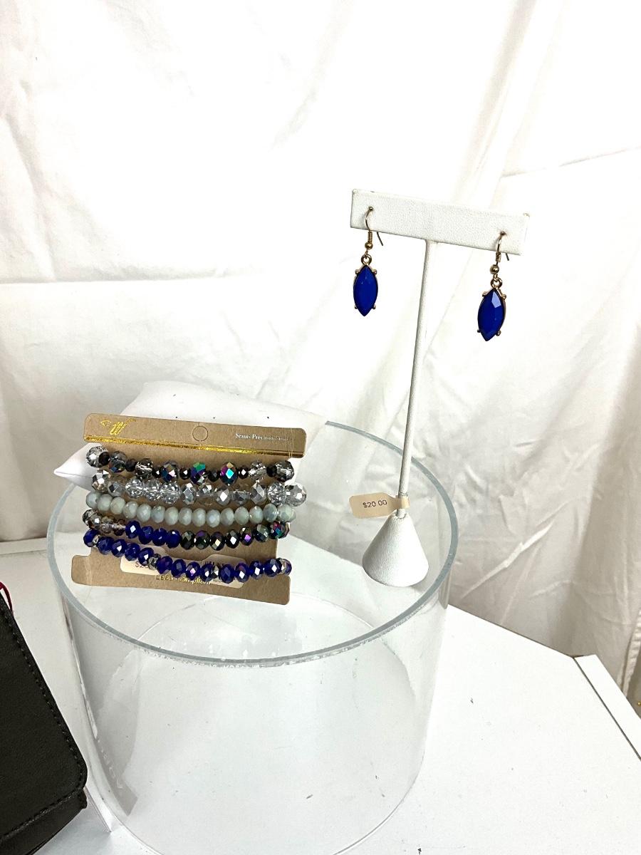 203 Red, White, Black Bolero Style Scarf with Handbag, Stretch Bracelets, Blue Earrings