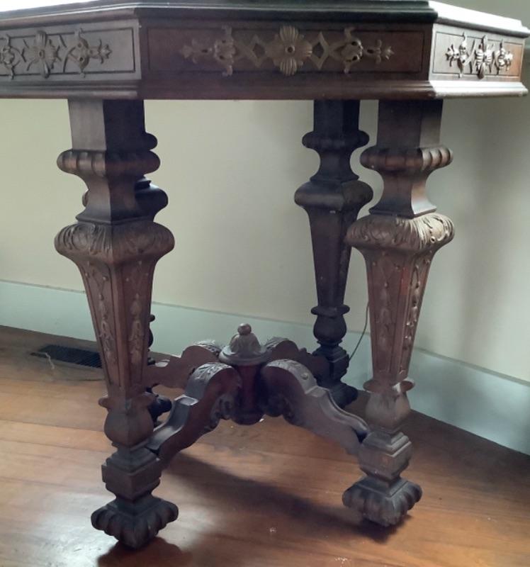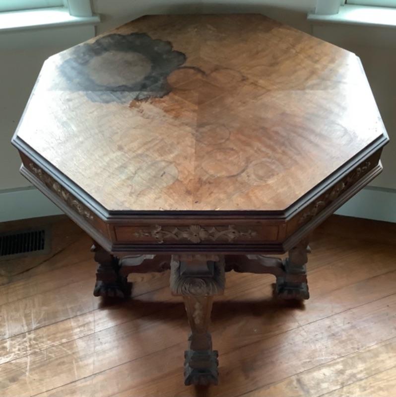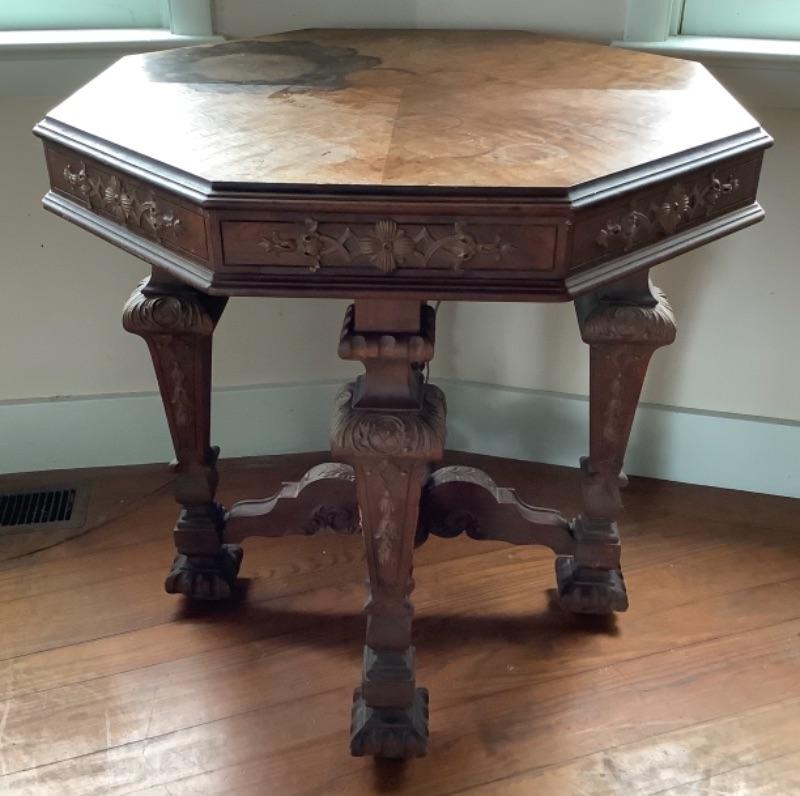 2035 Antique Octagon Table with Floral Fretwork and Neoclassical Design Carved Stretcher