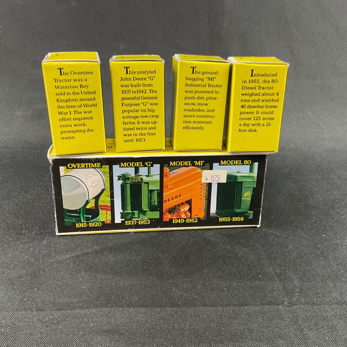 One set of 1/64 scale tractors new in box including models overtime, model G, model MI, and model 80. Please see photos for details and condition. Any condition statement is given as a courtesy to a client, is an opinion, and should not be treated as a statement of fact. Reference to condition written, oral or within a condition report shall not be regarded as a full account of condition and may not include all defects, alterations, or restorations. Absence of a condition report does not imply a lot is flawless or lacking imperfections or damage. Katherine’s Auction & Appraisal Service shall have no responsibility for any error or omission. Returns shall not be accepted on the basis of condition. ::: Shipping is available on this lot. If you require shipping you must let us know at the close of the auction. We will coordinate with you after the item has been won. Shipping fees will include insurance up to or exceeding the value of all items being mailed. If you have any questions regarding this lot please contact the auctioneer either via this website, by direct email or by phone. PICK UP TIMES and other important information can be found in the TERMS and DESCRIPTION of the auction. Please take a look for pertinent information. Thanks!