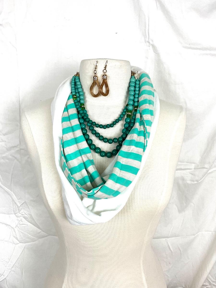204 Green and White Infinity Knit Scarf with Gold Tone Earrings, and Green Necklace