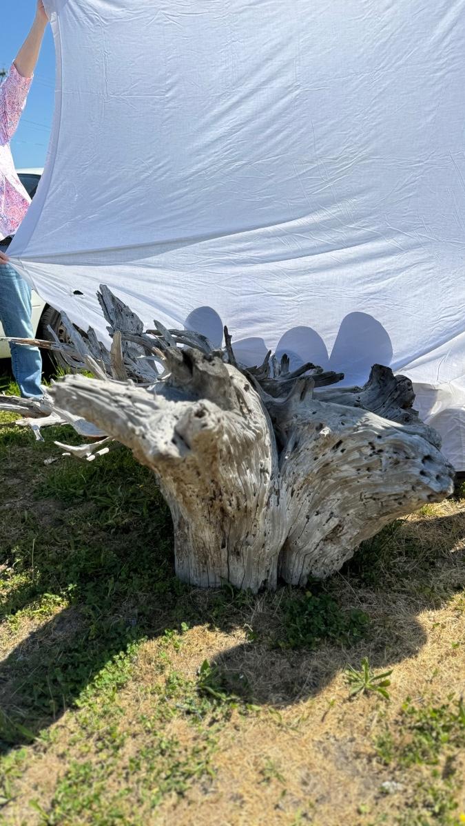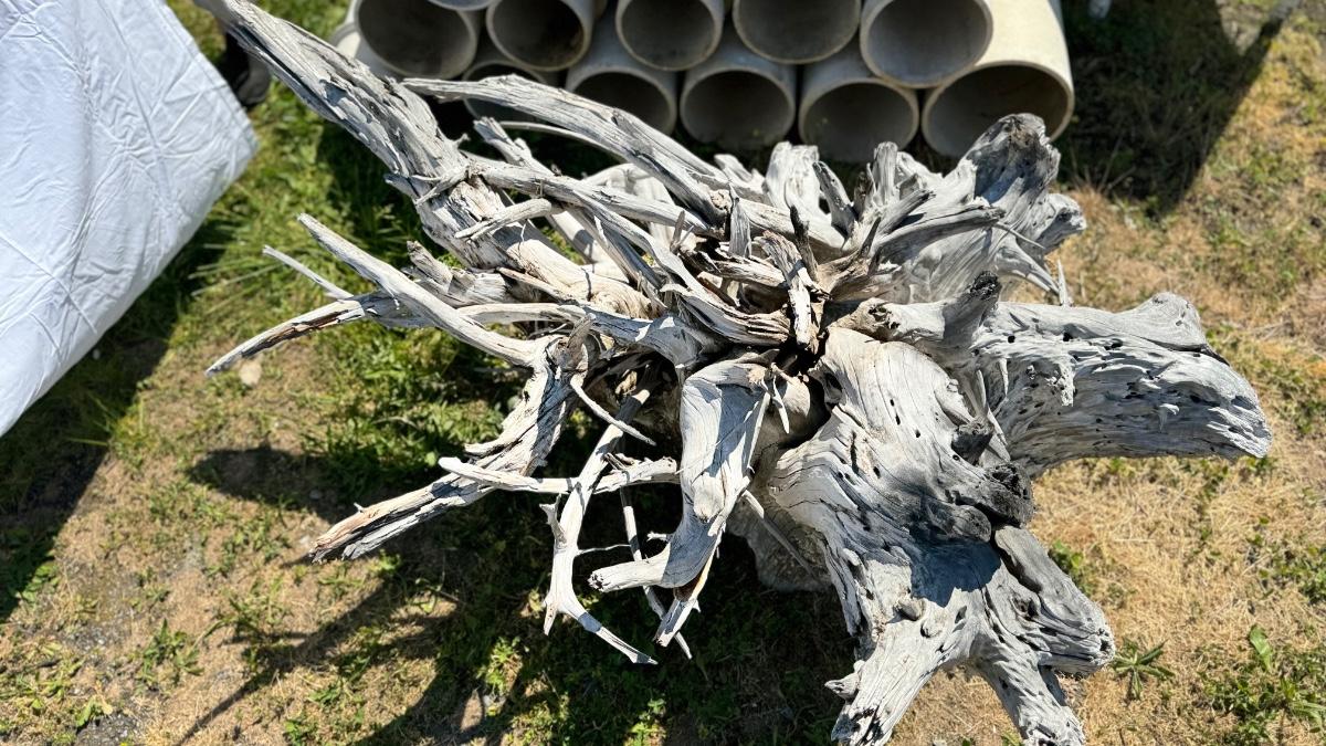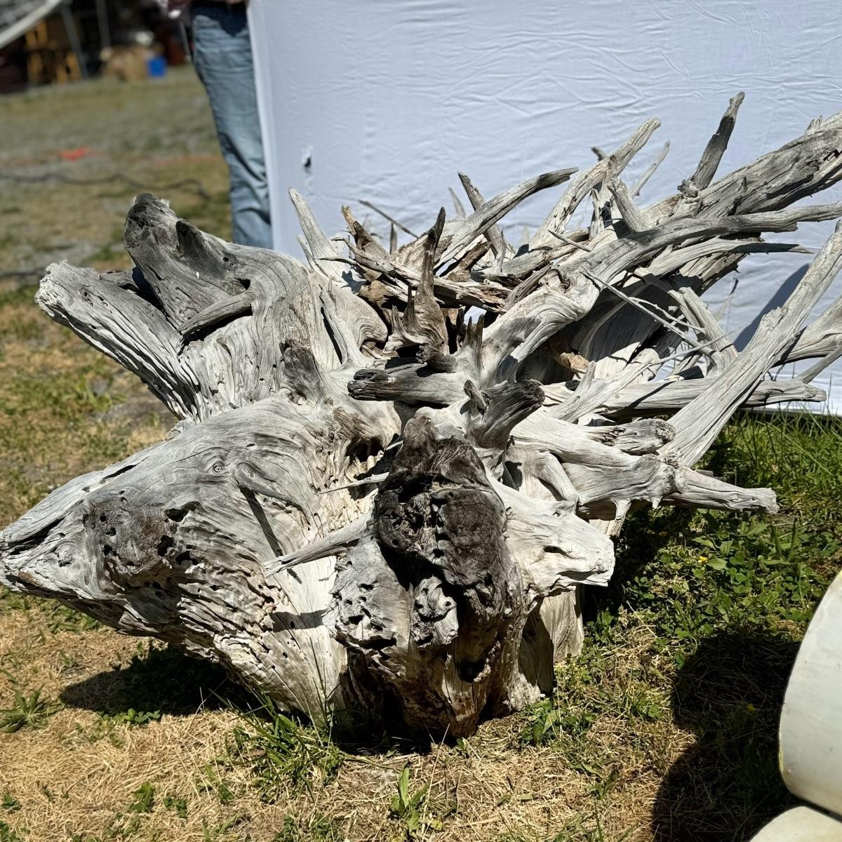 Nicely aged large, heavy driftwood tree trunk stump. Nautical sea shore decor that can be adapted for a table base. Measures 60"W, 43"D, 29.5"H at tallest point.