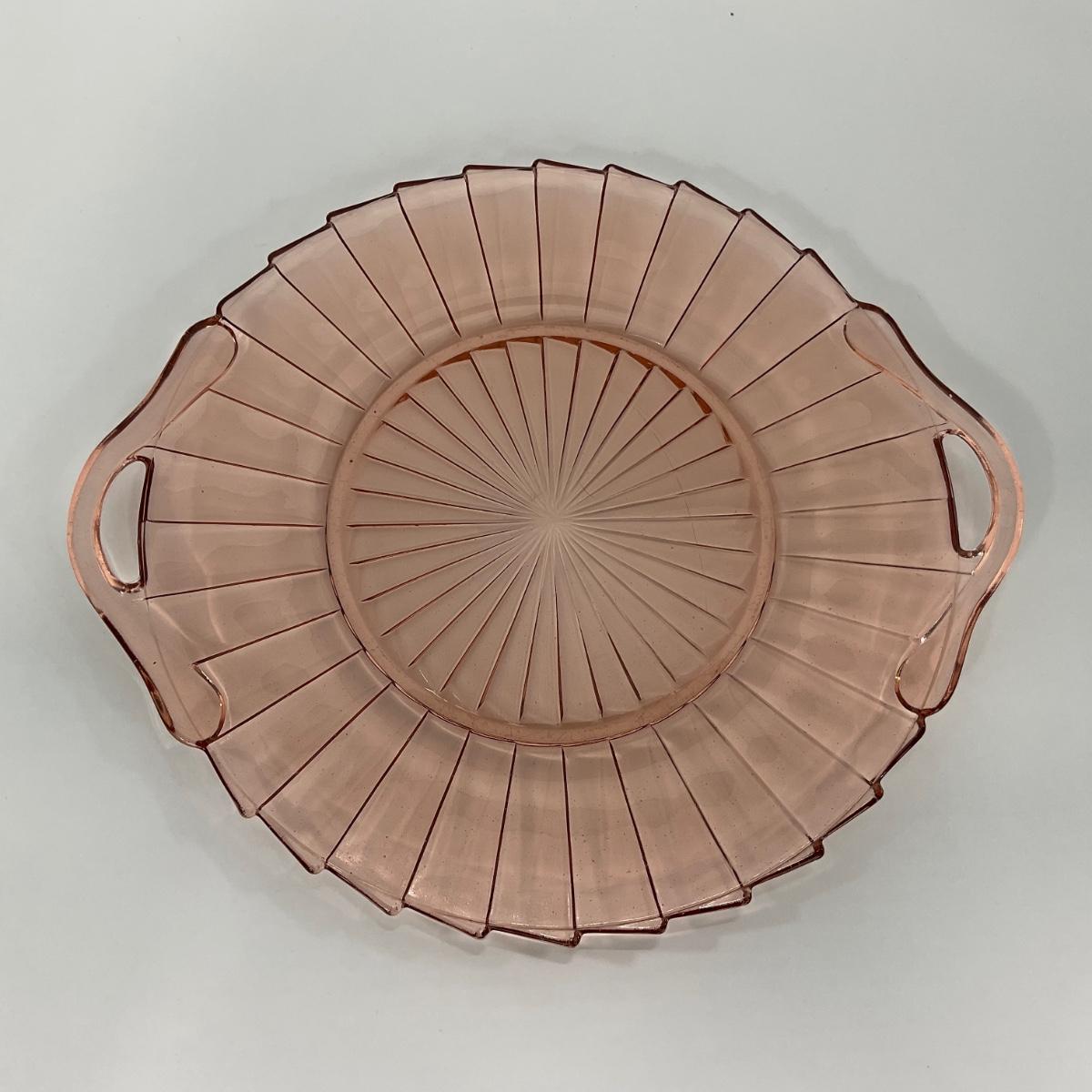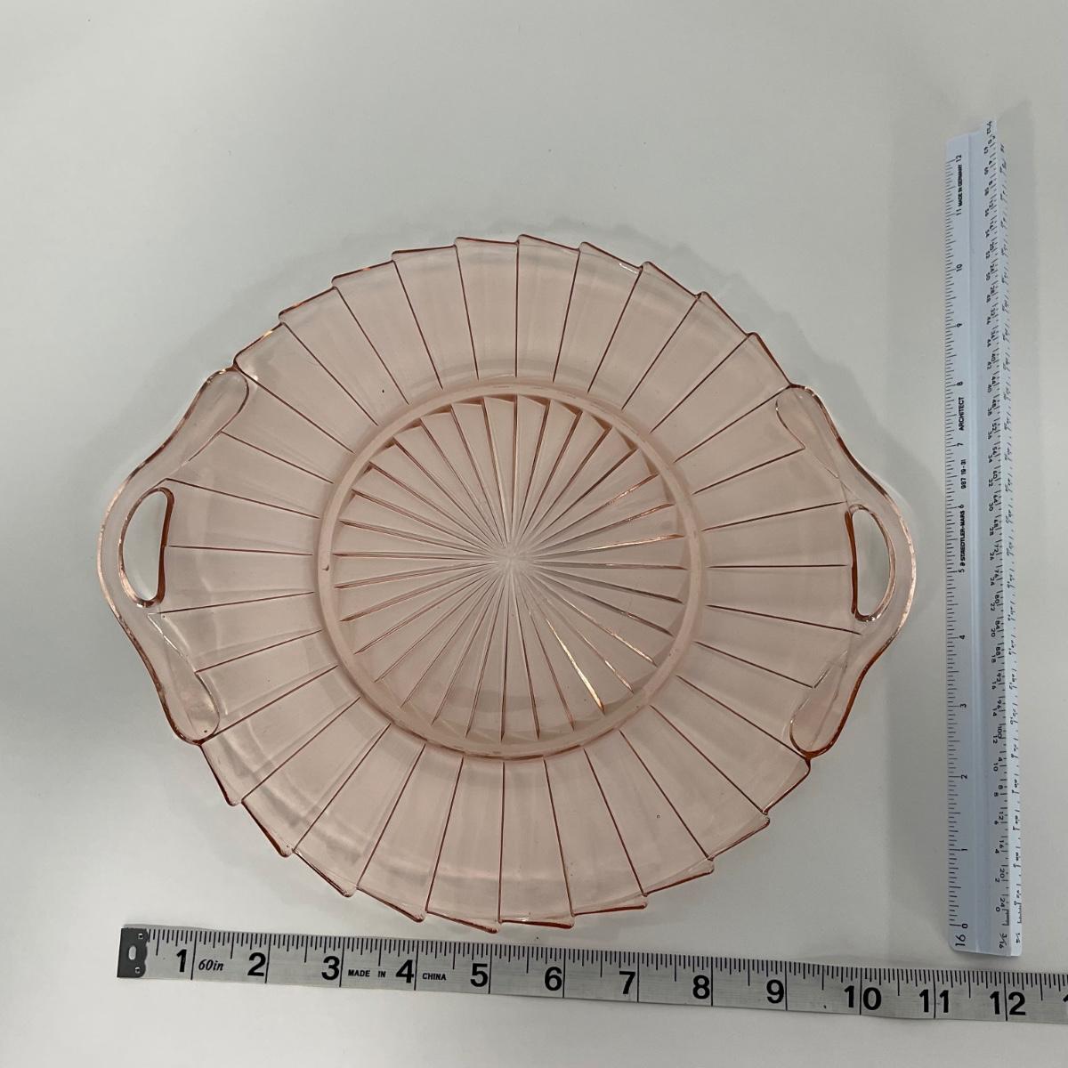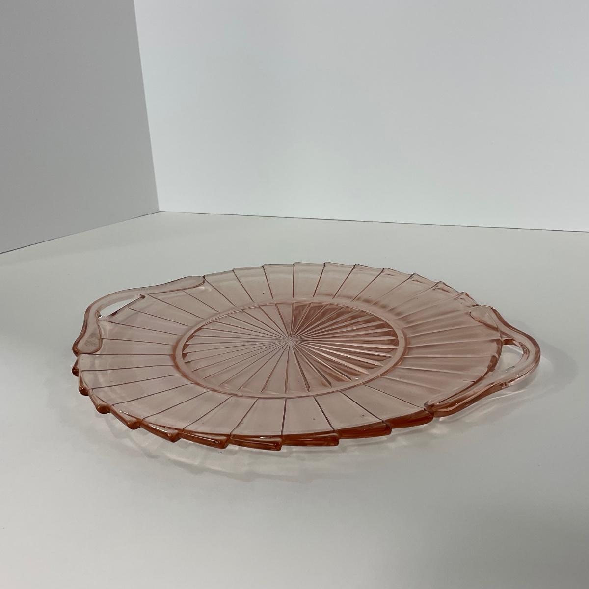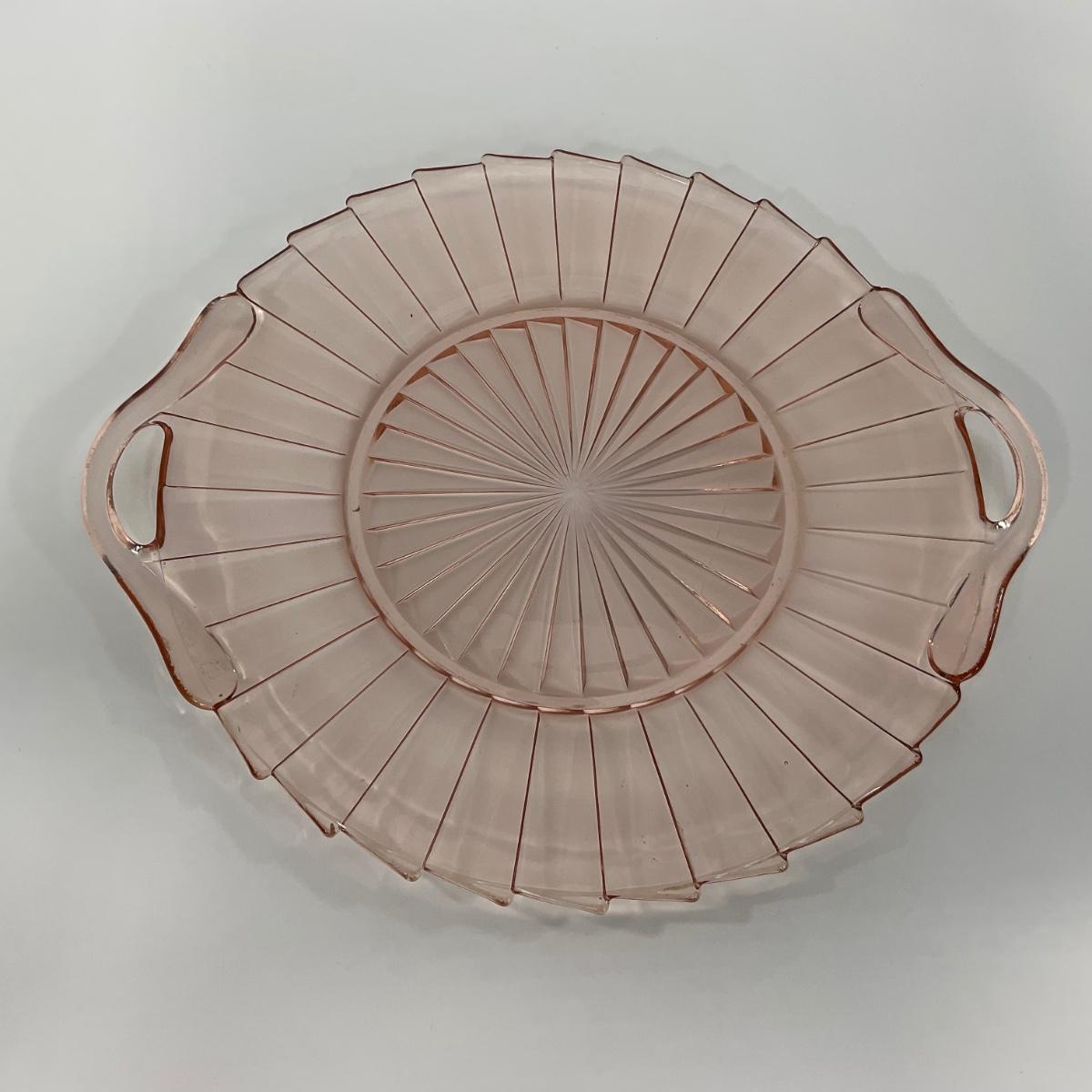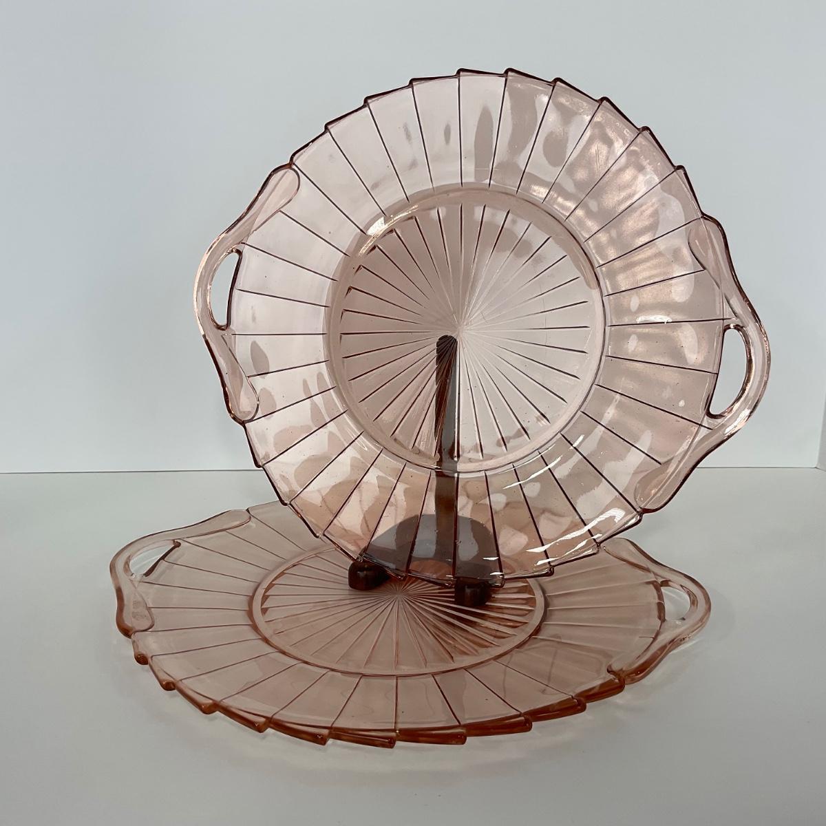 Two pink depression glass Sierra Pinwheel Jeanette Glass Co. (1931-1933) handled tray. Please see photos for details and condition. ::: Shipping is available on this lot. If you require shipping you must let us know at the close of the auction. We will coordinate with you after the item has been won. Shipping fees will include insurance up to or exceeding the value of all items being mailed. If you have any questions regarding this lot please contact the auctioneer either via this website, by direct email or by phone. PICK UP TIMES and other important information can be found in the TERMS and DESCRIPTION of the auction. Please take a look for pertinent information. Thanks!