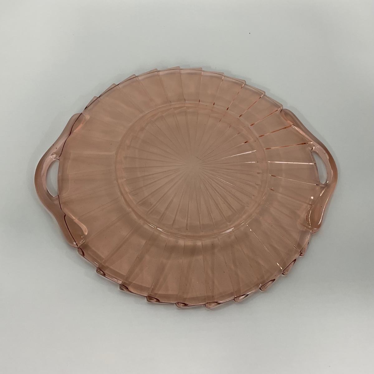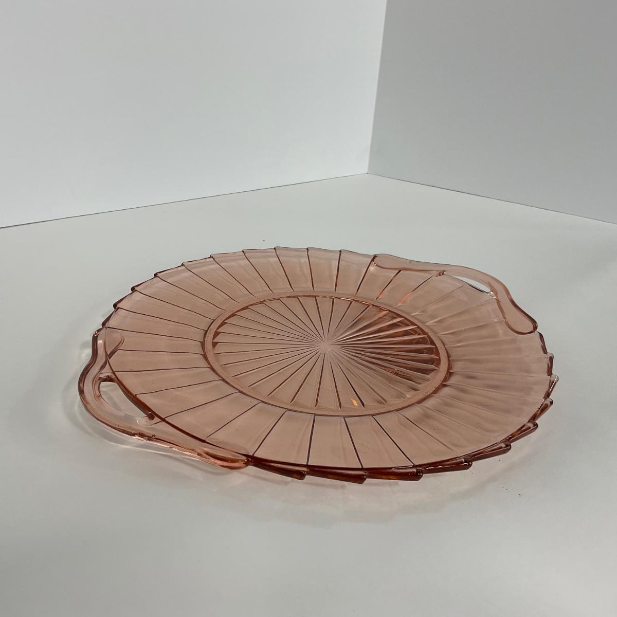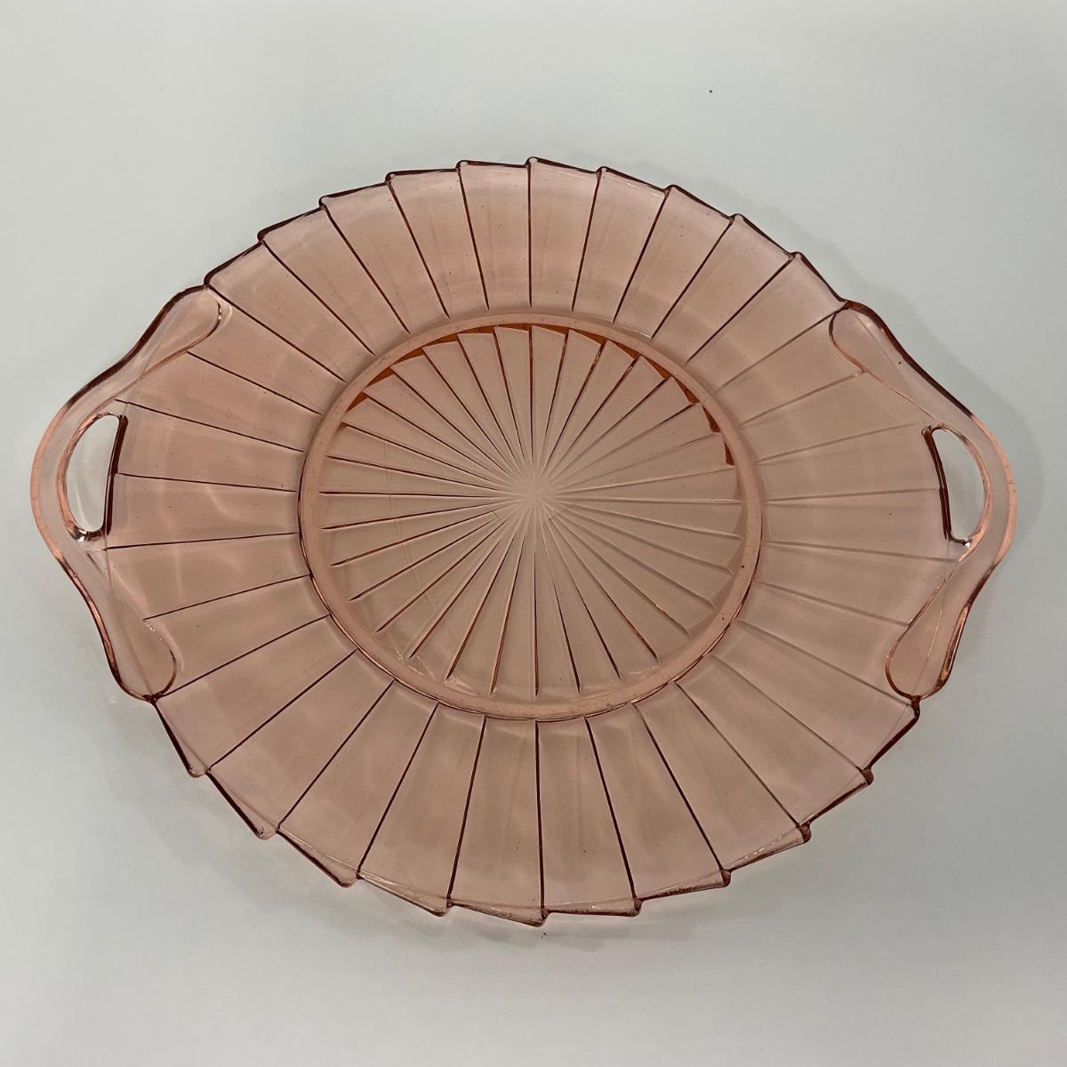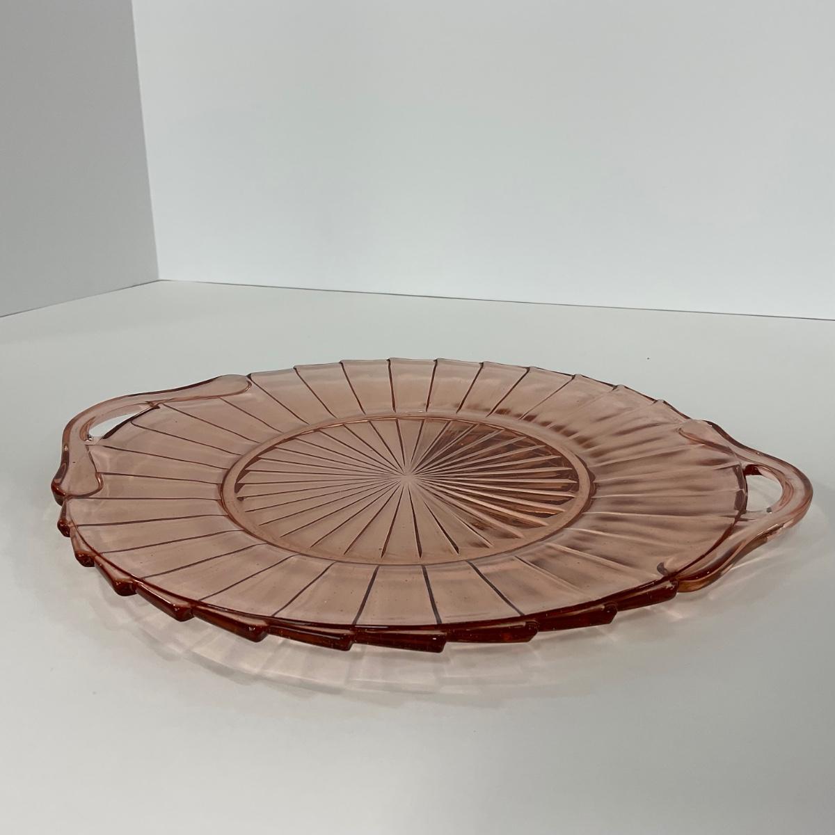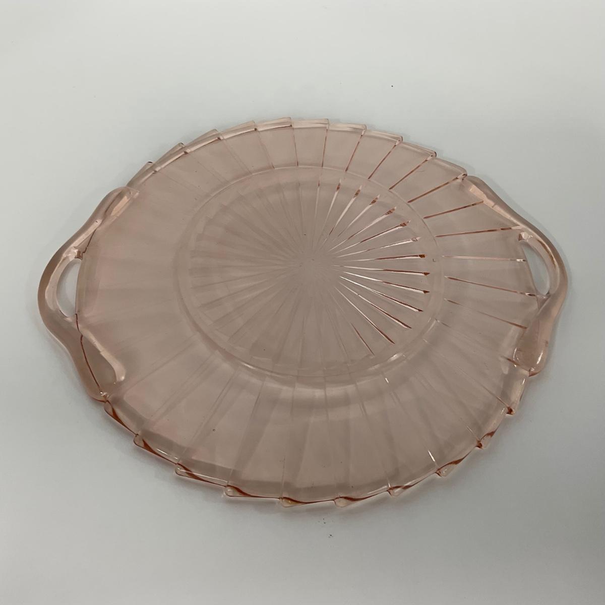 Two pink depression glass Sierra Pinwheel Jeanette Glass Co. (1931-1933) handled tray. Please see photos for details and condition. ::: Shipping is available on this lot. If you require shipping you must let us know at the close of the auction. We will coordinate with you after the item has been won. Shipping fees will include insurance up to or exceeding the value of all items being mailed. If you have any questions regarding this lot please contact the auctioneer either via this website, by direct email or by phone. PICK UP TIMES and other important information can be found in the TERMS and DESCRIPTION of the auction. Please take a look for pertinent information. Thanks!