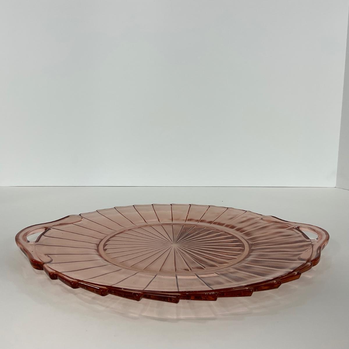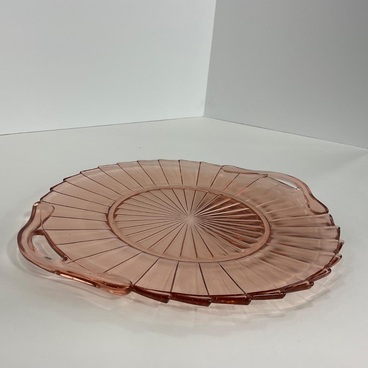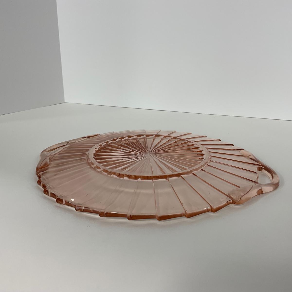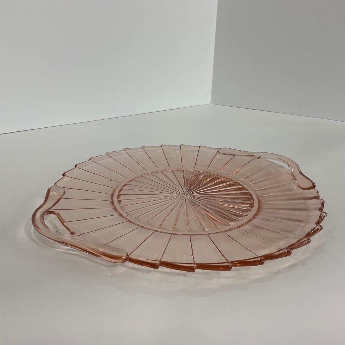Two pink depression glass Sierra Pinwheel Jeanette Glass Co. (1931-1933) handled tray. Please see photos for details and condition. ::: Shipping is available on this lot. If you require shipping you must let us know at the close of the auction. We will coordinate with you after the item has been won. Shipping fees will include insurance up to or exceeding the value of all items being mailed. If you have any questions regarding this lot please contact the auctioneer either via this website, by direct email or by phone. PICK UP TIMES and other important information can be found in the TERMS and DESCRIPTION of the auction. Please take a look for pertinent information. Thanks!