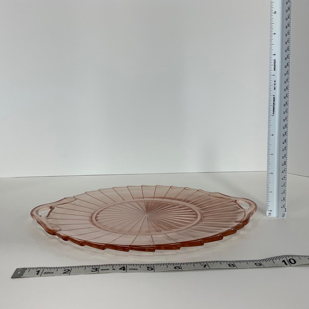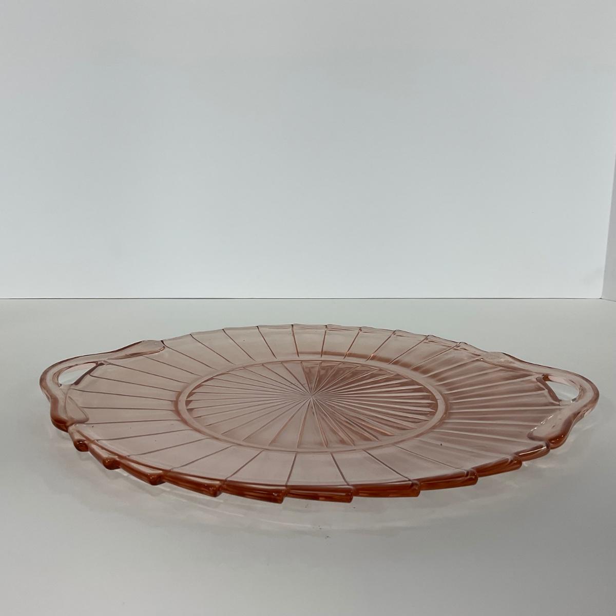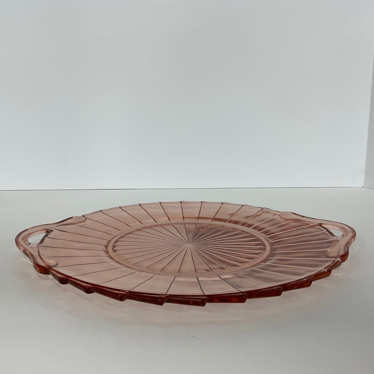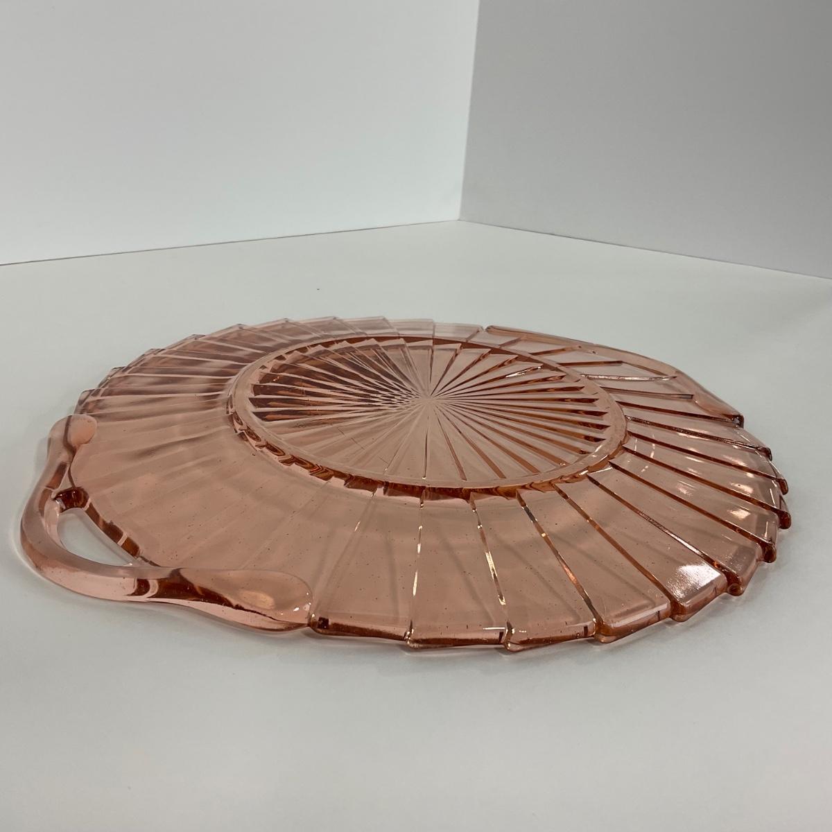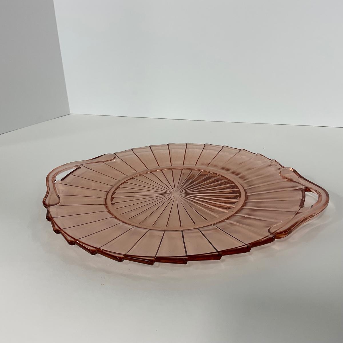 Two pink depression glass Sierra Pinwheel Jeanette Glass Co. (1931-1933) handled tray. Please see photos for details and condition. ::: Shipping is available on this lot. If you require shipping you must let us know at the close of the auction. We will coordinate with you after the item has been won. Shipping fees will include insurance up to or exceeding the value of all items being mailed. If you have any questions regarding this lot please contact the auctioneer either via this website, by direct email or by phone. PICK UP TIMES and other important information can be found in the TERMS and DESCRIPTION of the auction. Please take a look for pertinent information. Thanks!