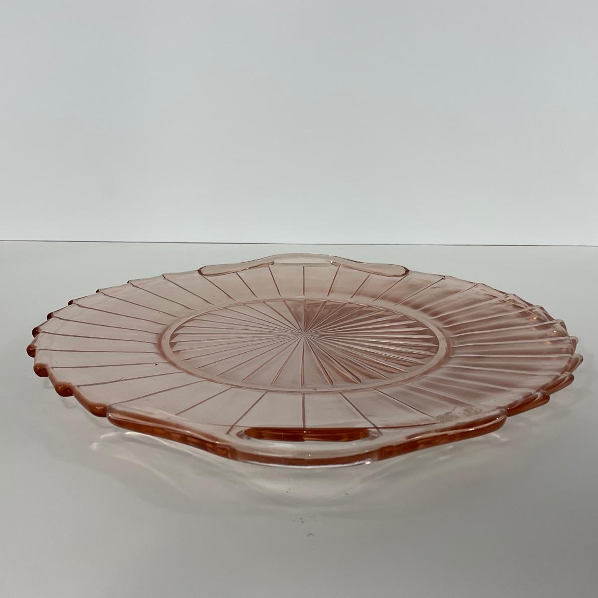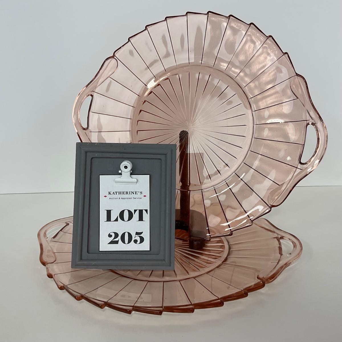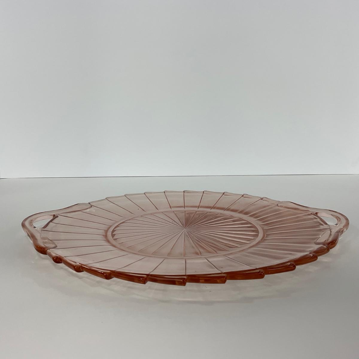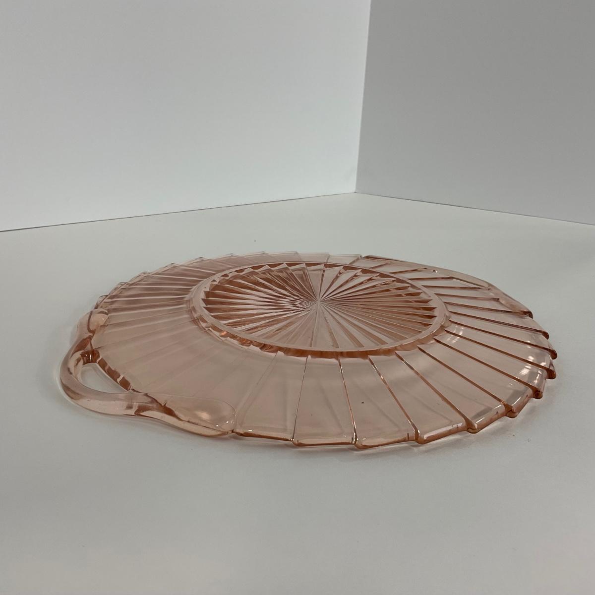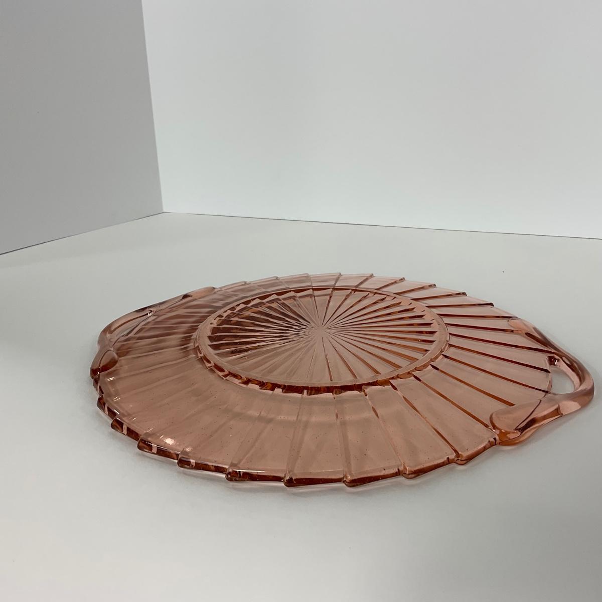 Two pink depression glass Sierra Pinwheel Jeanette Glass Co. (1931-1933) handled tray. Please see photos for details and condition. ::: Shipping is available on this lot. If you require shipping you must let us know at the close of the auction. We will coordinate with you after the item has been won. Shipping fees will include insurance up to or exceeding the value of all items being mailed. If you have any questions regarding this lot please contact the auctioneer either via this website, by direct email or by phone. PICK UP TIMES and other important information can be found in the TERMS and DESCRIPTION of the auction. Please take a look for pertinent information. Thanks!