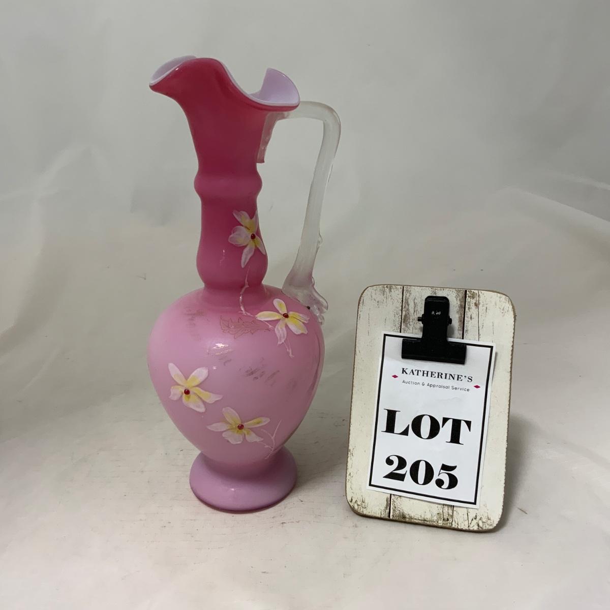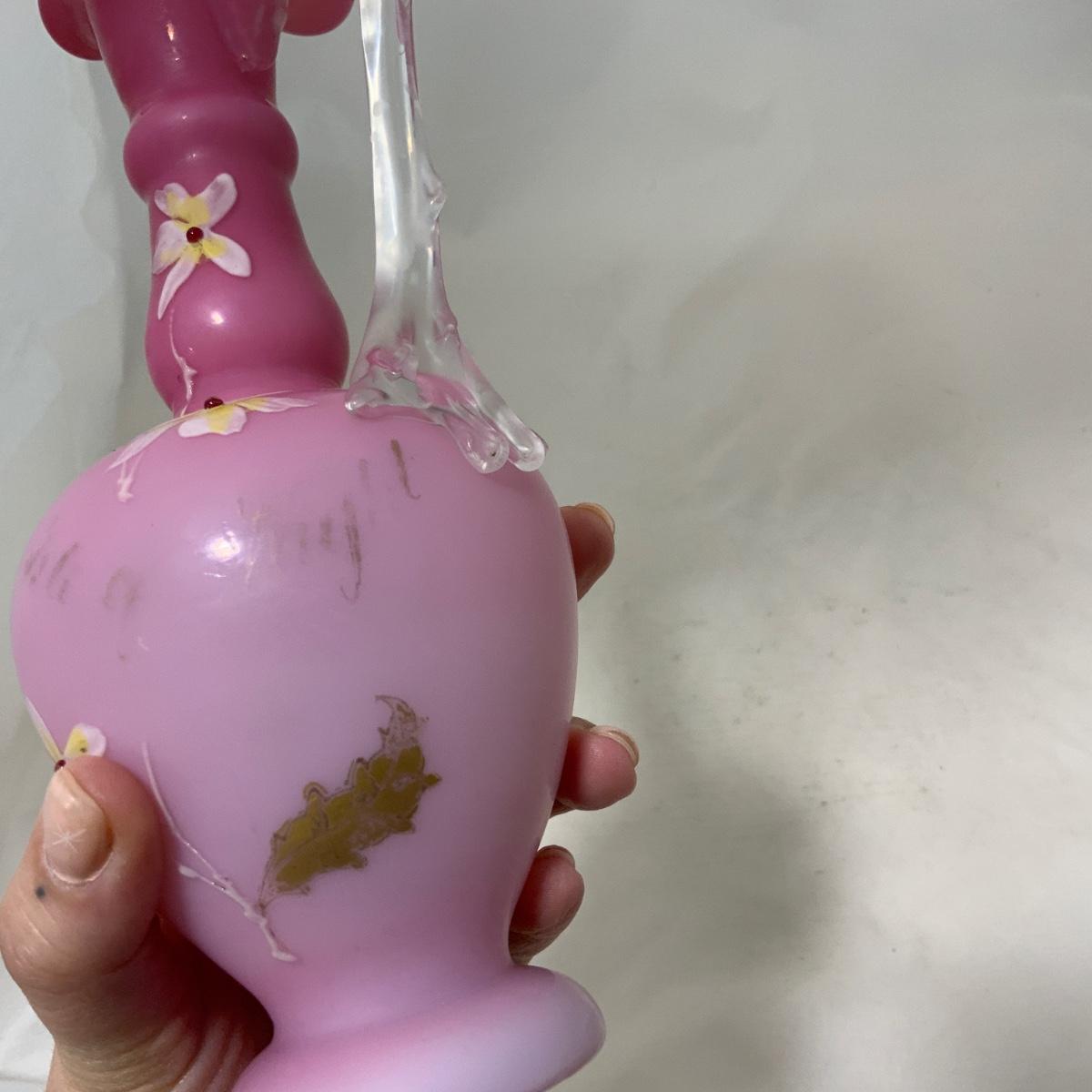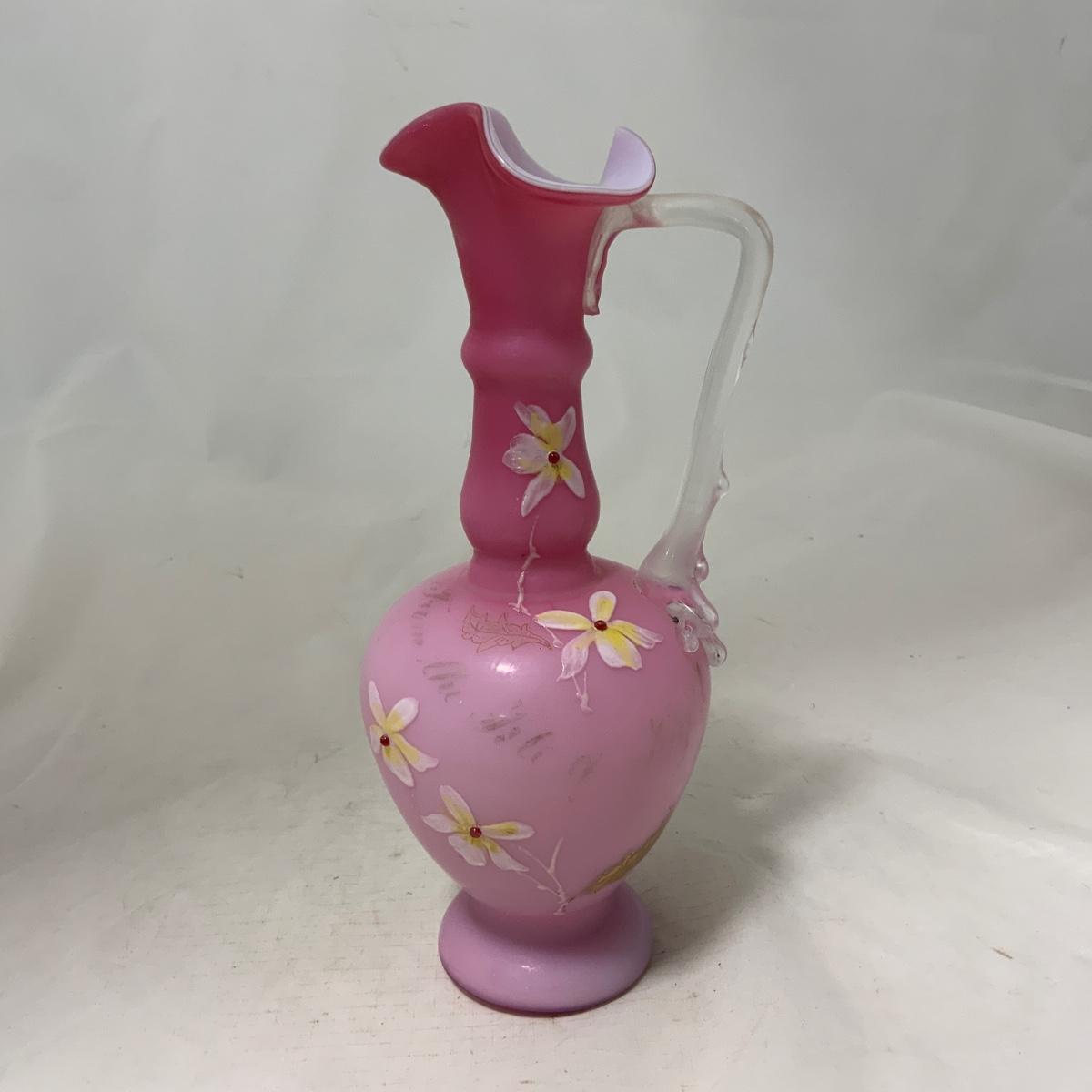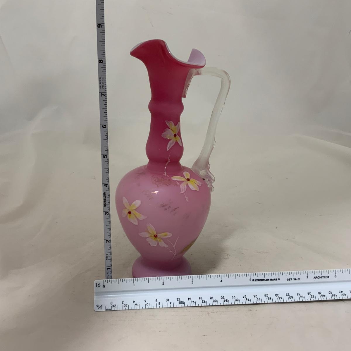 Beautiful Hand Painted Pink Satin Glass Ewer. Nice twisted handle. No cracks or chips I could find, but there are some cleanliness issues that may not come back to perfection. Please see photos for details and condition. ::: Shipping is NOT available on this lot. If you have any questions regarding this lot please contact the auctioneer either via this website, by direct email or by phone. PICK UP TIMES and other important information can be found in the TERMS and DESCRIPTION of the auction. Please take a look for pertinent information. Thanks!