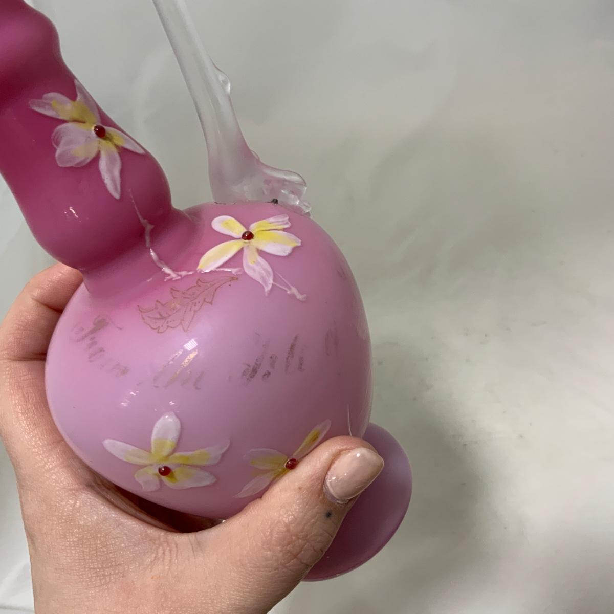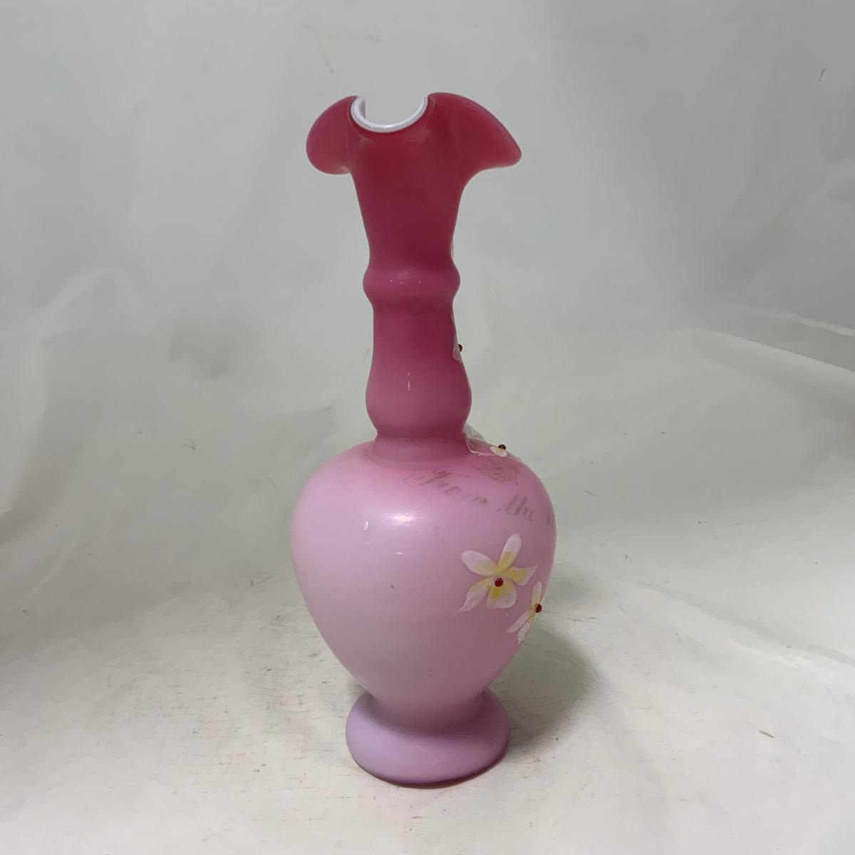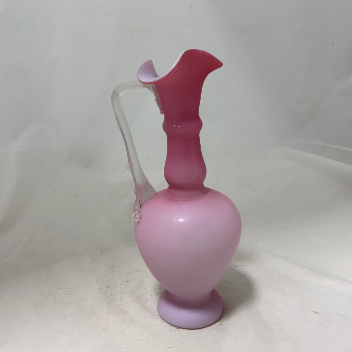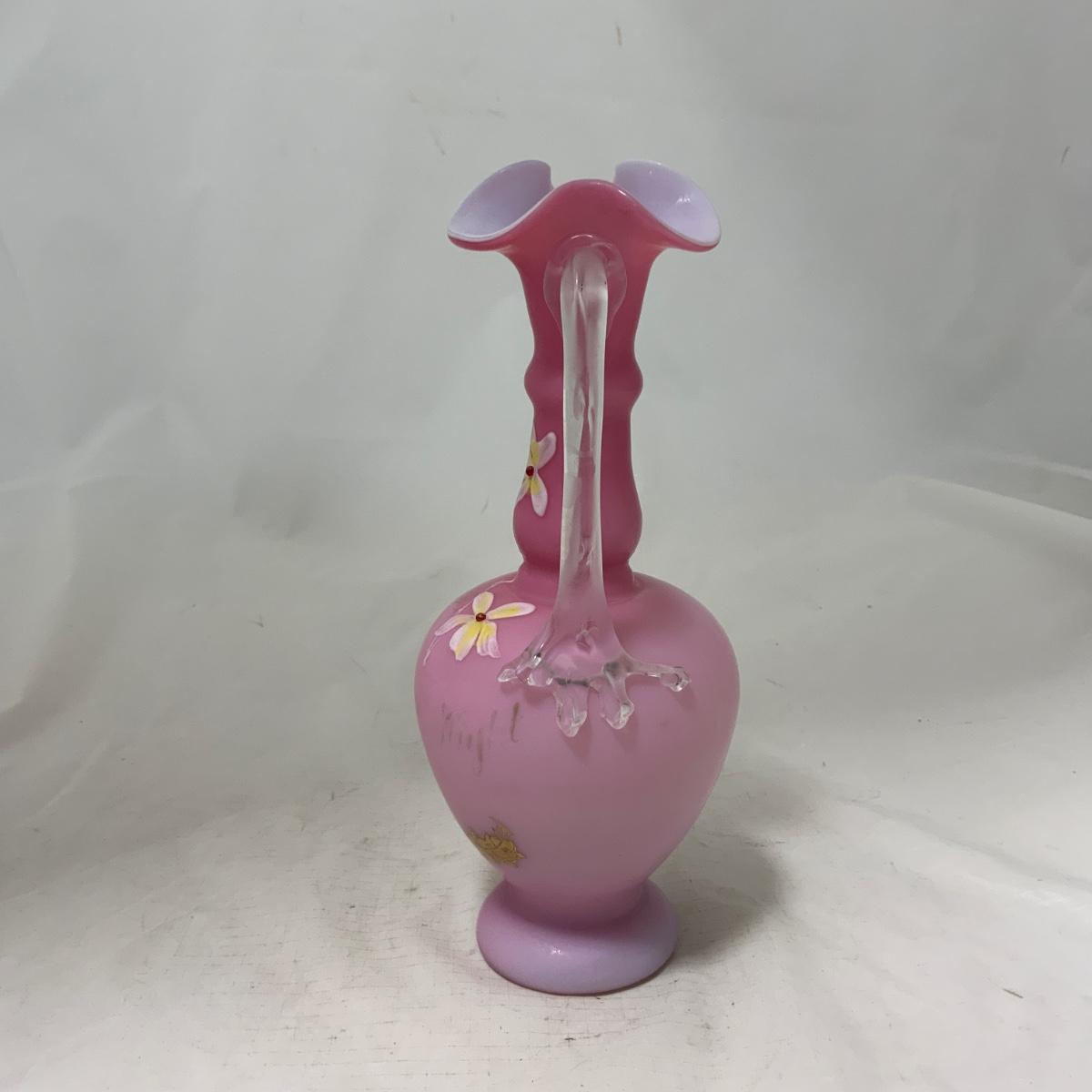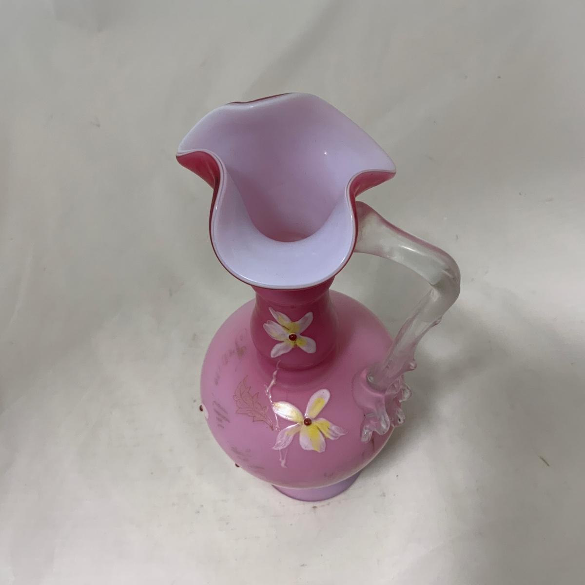 Beautiful Hand Painted Pink Satin Glass Ewer. Nice twisted handle. No cracks or chips I could find, but there are some cleanliness issues that may not come back to perfection. Please see photos for details and condition. ::: Shipping is NOT available on this lot. If you have any questions regarding this lot please contact the auctioneer either via this website, by direct email or by phone. PICK UP TIMES and other important information can be found in the TERMS and DESCRIPTION of the auction. Please take a look for pertinent information. Thanks!